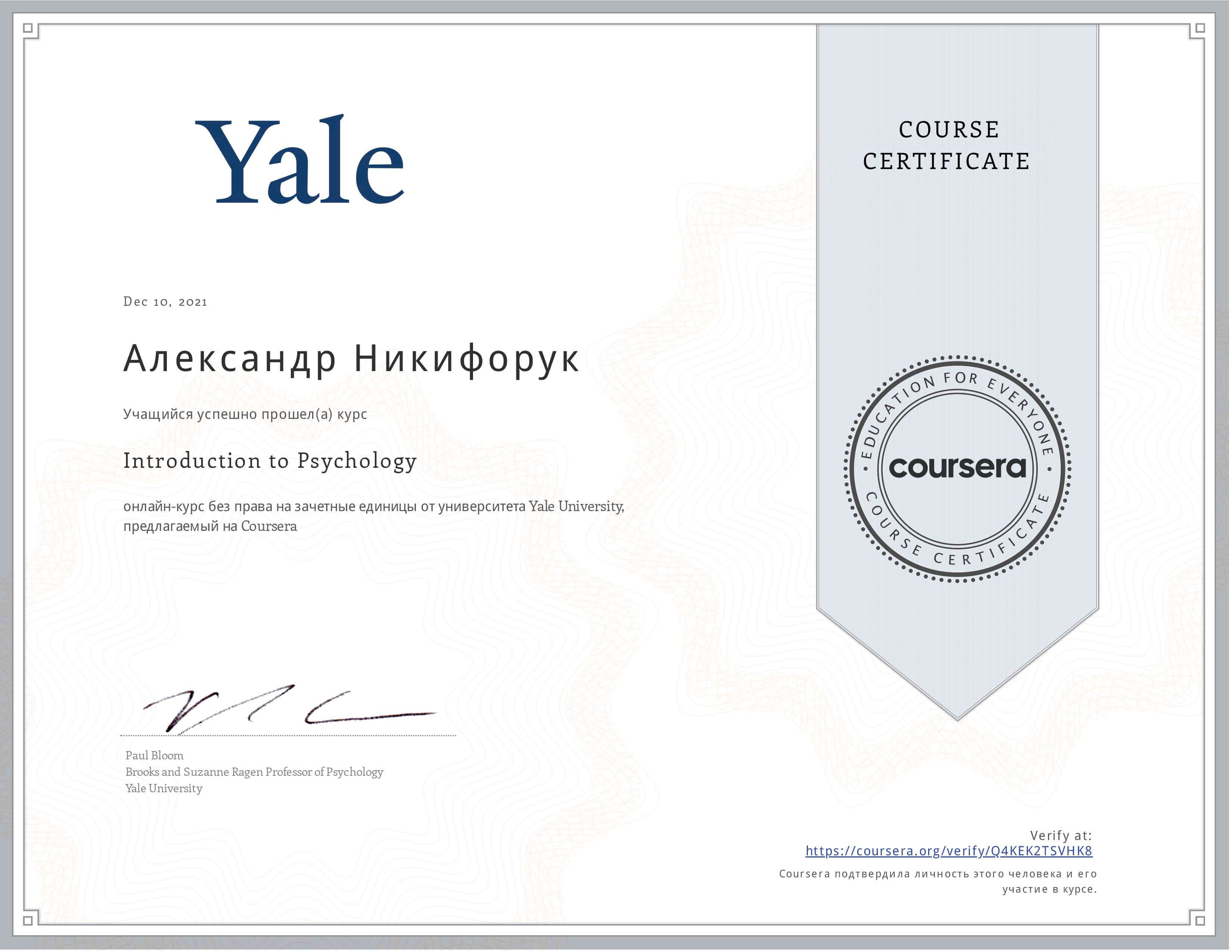 13. 2021 Прохождение курса по психологии (Introduction of Psychology) в Yale University