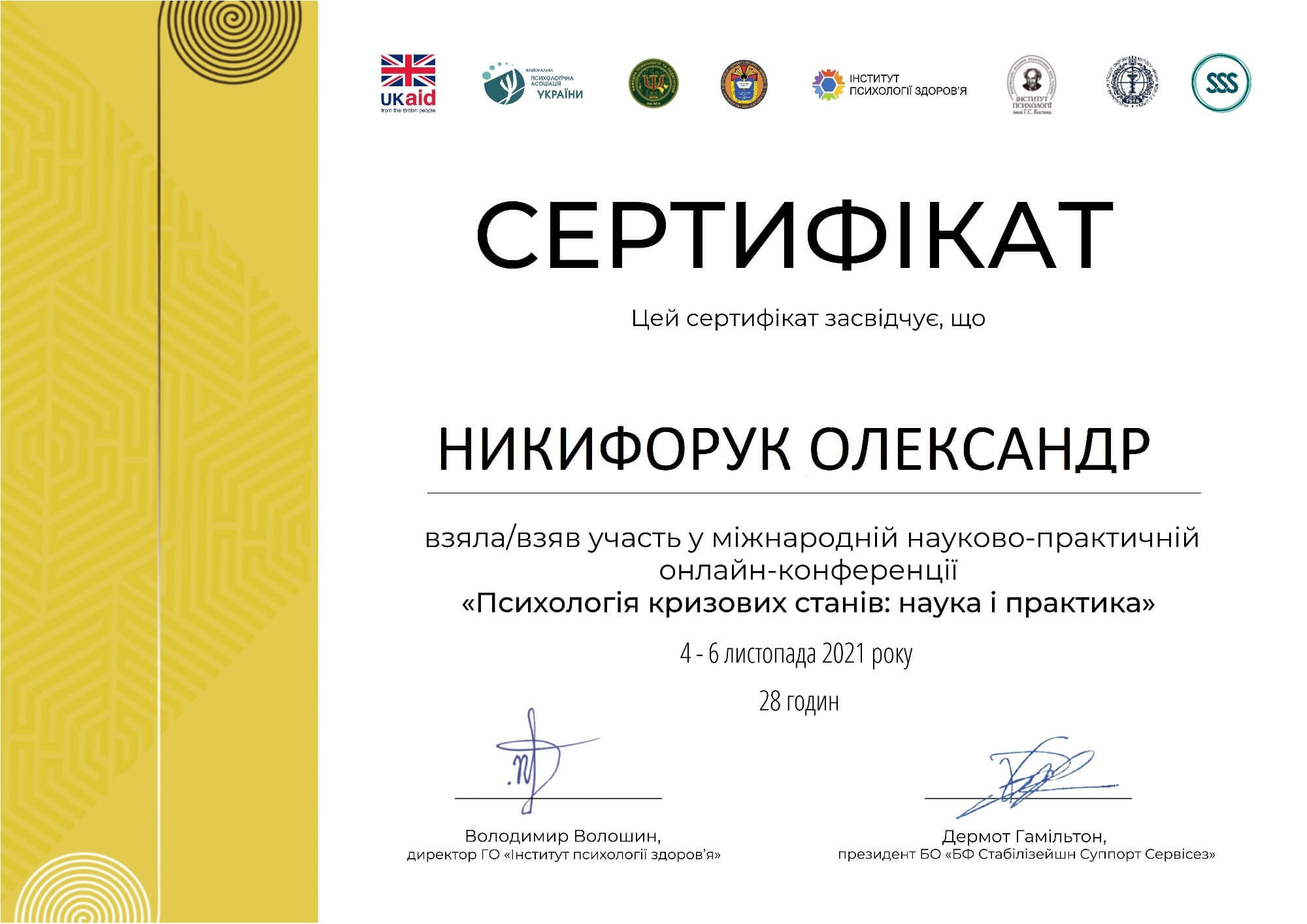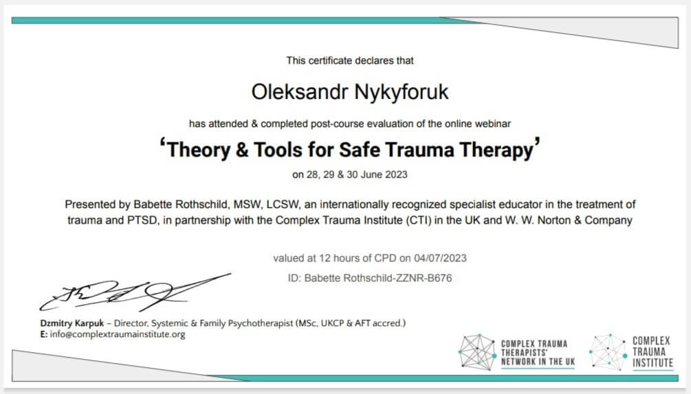 3. В 2019 году окончил курс по повышению квалификации в Киевском институте современной психологии и психотерапии (КИСПП) – специализация сексологии. Являюсь членом Секции сексологии и терапии сексуальных расстройств Союза психологов и психотерапевтов Украины.