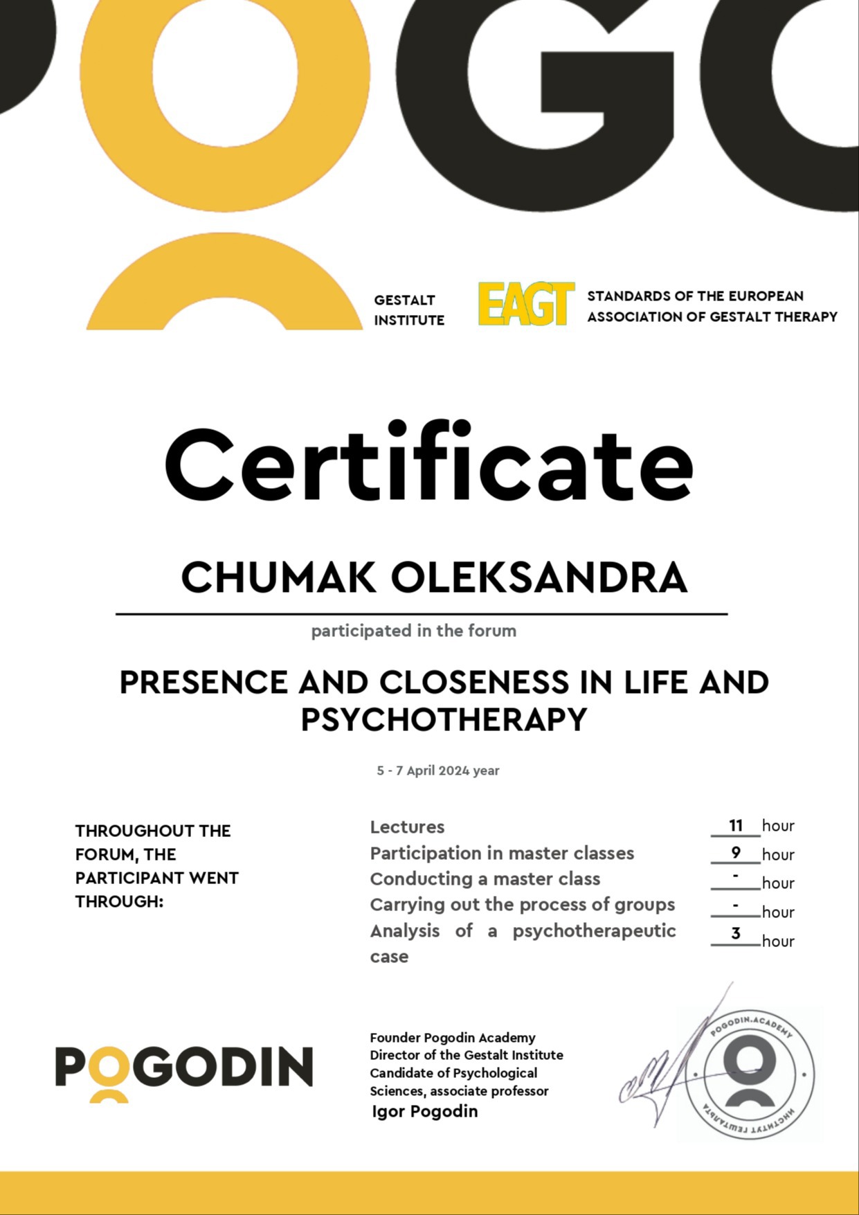 4) Имею сертификат по специализации "Работа с кризисами и травмами в гештальт-подходе" Pogodin Academy