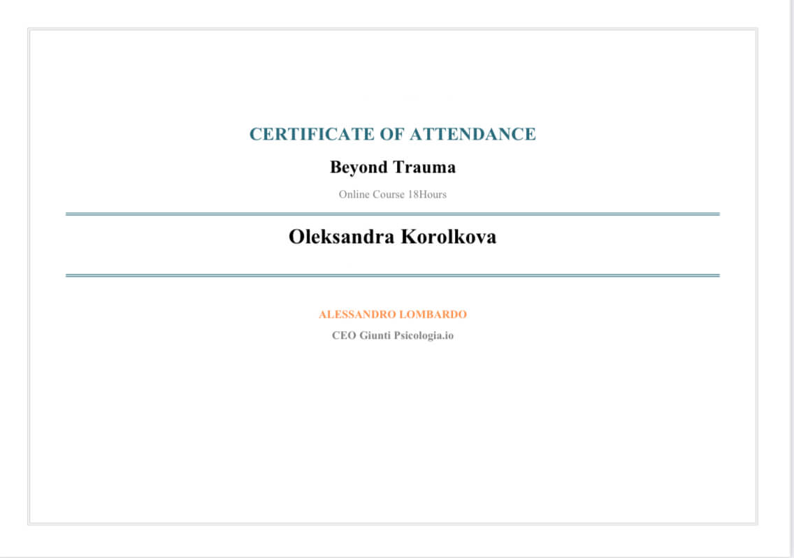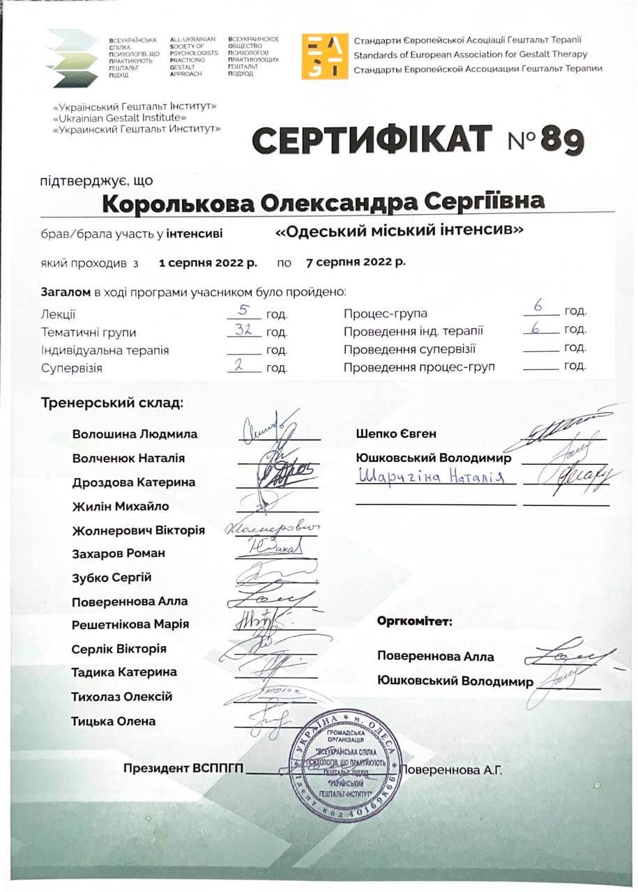 Сейчас учусь на Второй ступени во Всеукраинском союзе психологов, практикующих гештальтный подход.