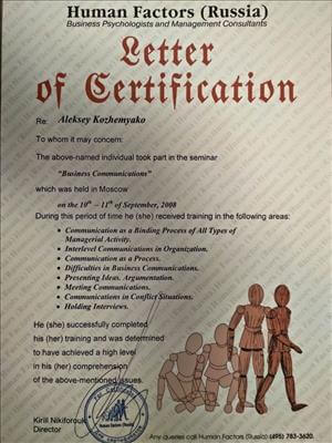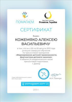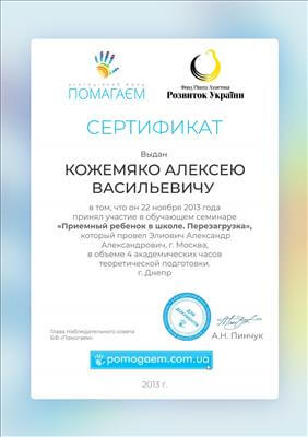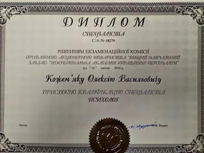 2013 – 2016 Международная академия управления персоналом (МАУП). Специализация – психология. Диплом С16№18279.