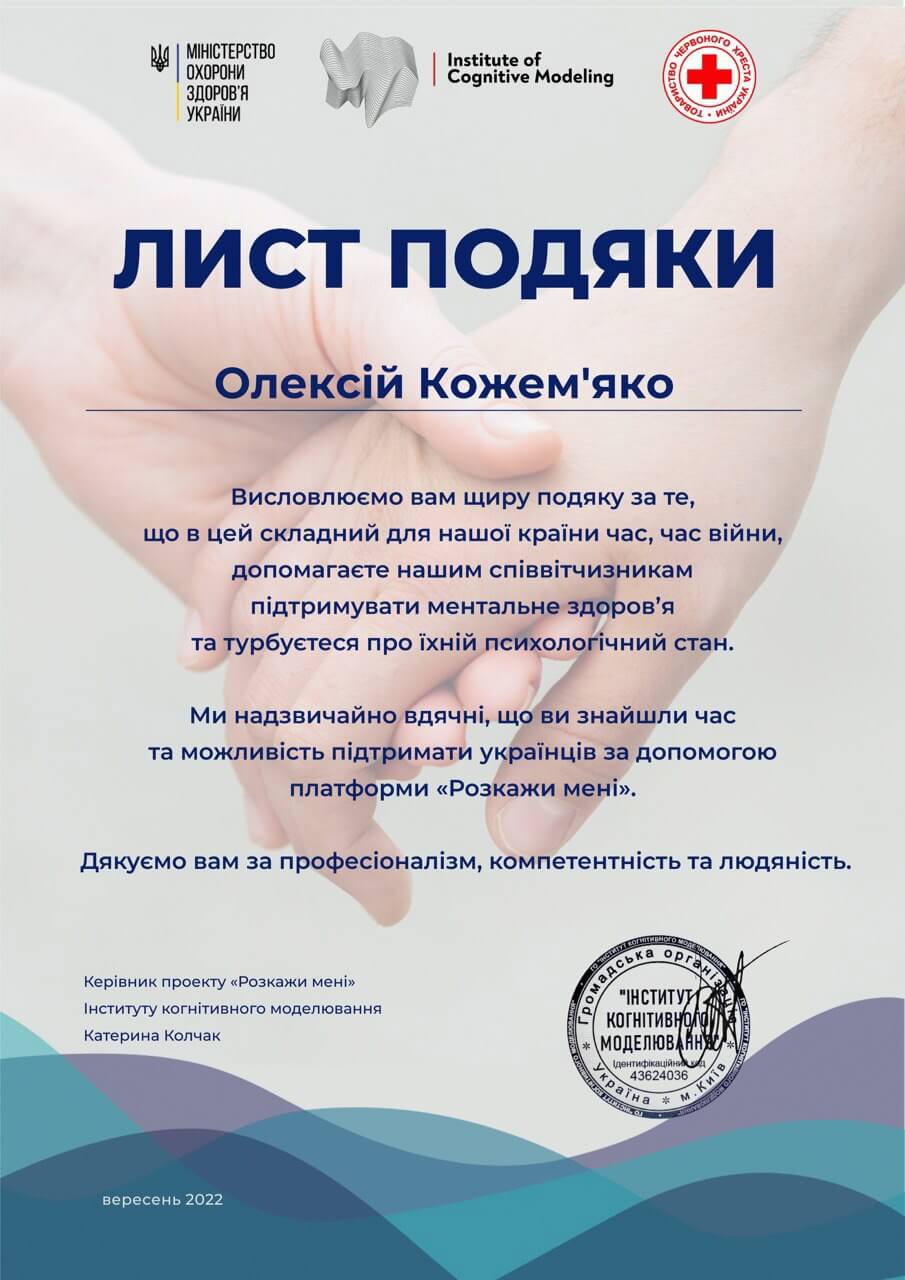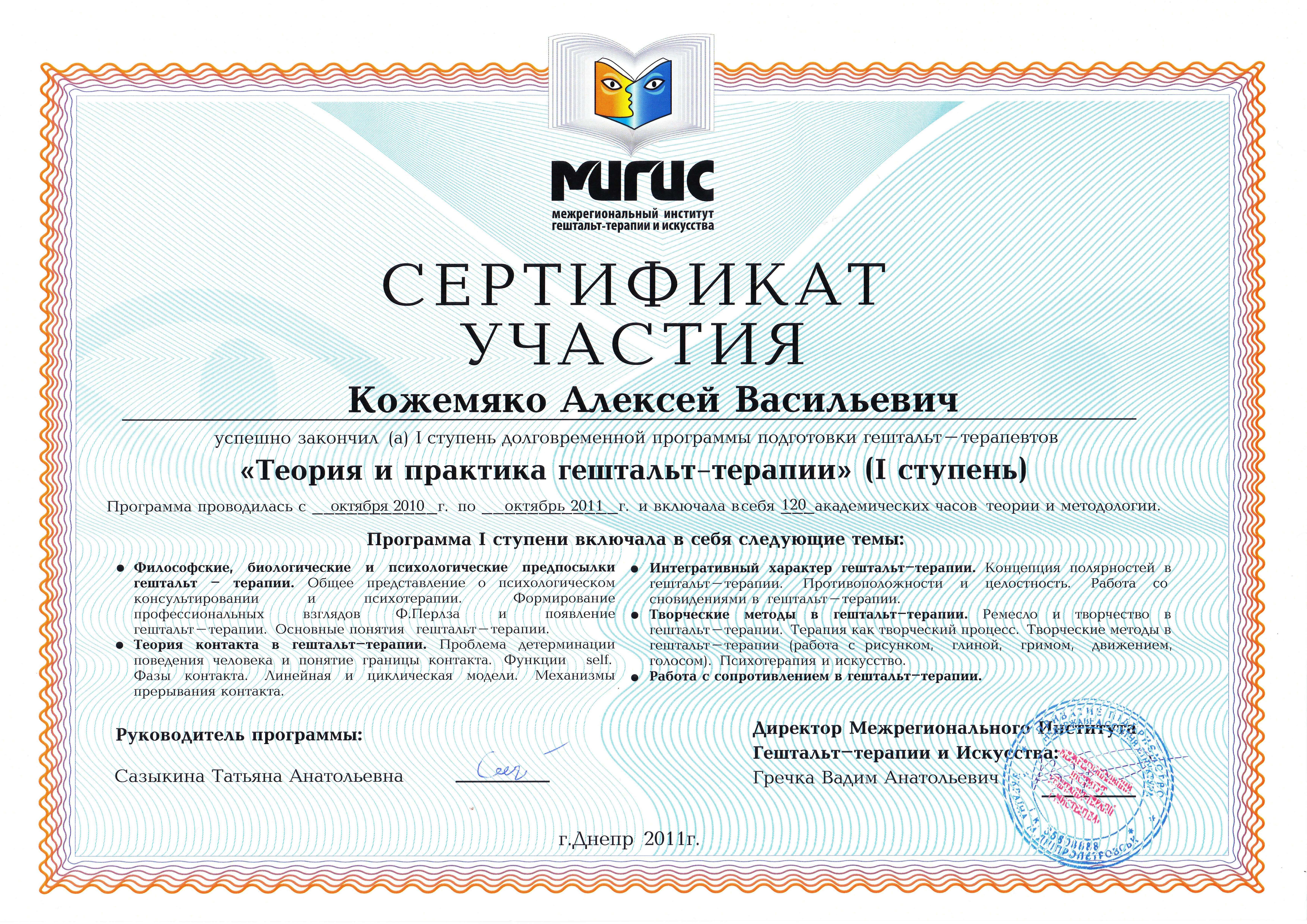 2010 – 2014 Межрегиональный институт гештальт-терапии и искусства (МИГиС), «Теория и практика гештальт-терапии». Сертификат ІІ-СДН-0110-5.