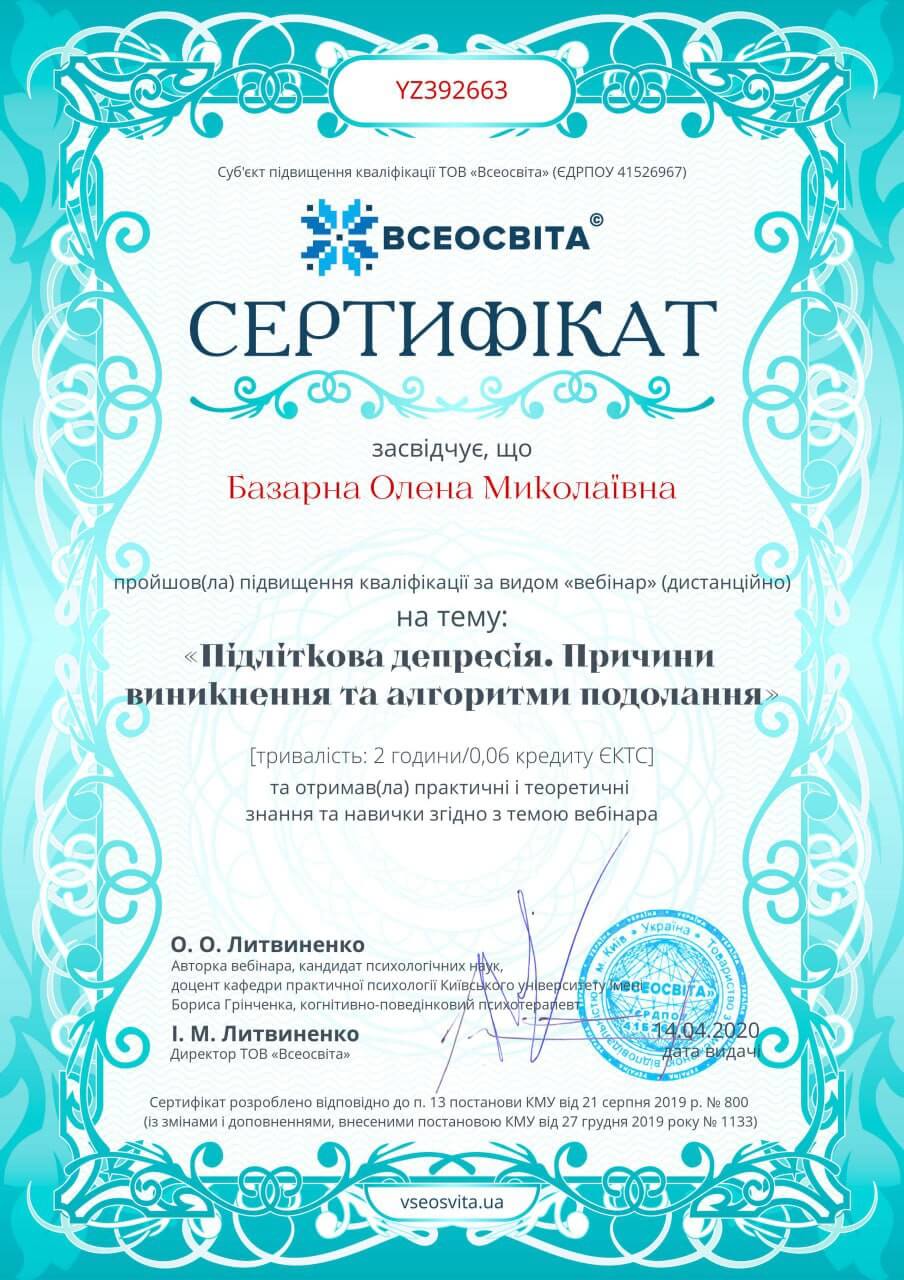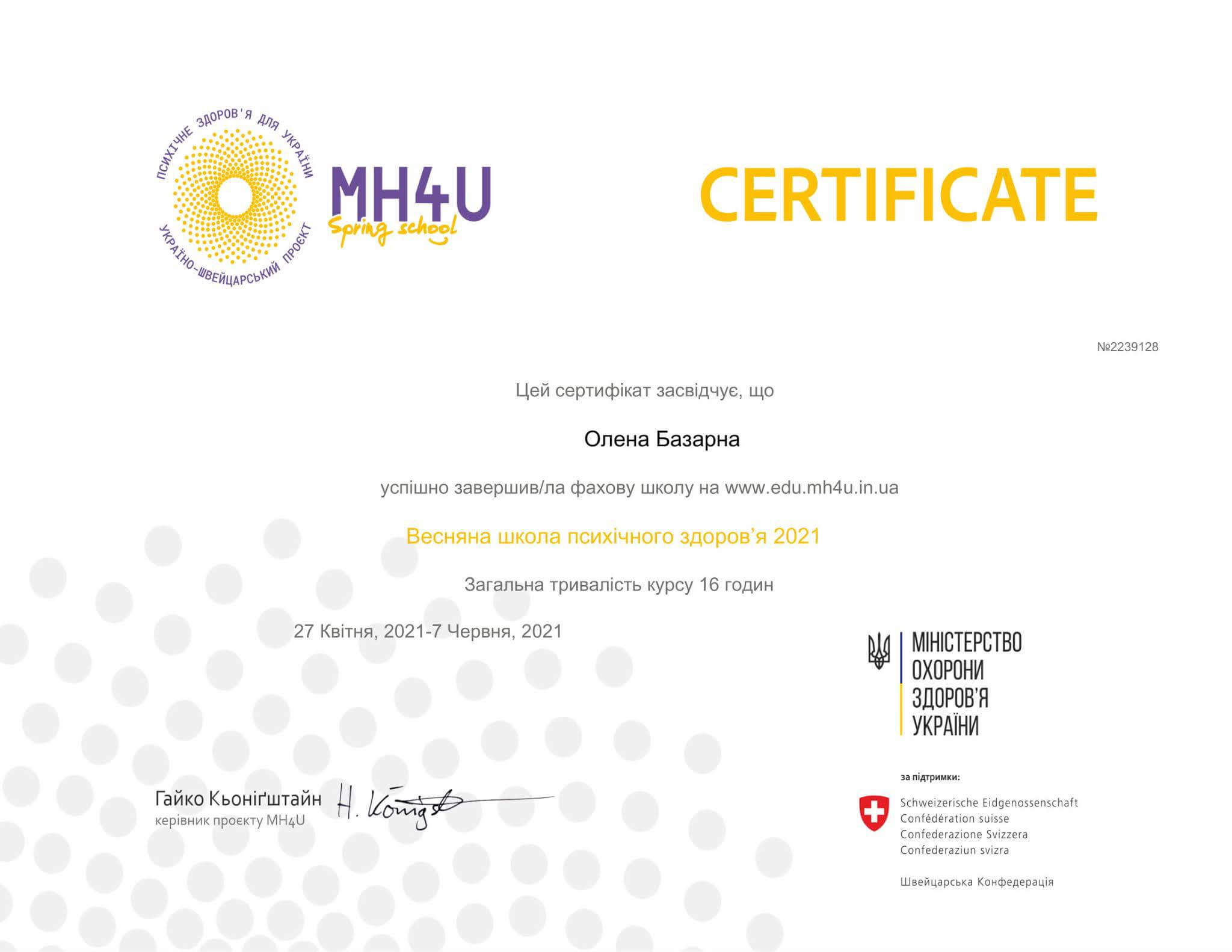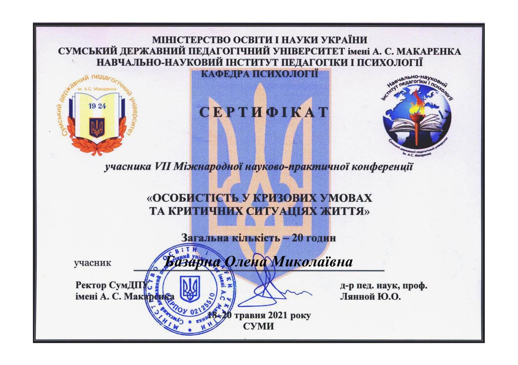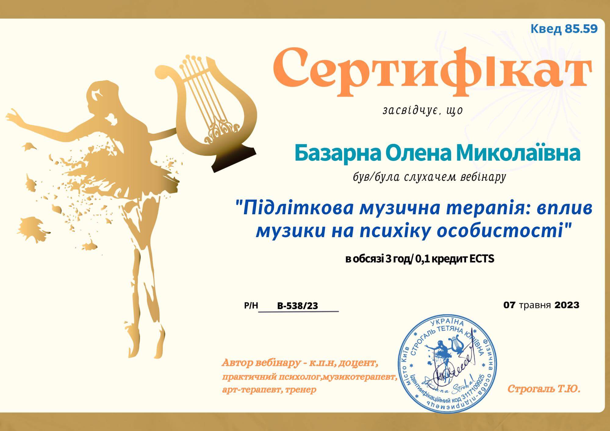 В 2021 году прошла курсы по музыкотерапии и регулярно посещаю вебинары по этому направлению на базе Национального педагогического университета им. М.П.Драгоманова. С 2022 года обучаюсь на 2 ступени гештальта терапии в Харьковском институте гештальта терапии, в рамках обучения прошла более 50 часов личной терапии, регулярно участвую в супервизионных группах.