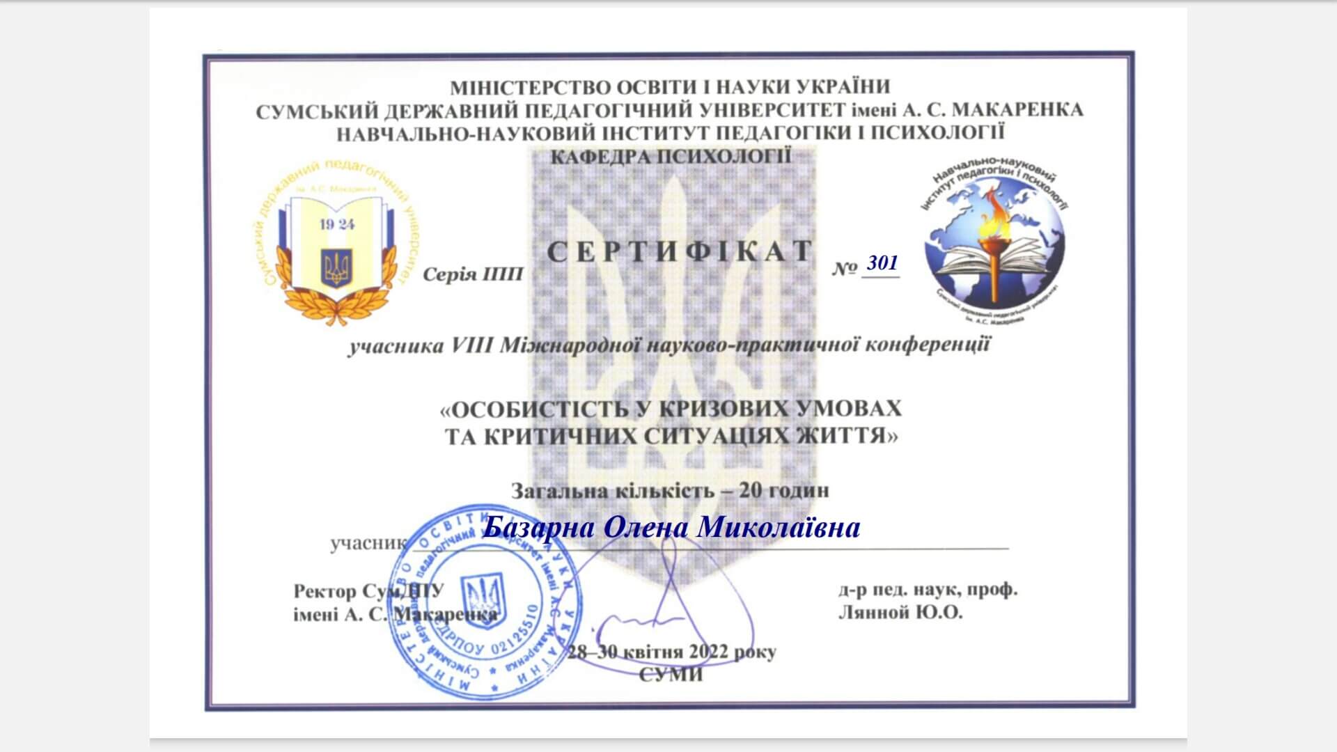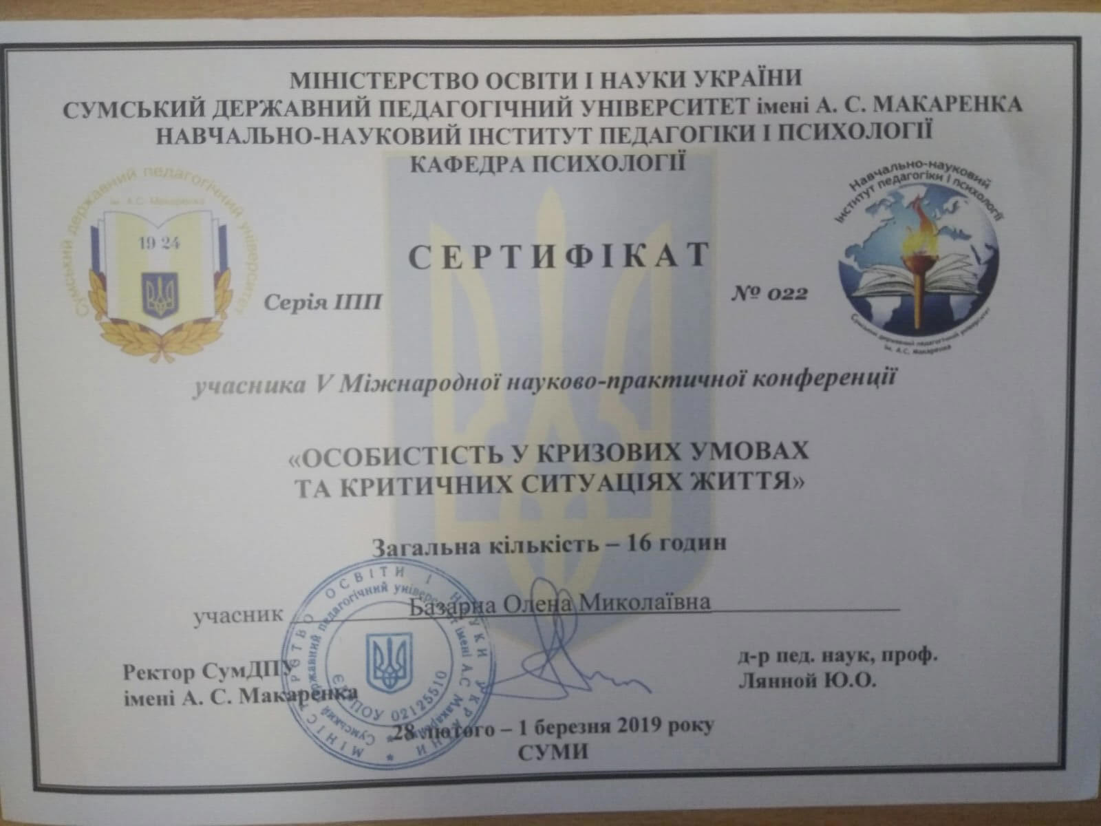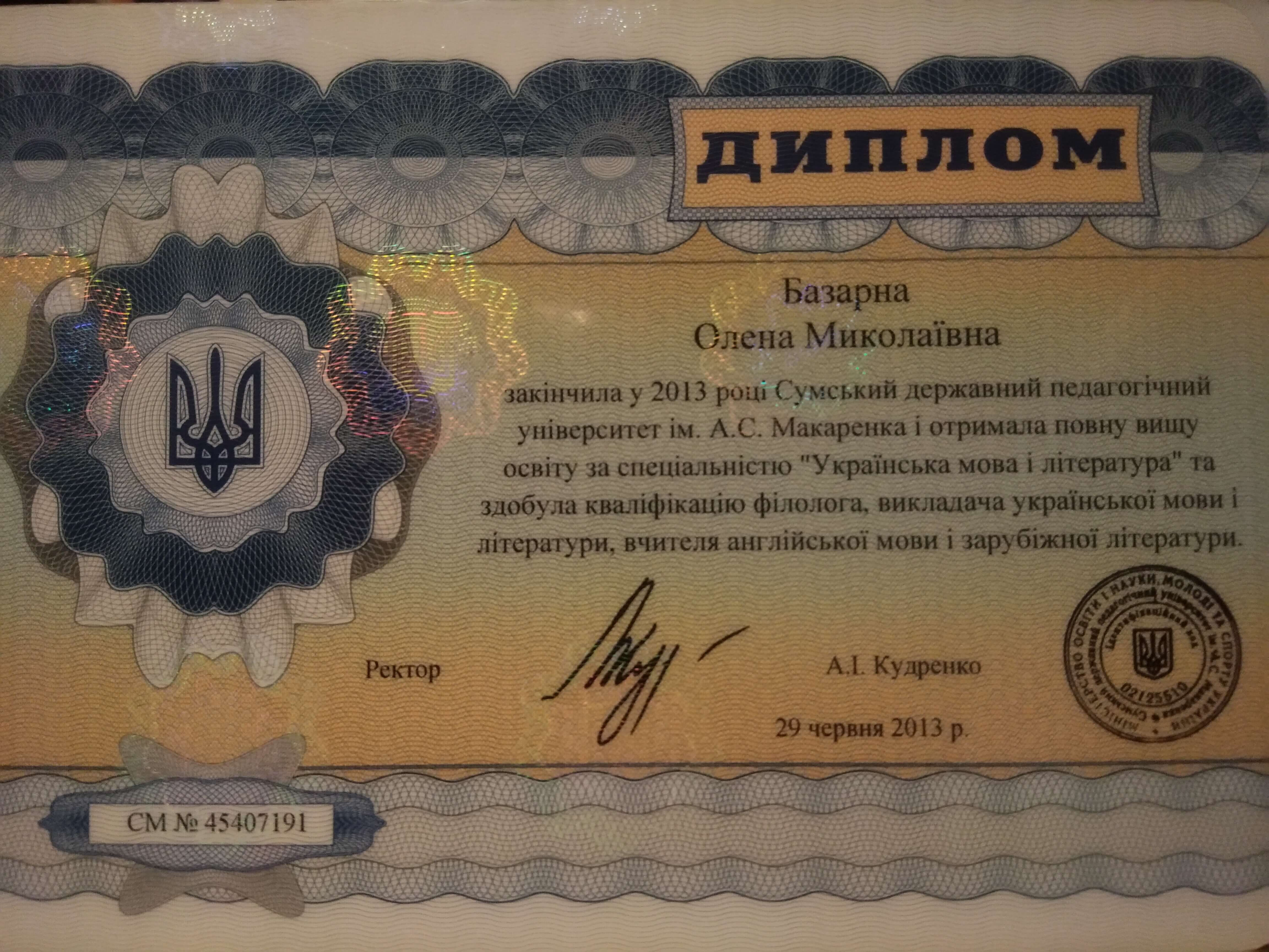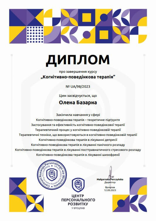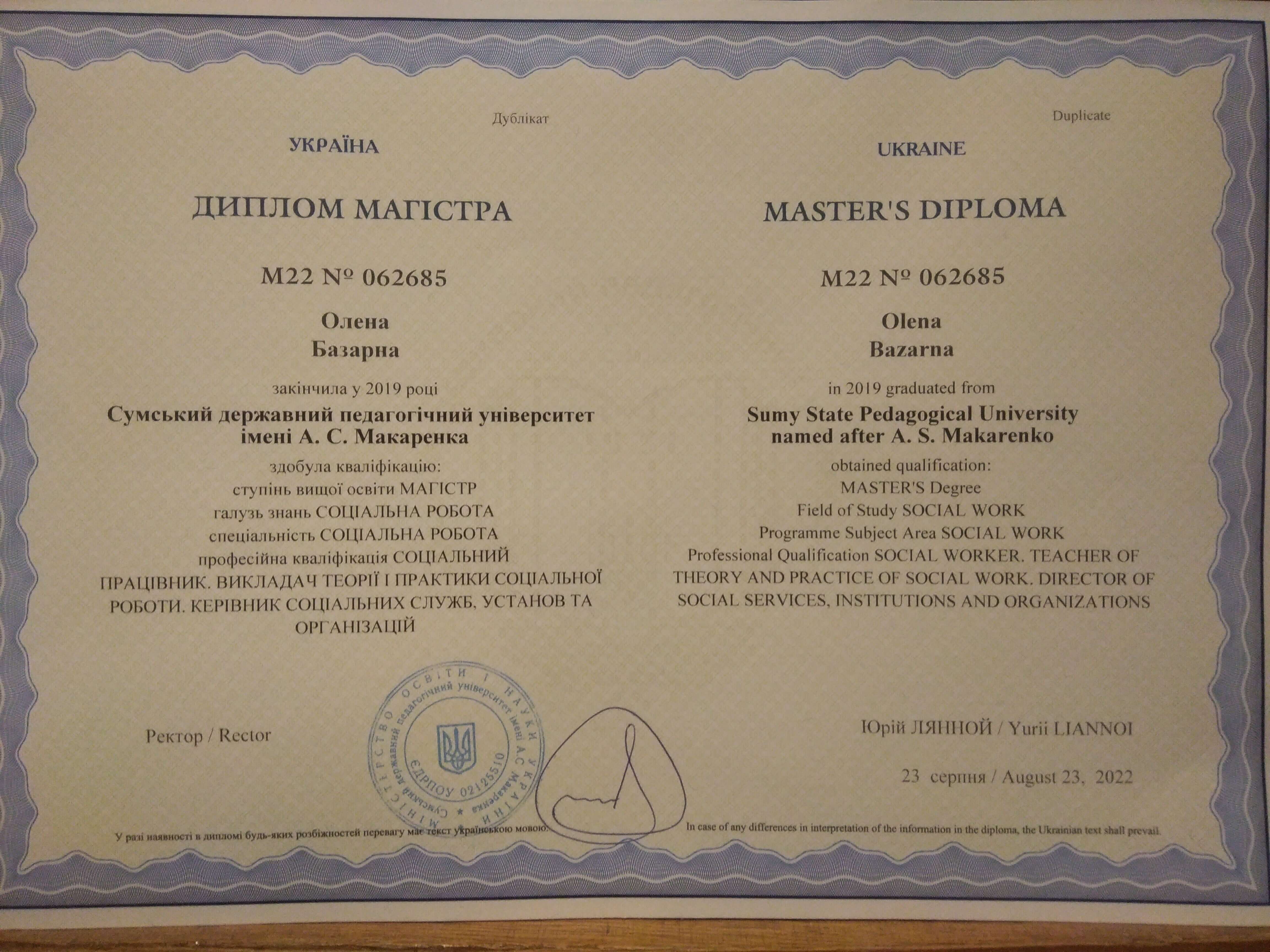 Сейчас учусь третий раз в СумГПУ им. А.С.Макаренко по специальности 053 "Психология", уже имею дипломы магистра по специальностям "Украинский язык и литература" (2013) и "Социальная работа" (2019). В 2021 году прошла курсы по музыкотерапии и регулярно посещаю вебинары по этому направлению на базе Национального педагогического университета им. М.П.Драгоманова. С 2022 года обучаюсь на 2 ступени гештальта терапии в Харьковском институте гештальта терапии, в рамках обучения прошла более 50 часов личной терапии, регулярно участвую в супервизионных группах.