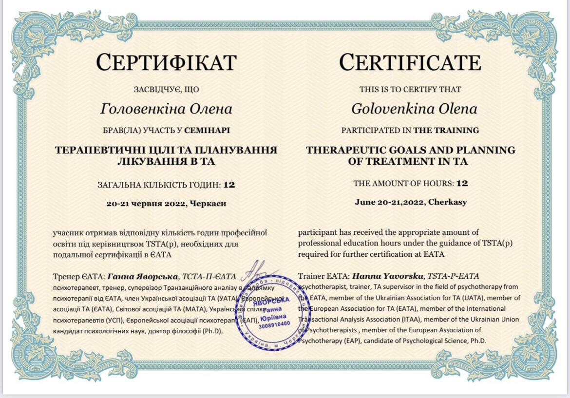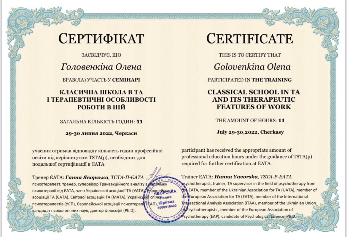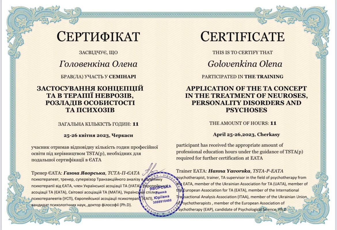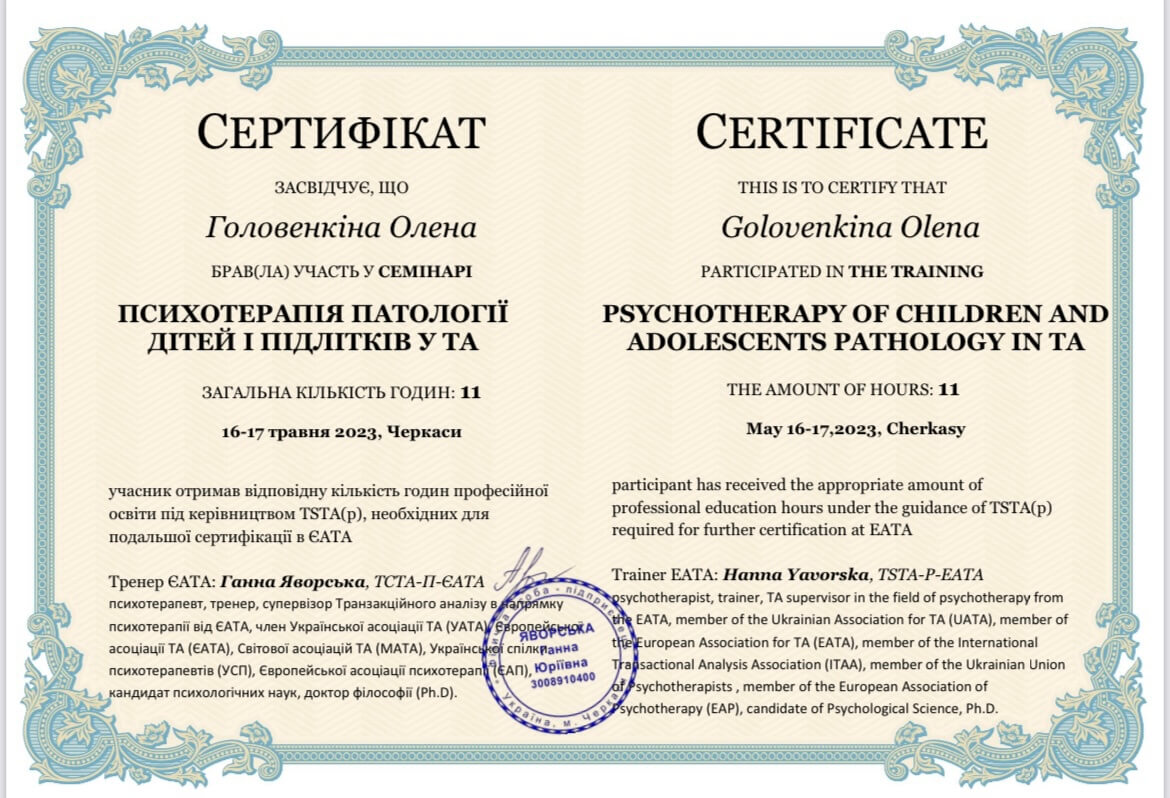 ЧНУ им. Богдана Хмельницкого, ПХПГУ им. Григория Сковороды, магистр психологии. НЛП практик, НЛП мастер, курс по танцевально-двигательной терапии. Сейчас прохожу обучение на 4 курсе в европейском образовательном проекте «Транзактный анализ в психотерапии»
