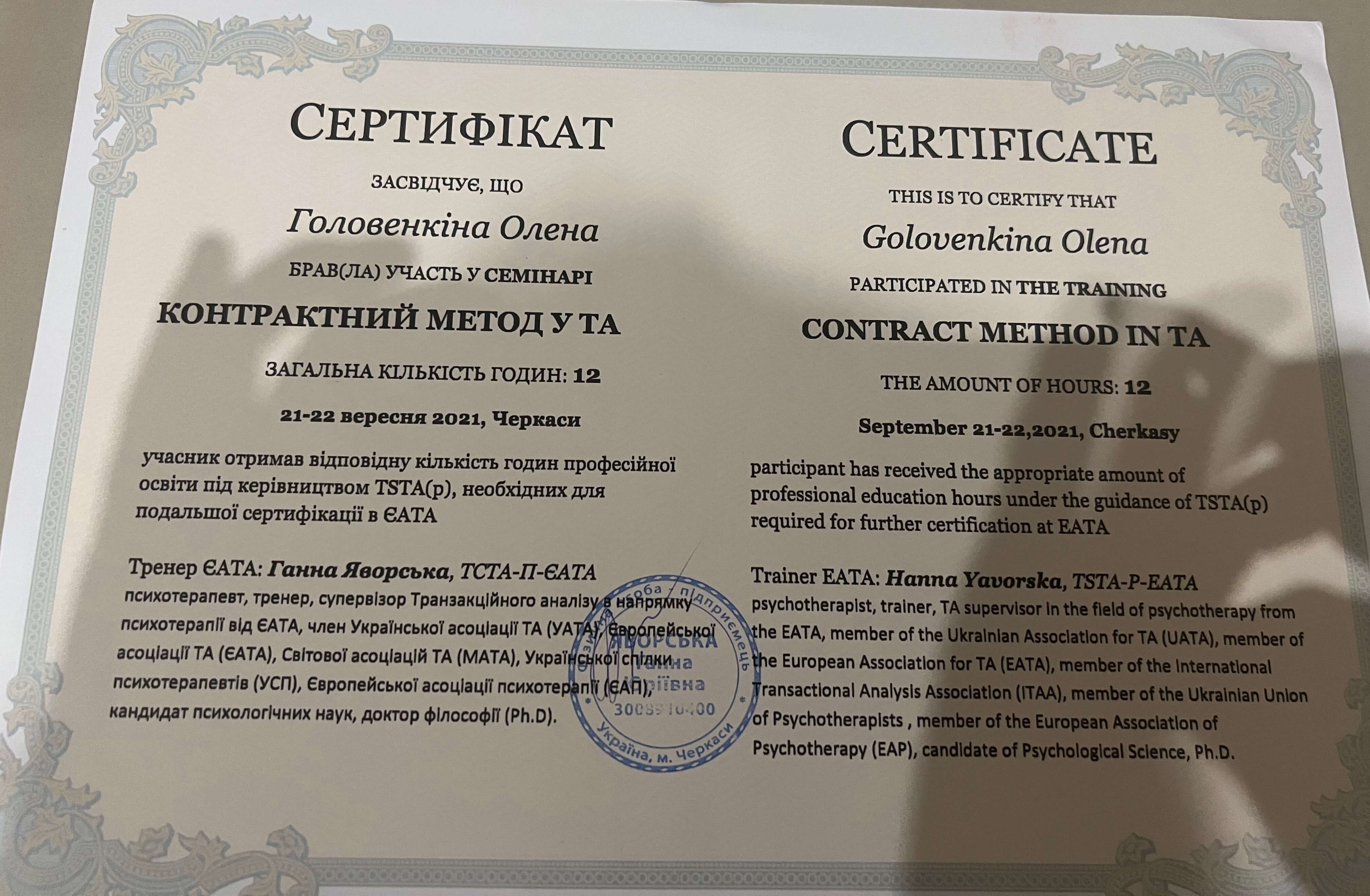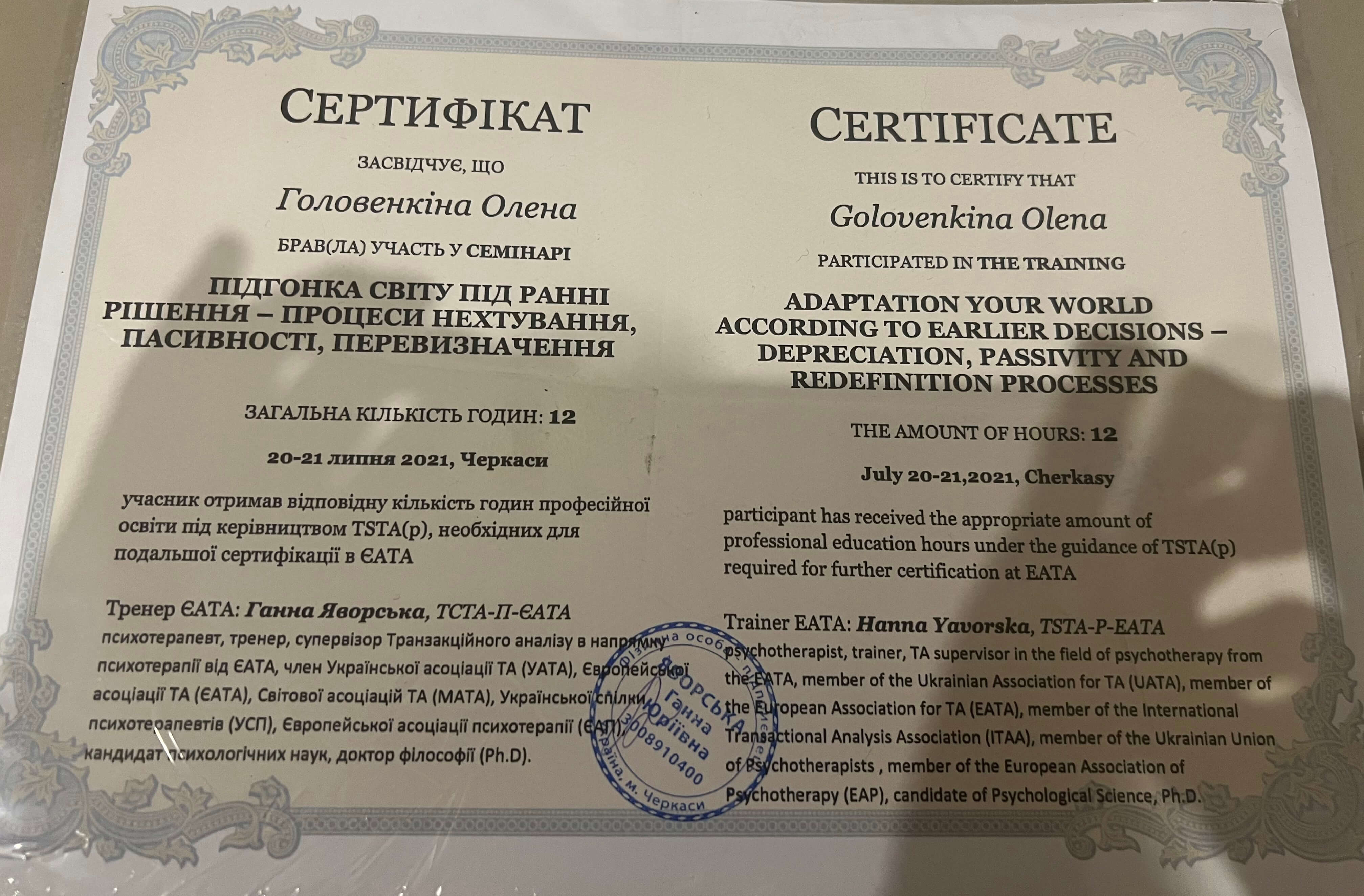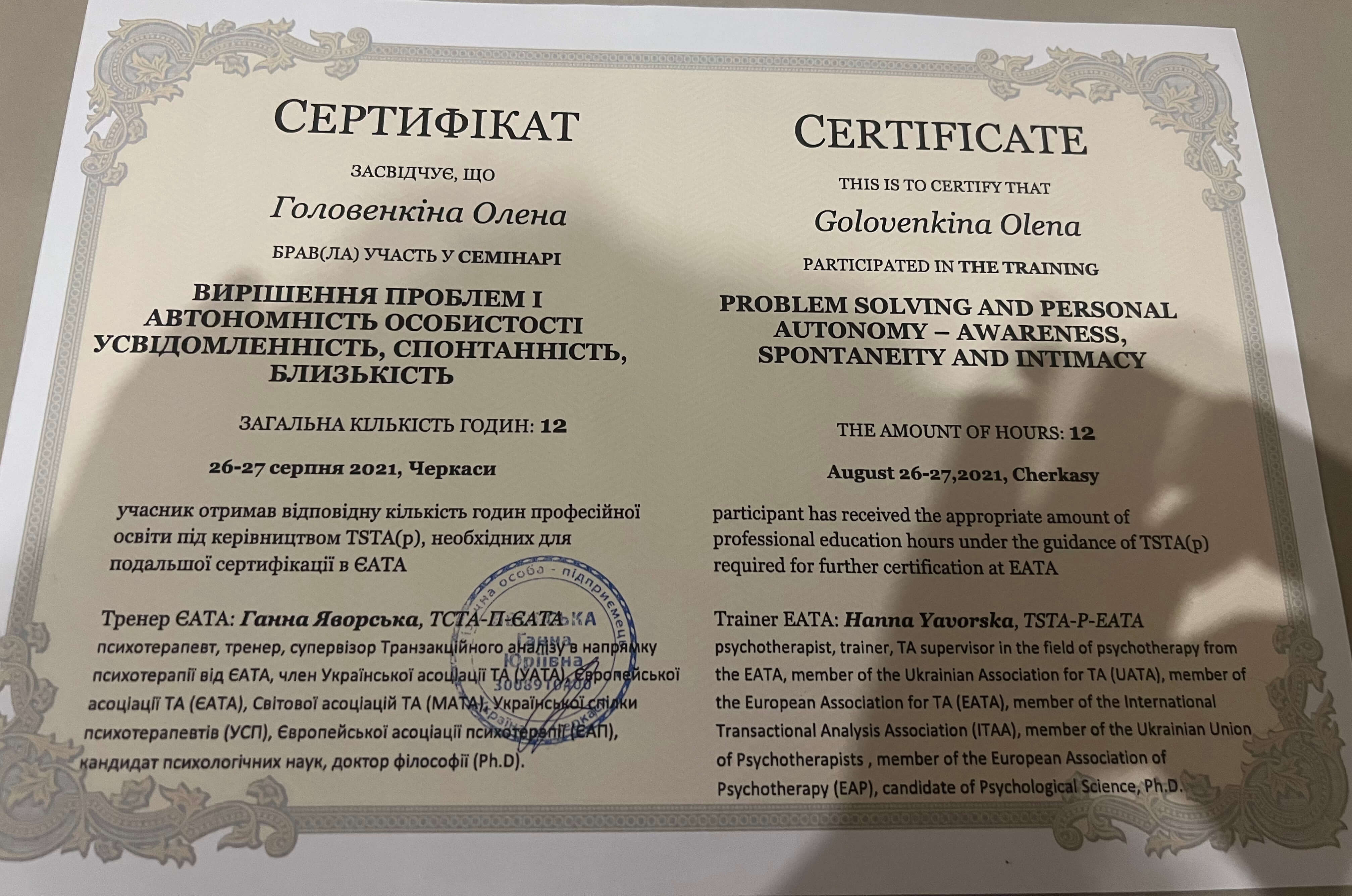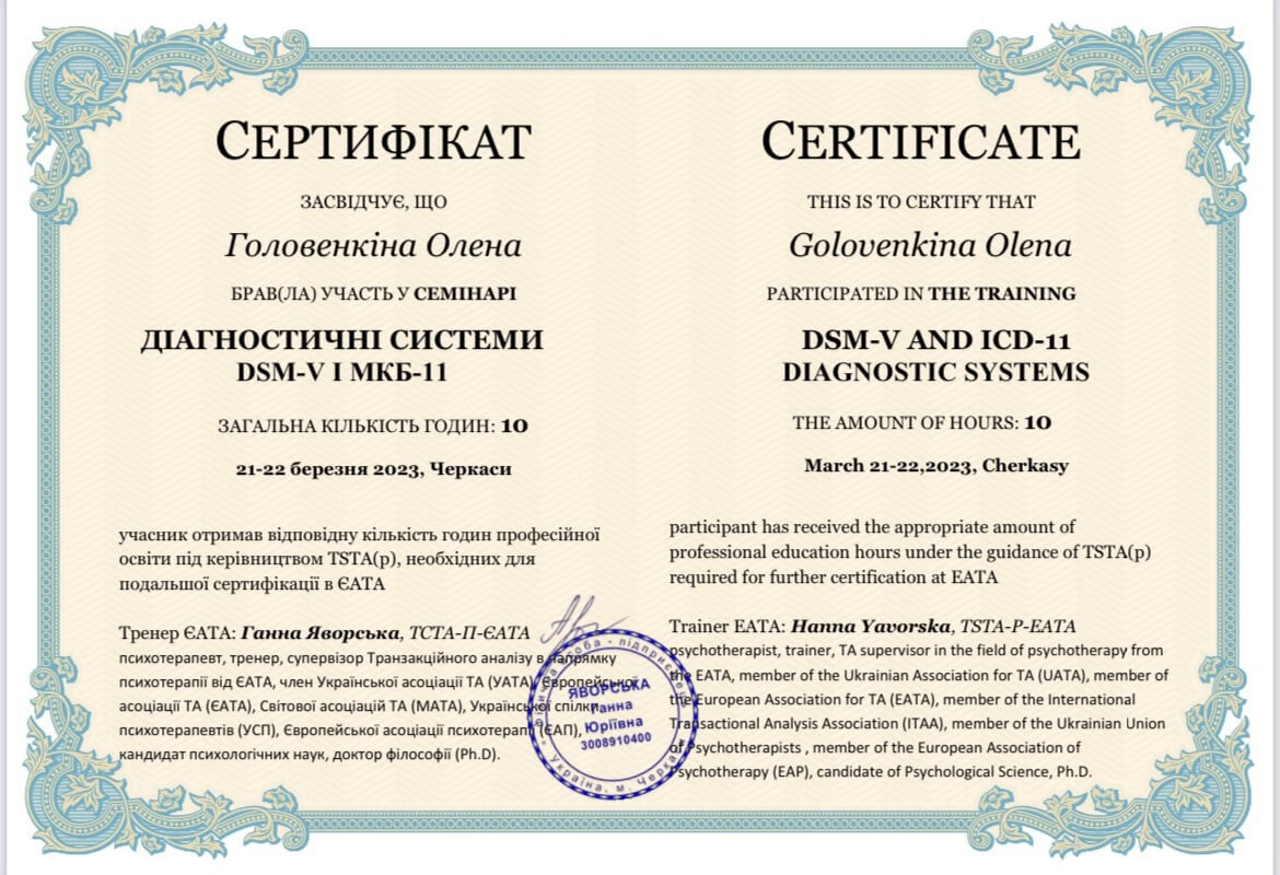 ЧНУ им. Богдана Хмельницкого, ПХПГУ им. Григория Сковороды, магистр психологии. НЛП практик, НЛП мастер, курс по танцевально-двигательной терапии. Сейчас прохожу обучение на 4 курсе в европейском образовательном проекте «Транзактный анализ в психотерапии»
