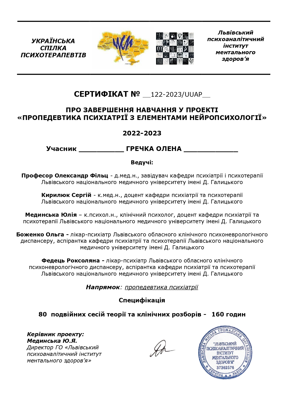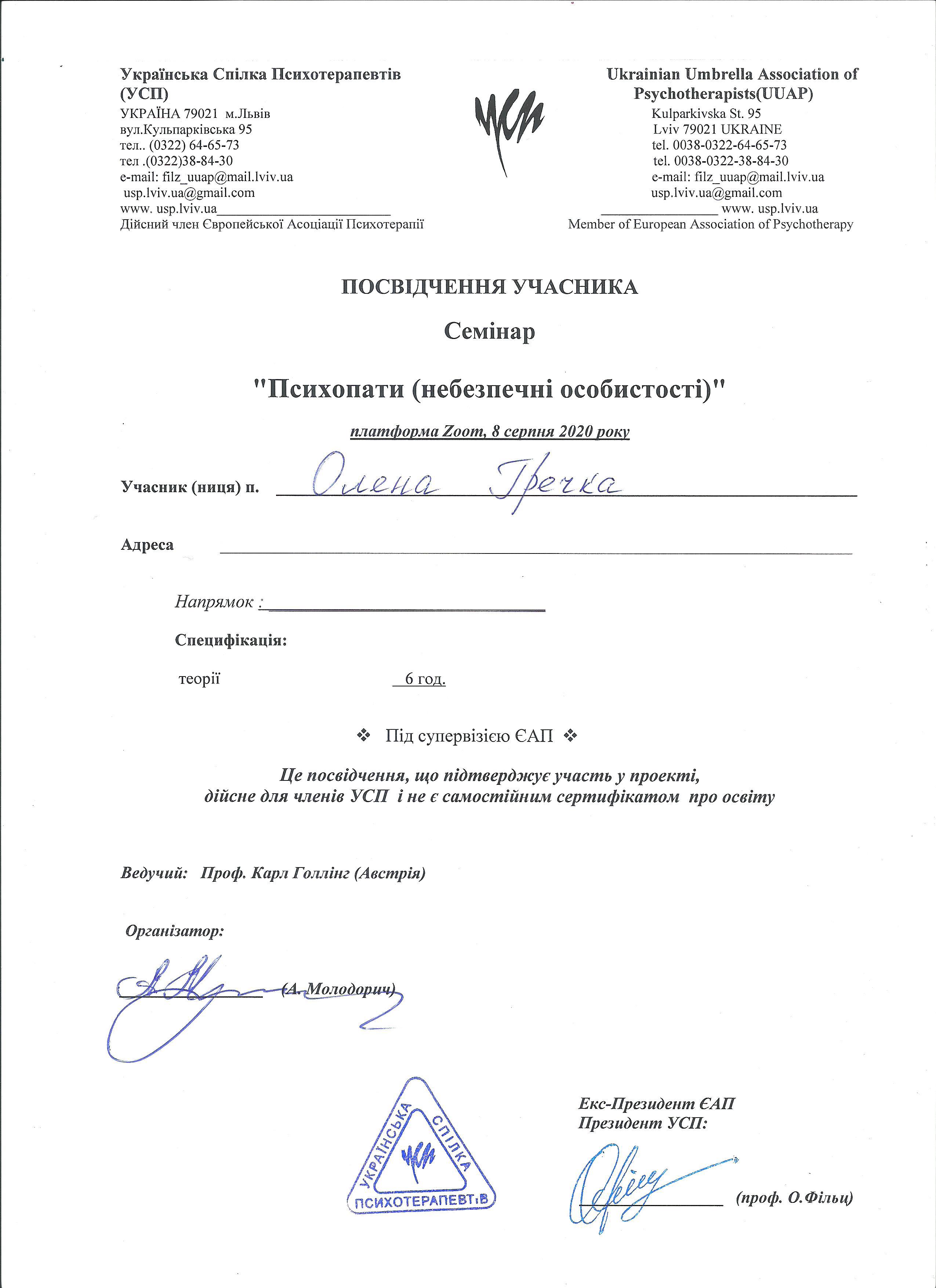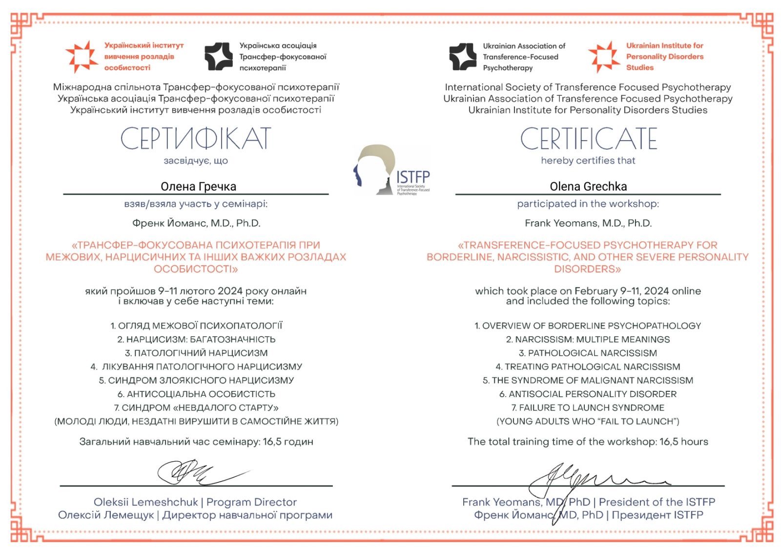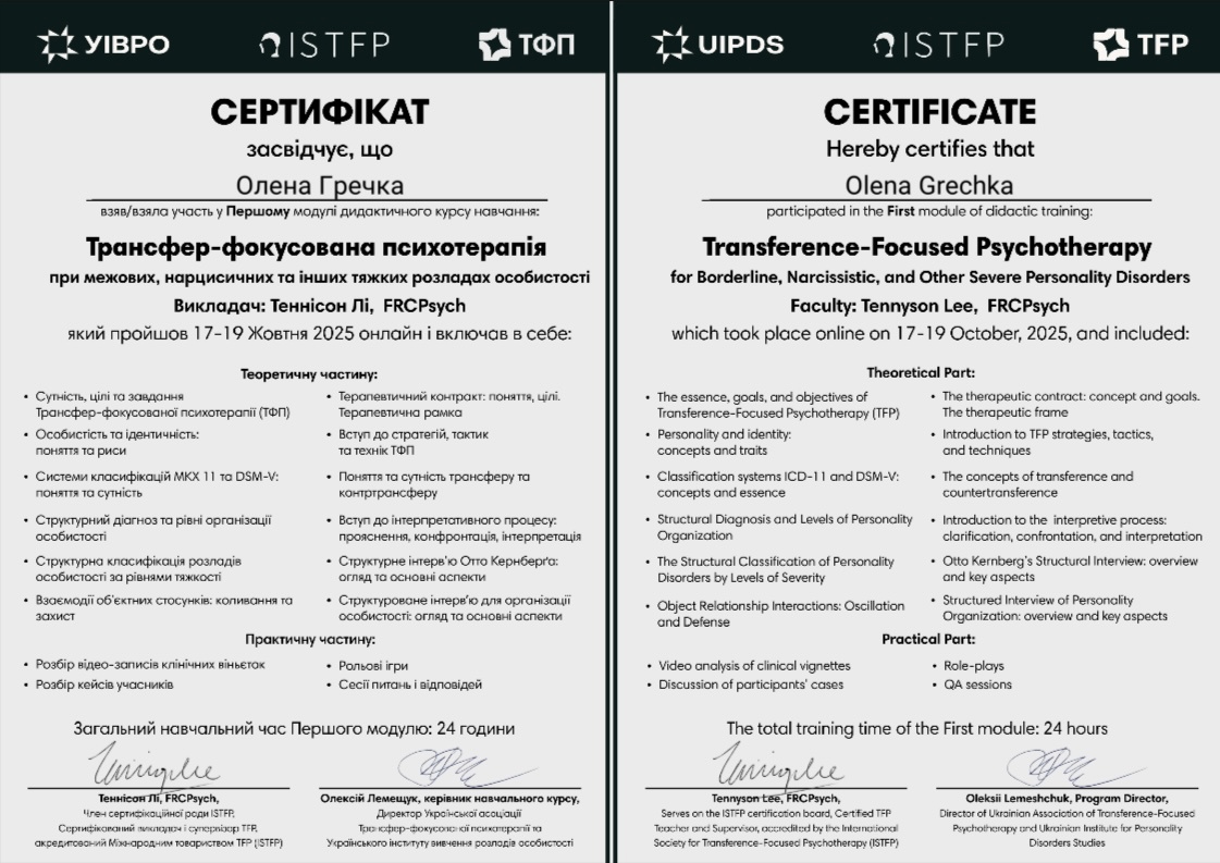 2024- Украинский институт изучения расстройств личности - "Трансфер фокусированная психотерапия при граничных, нарциссических и других тяжелых расстройствах личности".