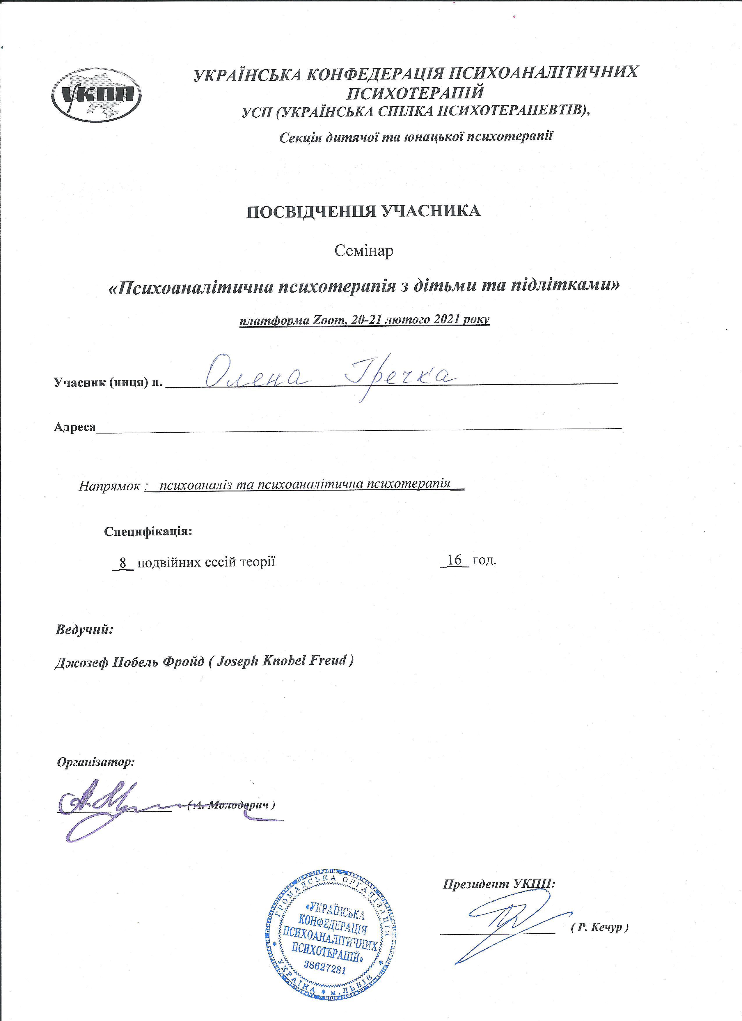 Также регулярно повышаю квалификацию и в формате психоаналитических конференций, семинаров и супервизий в рамках структуры обучения Международной психоаналитической ассоциации (IPA), Европейской федерации психоаналитической психотерапии (EFPP), Украинской ассоциации психоаналитической психотерапии (УАПП), Украинского психотерапевтического университета.