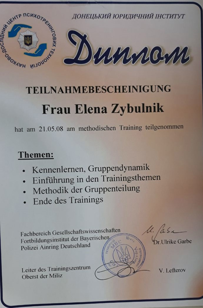 • МЕЖДУНАРОДНАЯ АССОЦИАЦИЯ ПСИХОЛОГОВ И КОНСУЛЬТАНТОВ ПО СЕКСУАЛЬНОМУ ОБРАЗОВАНИЮ. ЦЕНТР ПРАКТИЧЕСКОЙ ПСИХОЛОГИИ “HAPPY LIFE”, обучающий курс: «Успешная практика психолога в дни войны». Общим количеством 72 часа, 2025 год.