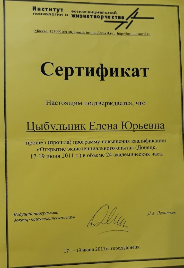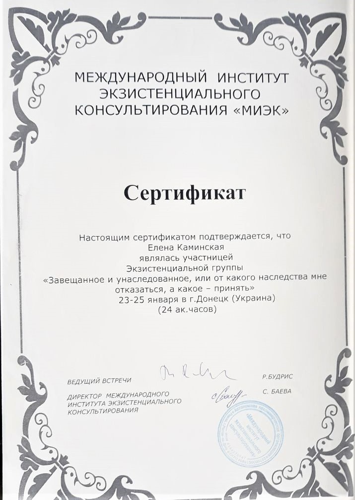 • Международный институт экзистенциального консультирования (МИЭК) I степень 2012-2022.