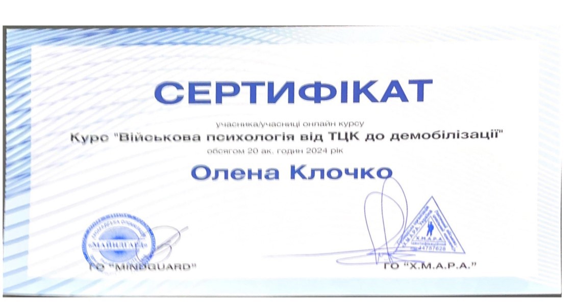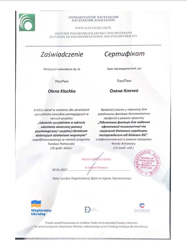 Я окончила Институт последипломного образования КНУ им. Шевченко, имею степень Магистра психологии, по специализации "Семейное консультирование" (имею отдельный сертификат). Также закончила 1 степень гештальт-терапии в Академии Погодина. Сейчас в процессе получения 2 степени как гештальт-терапевт в Киевском гештальте университета. В процессе обучения на специализациях с работой с травмой, кризисами и потерями, а также телесной терапии.