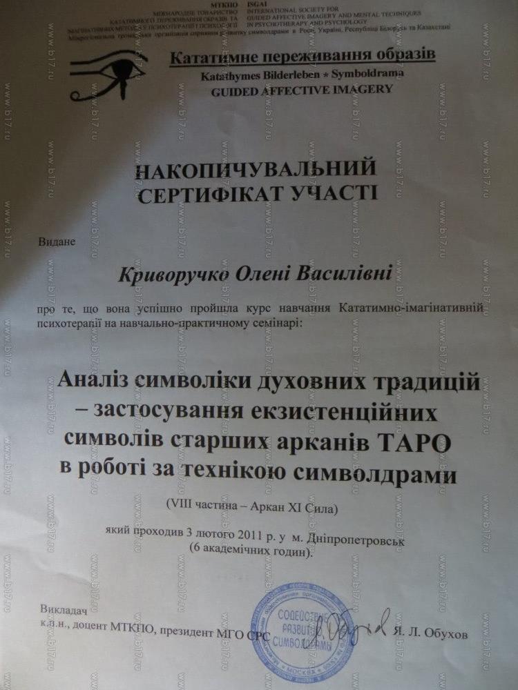 2007-2008 гг. – «Арттерапия – путешествие в мир творчества» - изучение основ арт-терапии под руководством О.Козиной (г.Днепр)