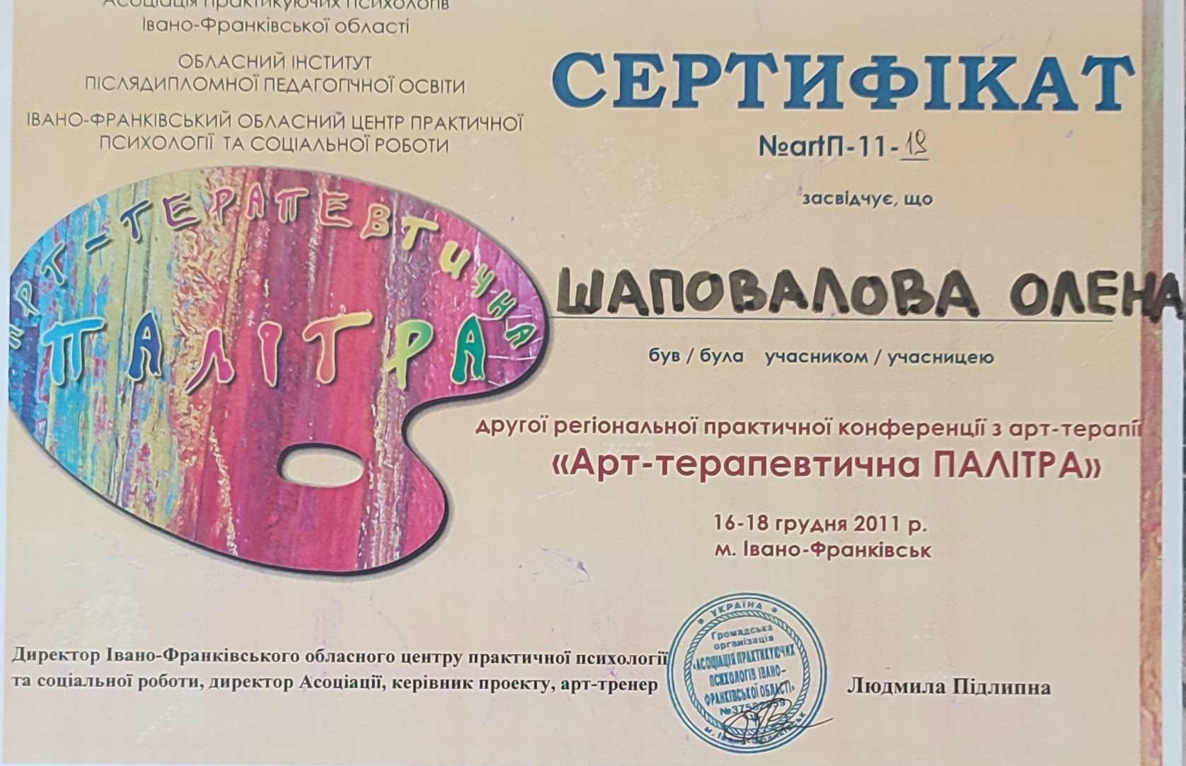 Окончила Прикарпатский национальный университет им.В.Стефаника, специальность психология, сейчас учусь на психотерапевта в направлении "Транзактный анализ". Прошла обучение: