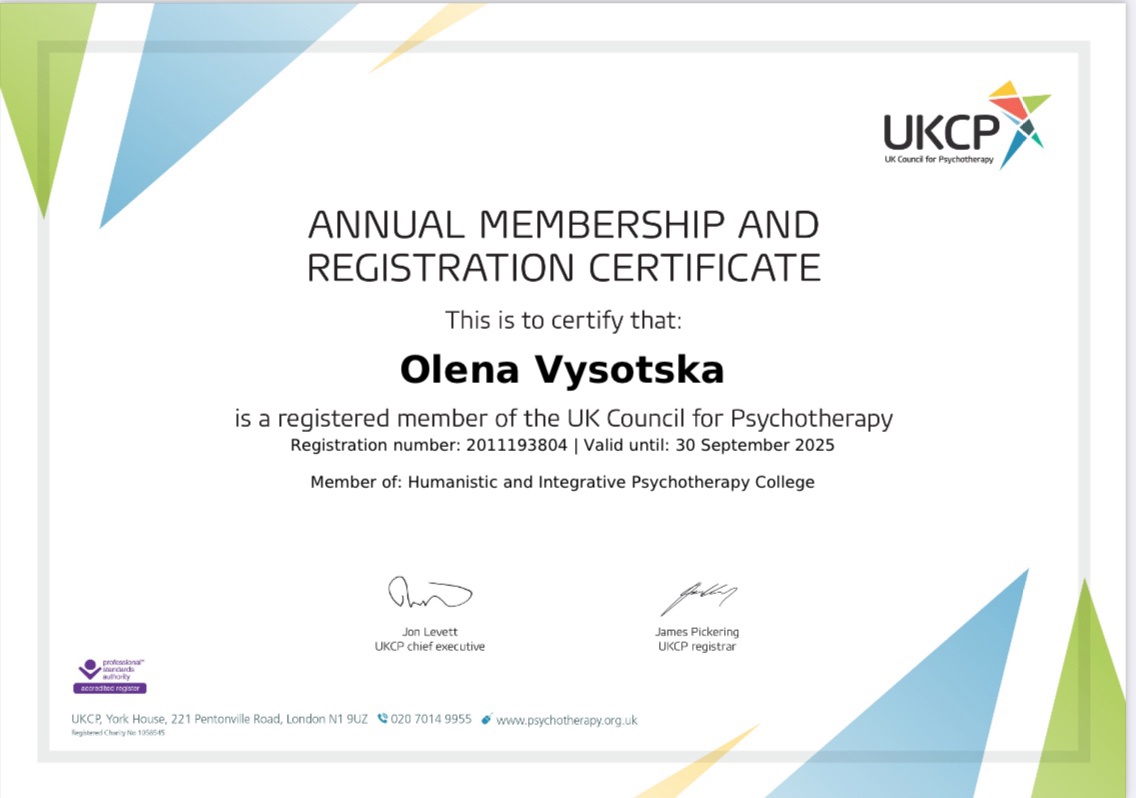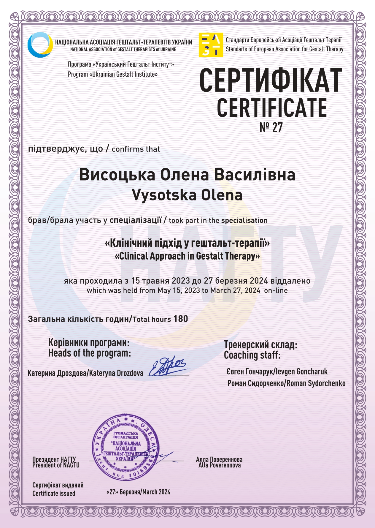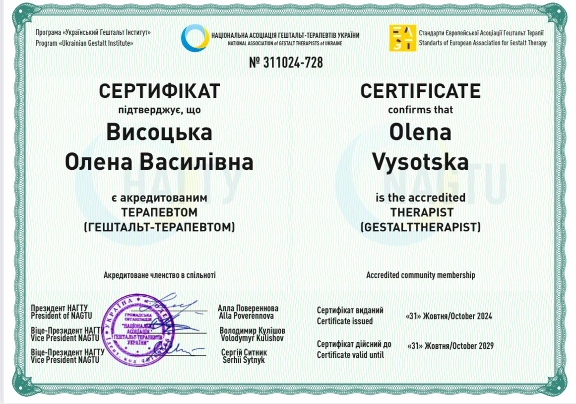 Национальная Ассоциация гештальт-терапевтов Украины – Сертифицированный гештальт-терапевт.
