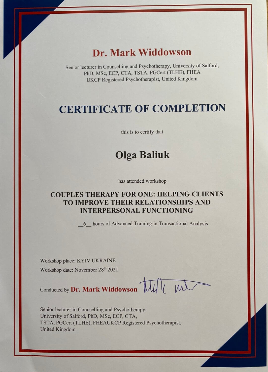 Семінар «Парная терапія для одного: допомога клієнтам в покращенні їх взаємовідносин», 2021