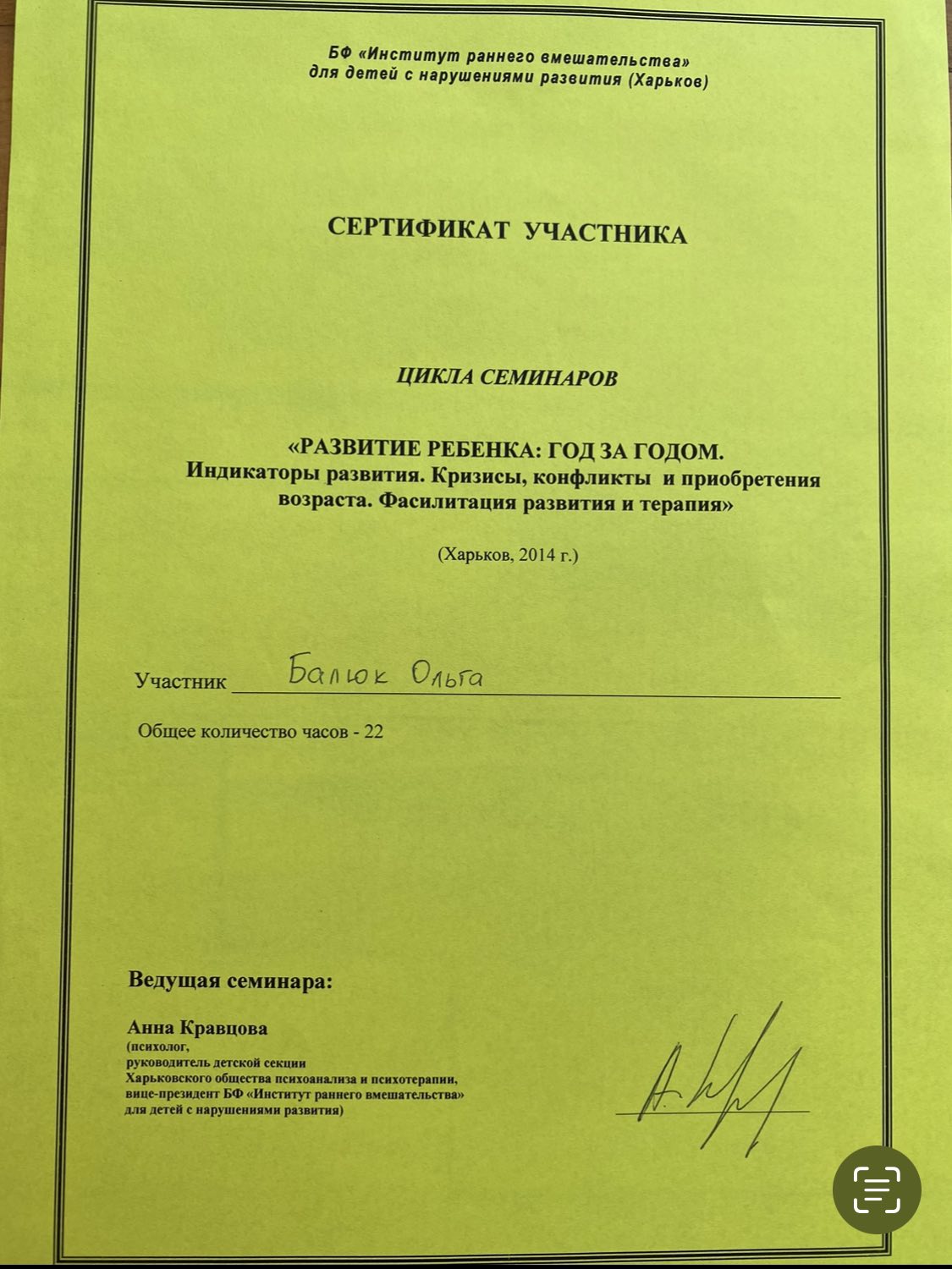 Учасник циклу семінарів "Розвиток дитини: рік за роком. Індикатори розвитку. Кризи, конфлікти та набуття віку. Фасилітація розвитку та терапії. 2014