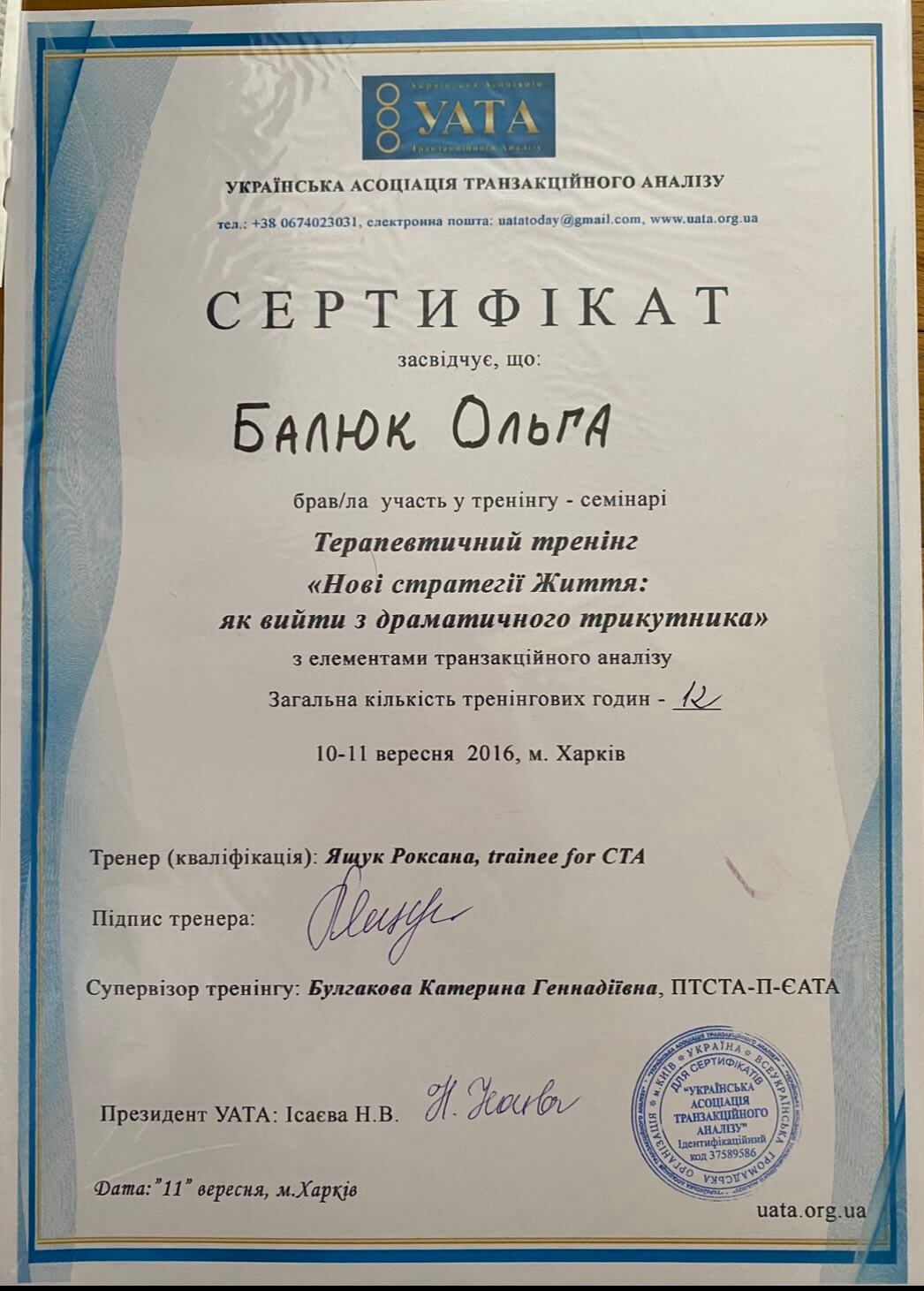 Терапевтичний тренінг «Нові стратегії життя: як вийти з драматичного трикутника», з елементами транзактного аналізу, 2016