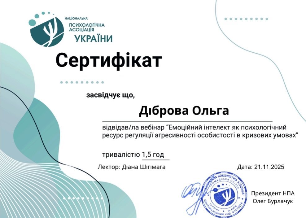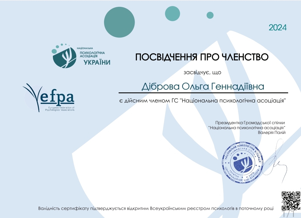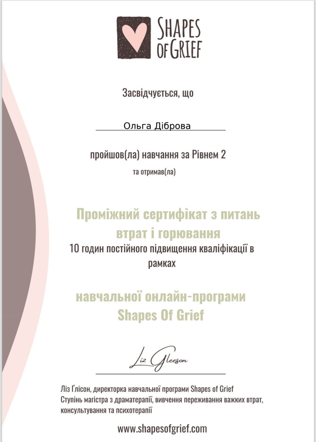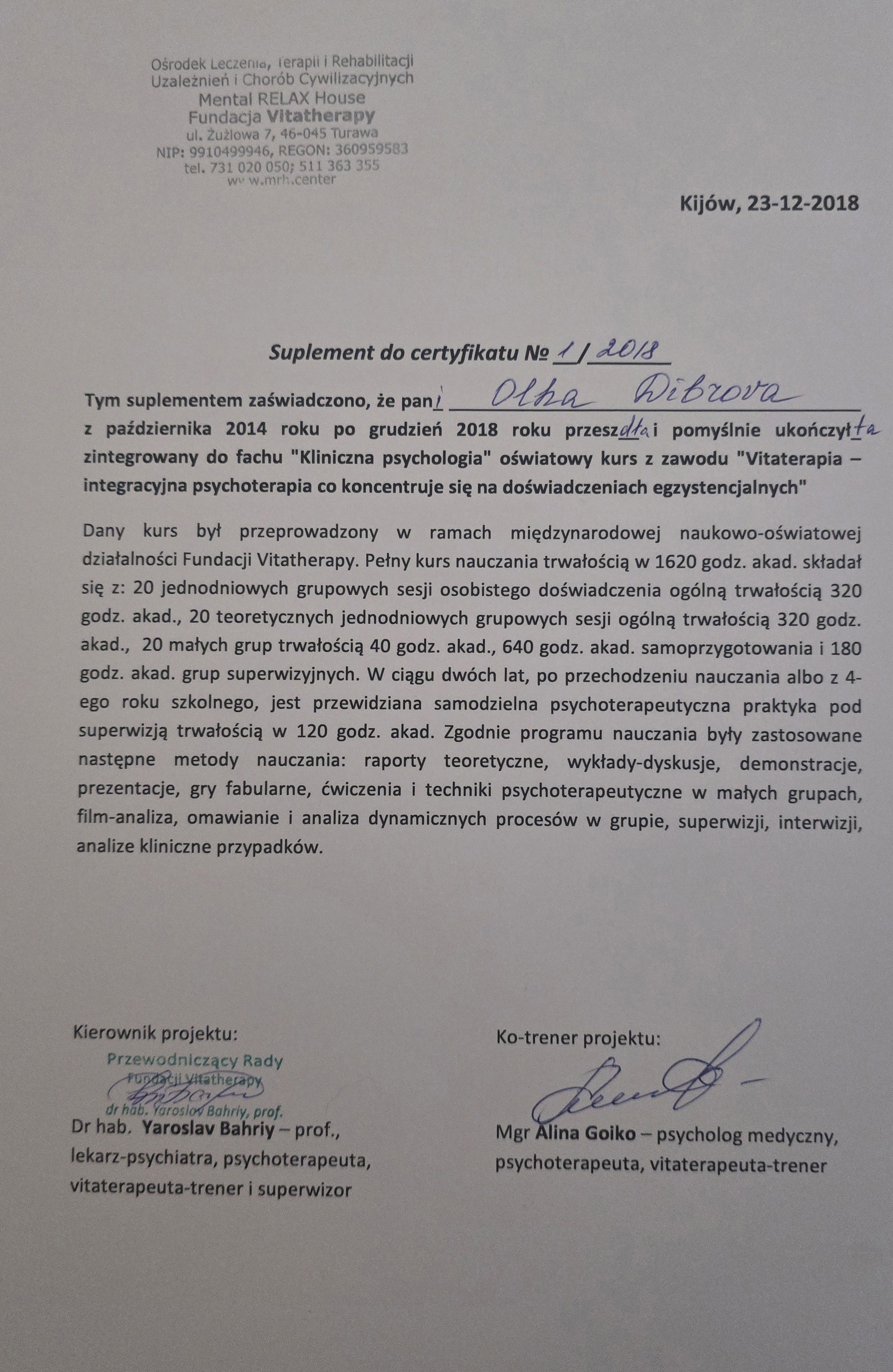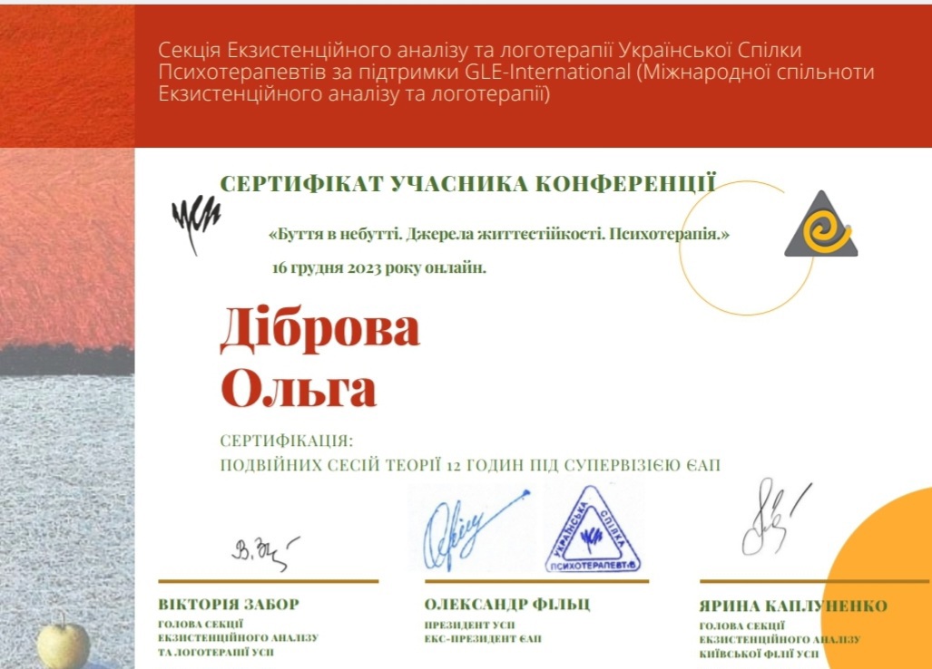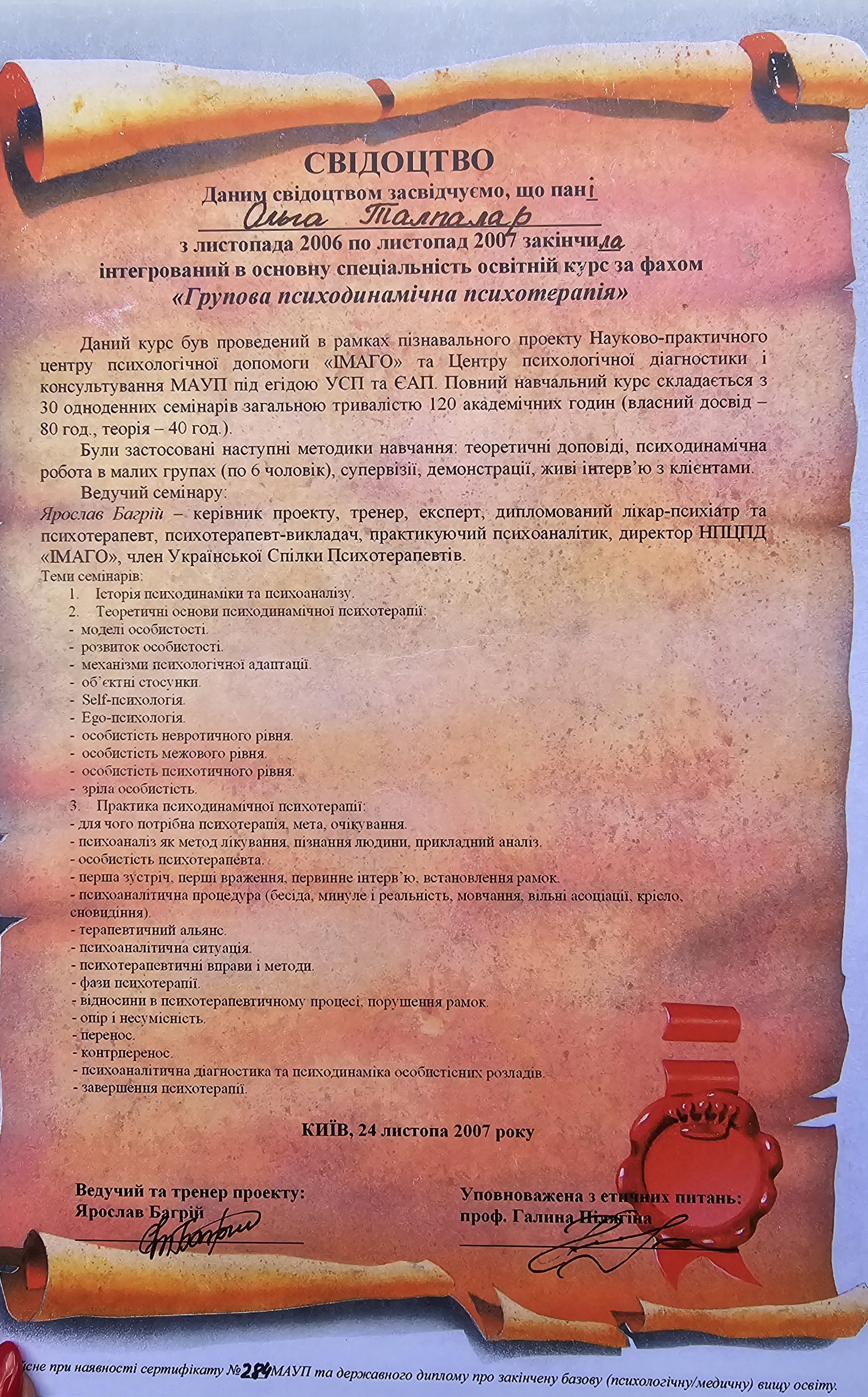 Курс психодинамической психотерапии. Школа Vitatherapy, подход, запатентованный в Польше. Заканчиваю обучение по логотерапии и экзистенциальному анализу в GLE International (Вена, Австрия).