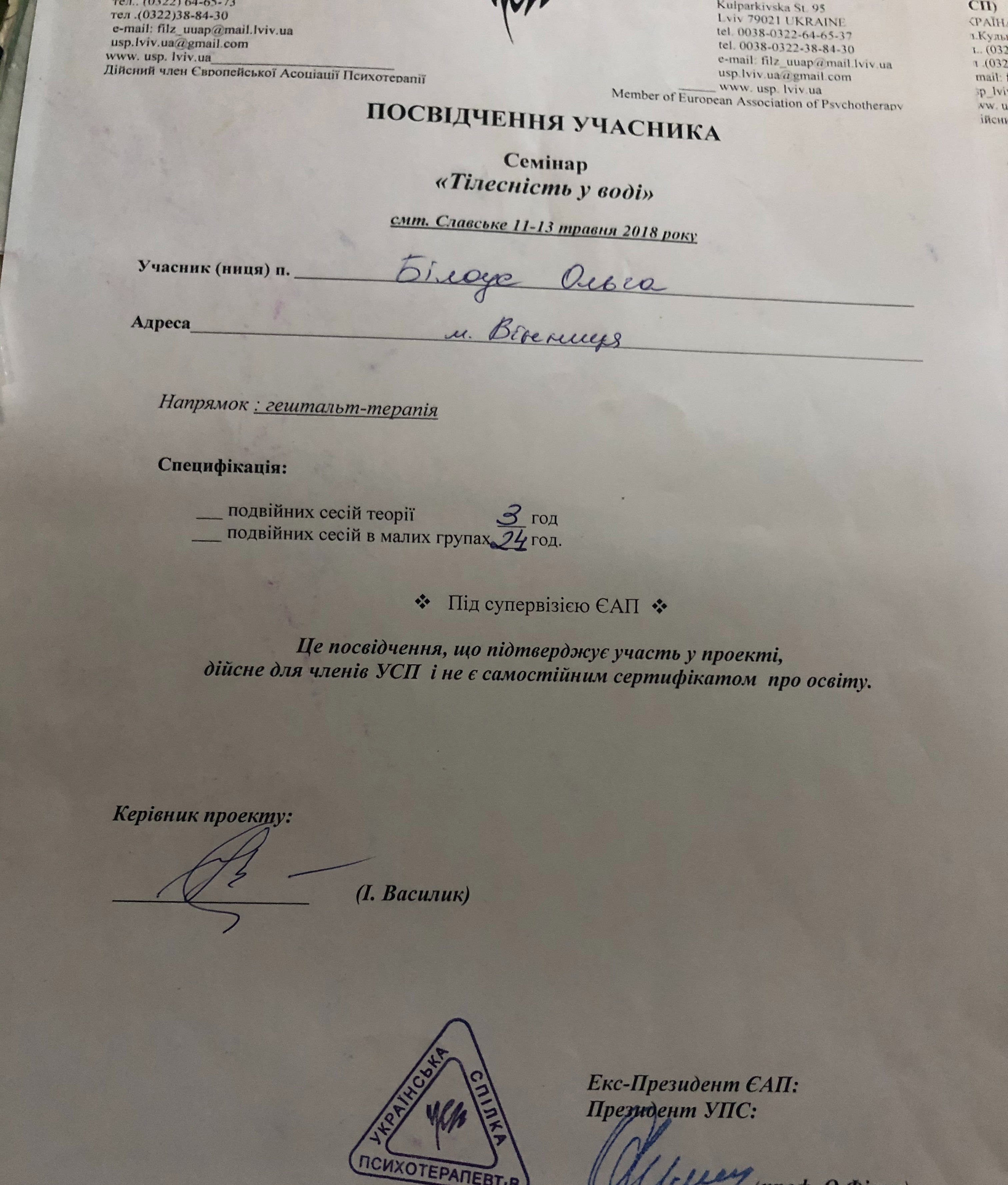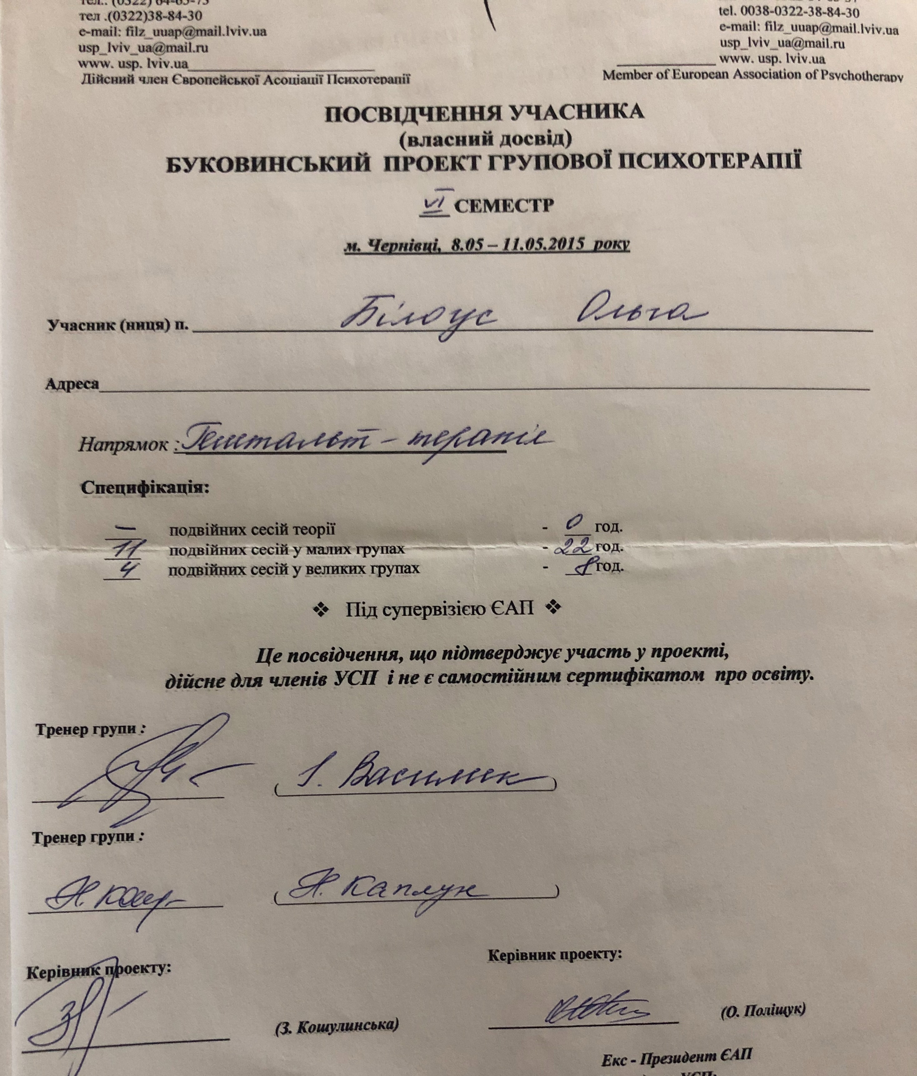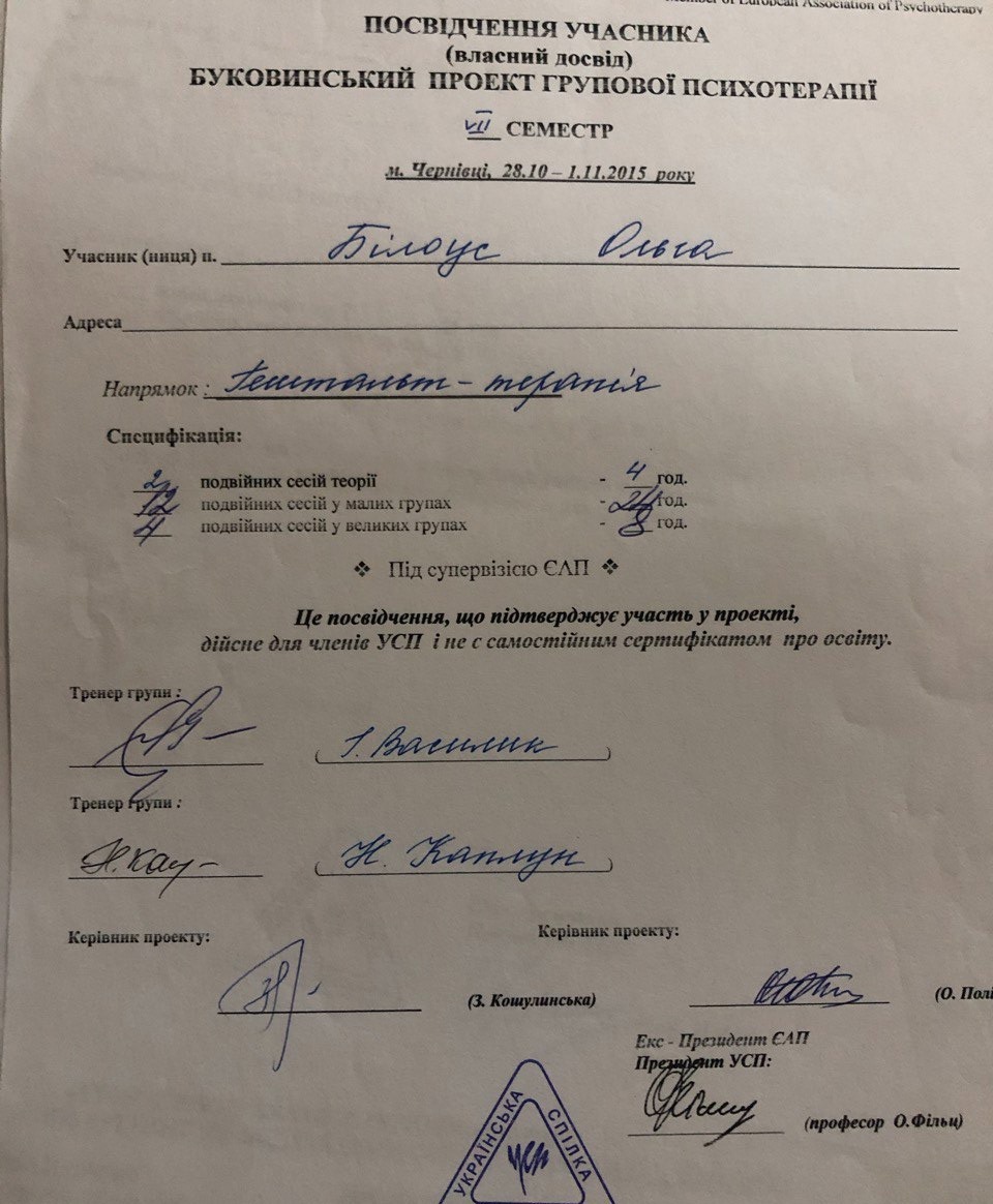 2015 Буковинский проект УСП собственного опыта, направление гештальт
