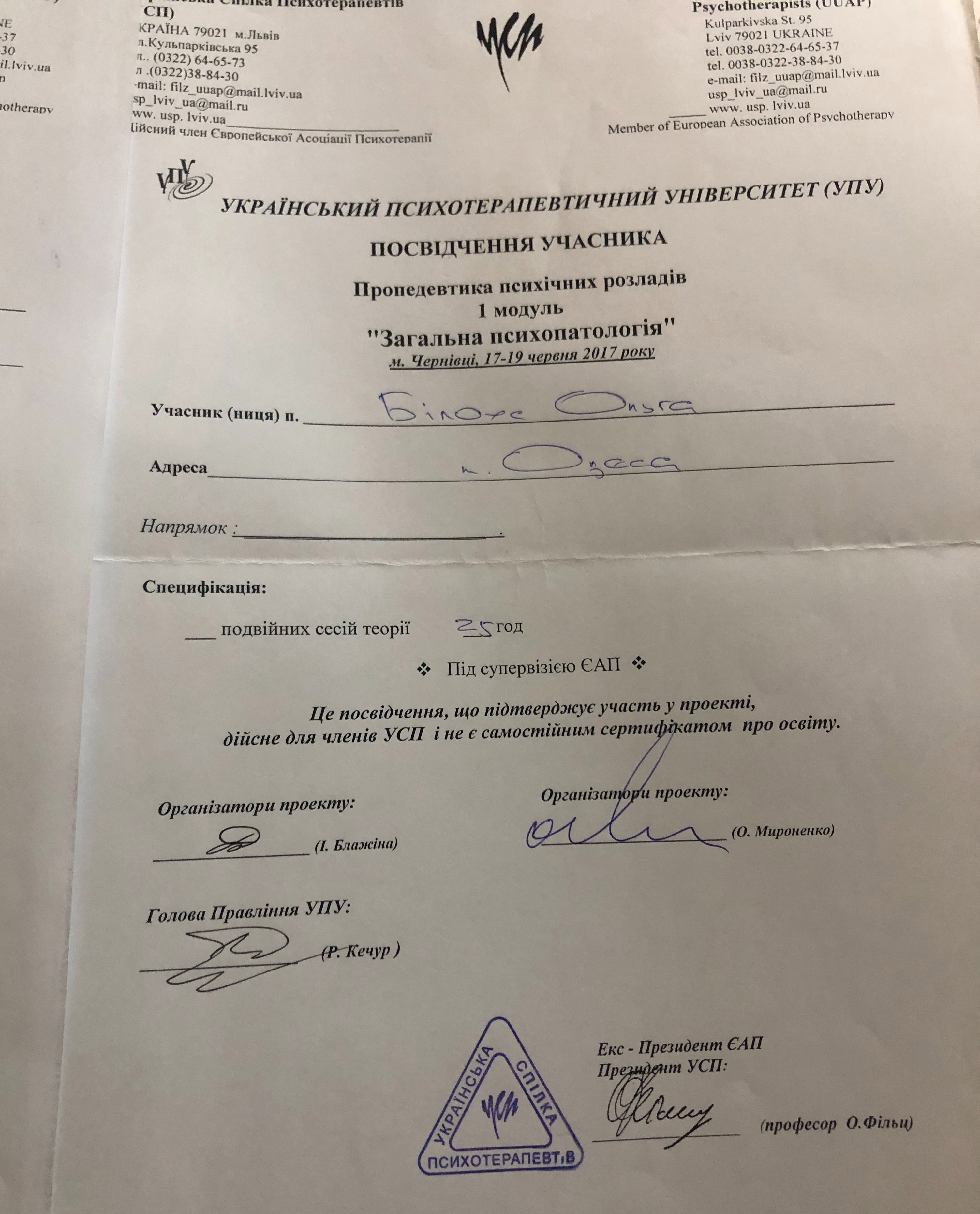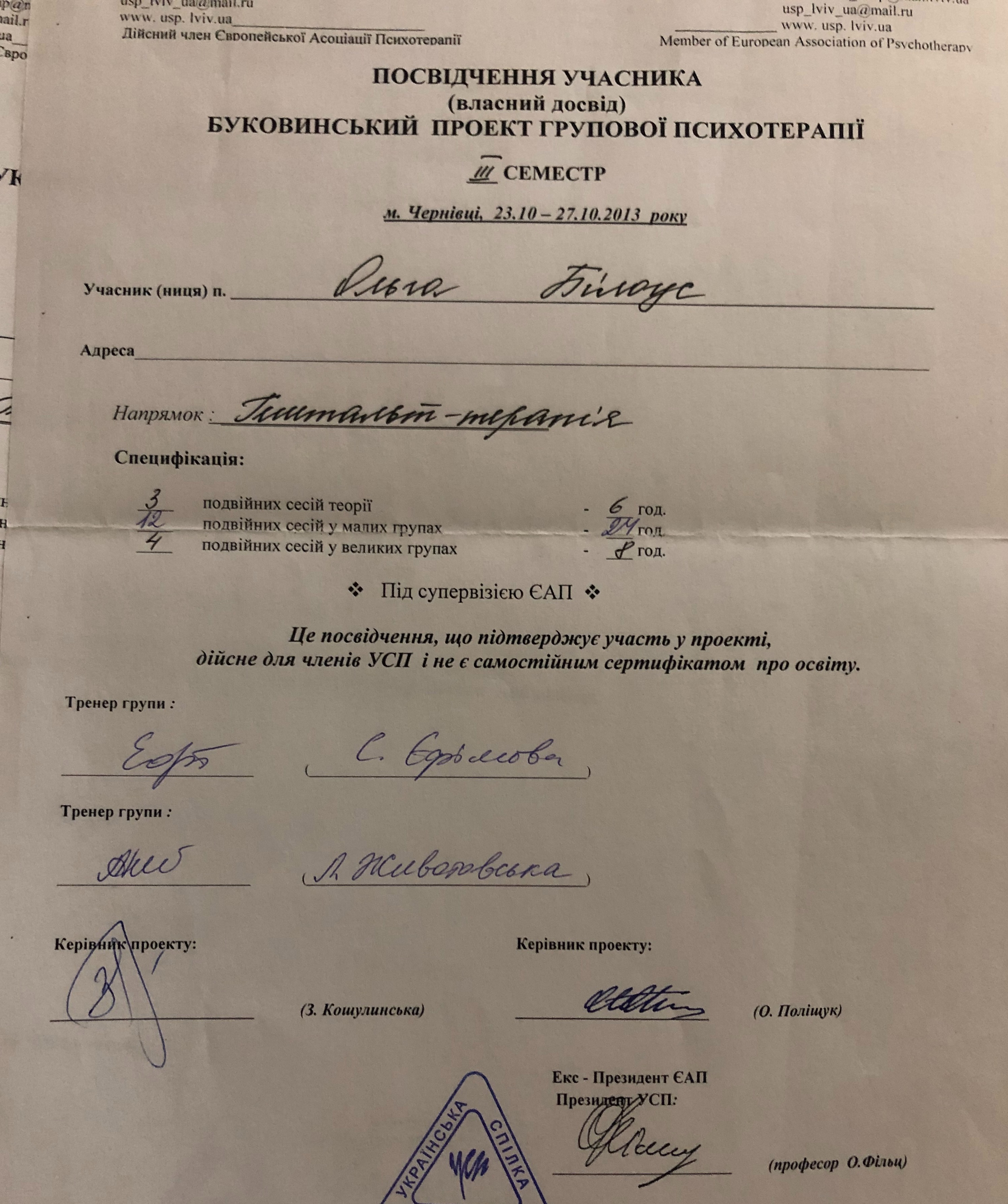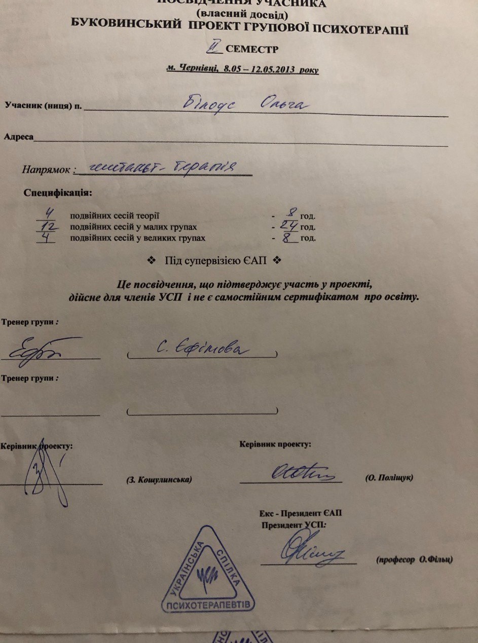 2015 Буковинский проект УСП собственного опыта, направление гештальт