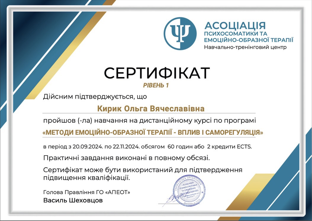 «Методы эмоционально-образной терапии – влияние и саморегуляция» (уровень 1)