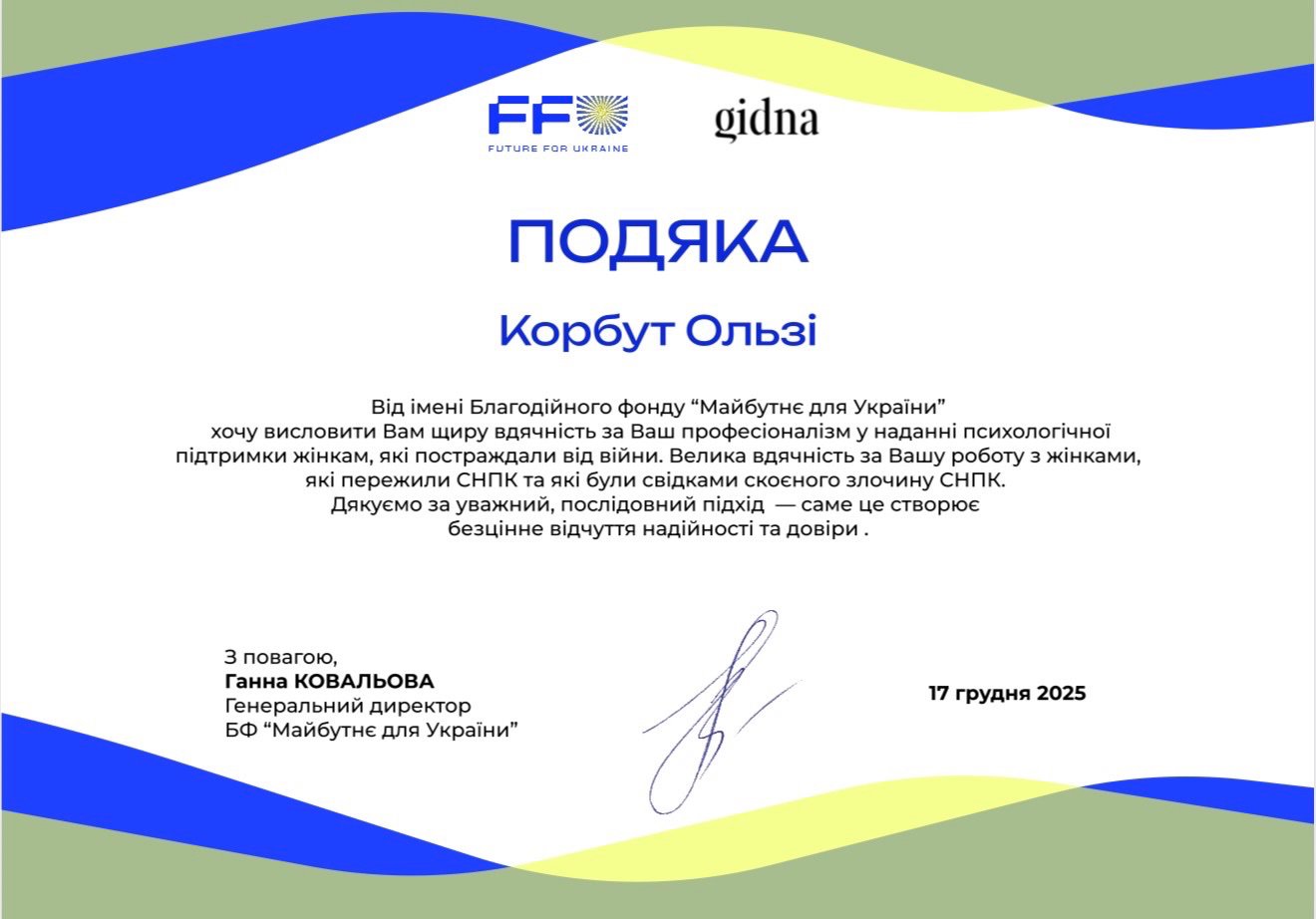 Я – член Украинской Ассоциации Психоанализа. Участвовала и продолжаю принимать участие во многих специализированных семинарах и конференциях по повышению квалификации.