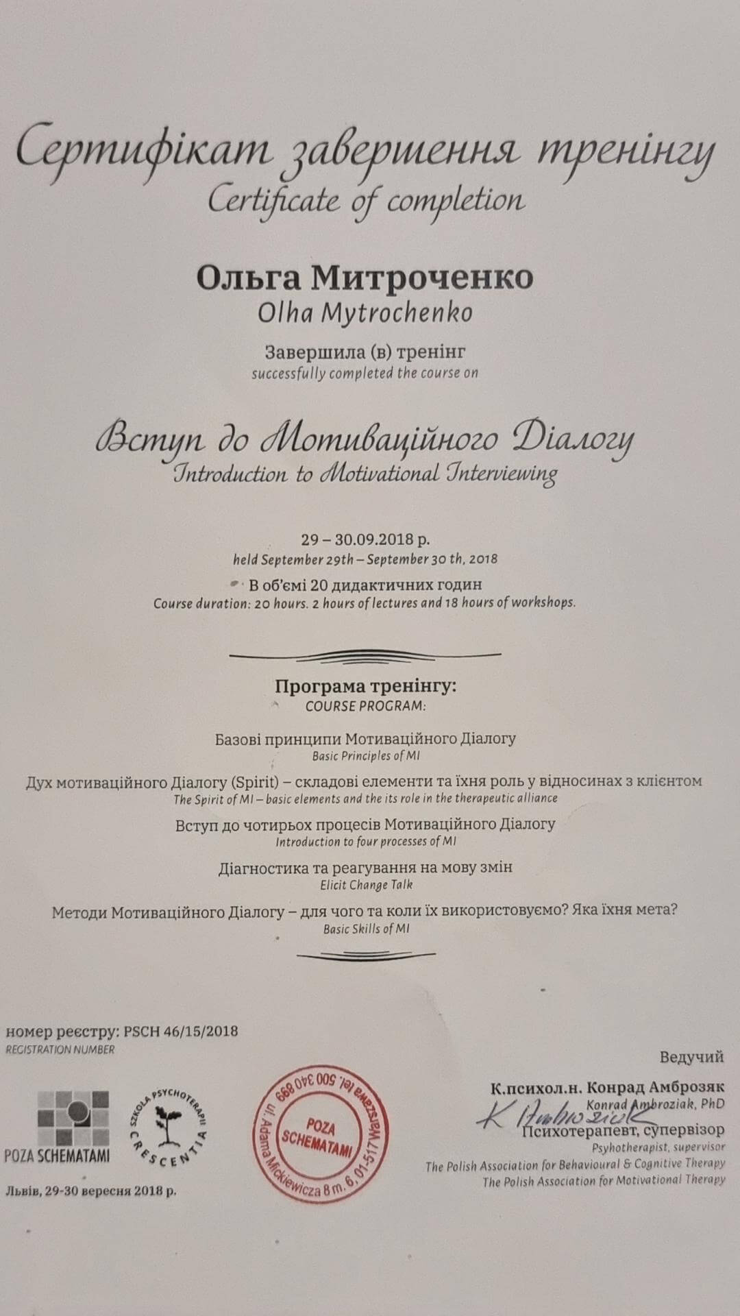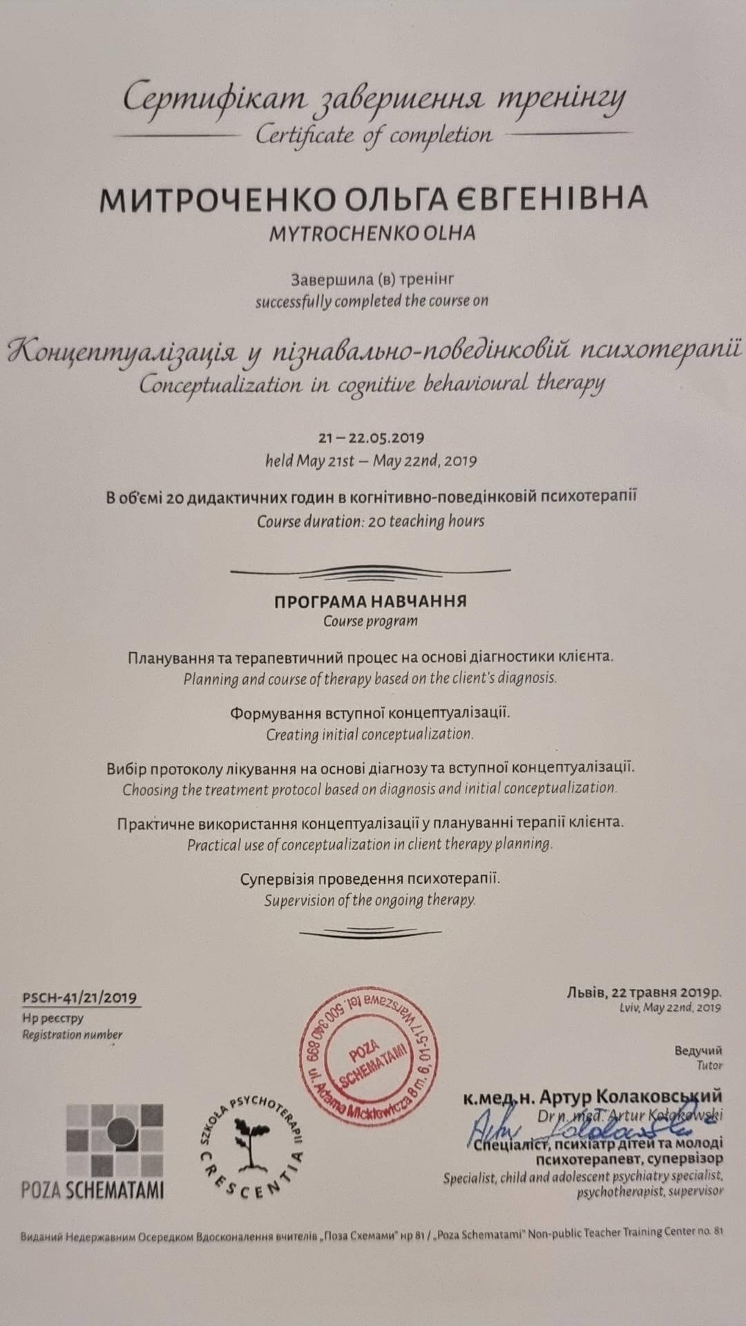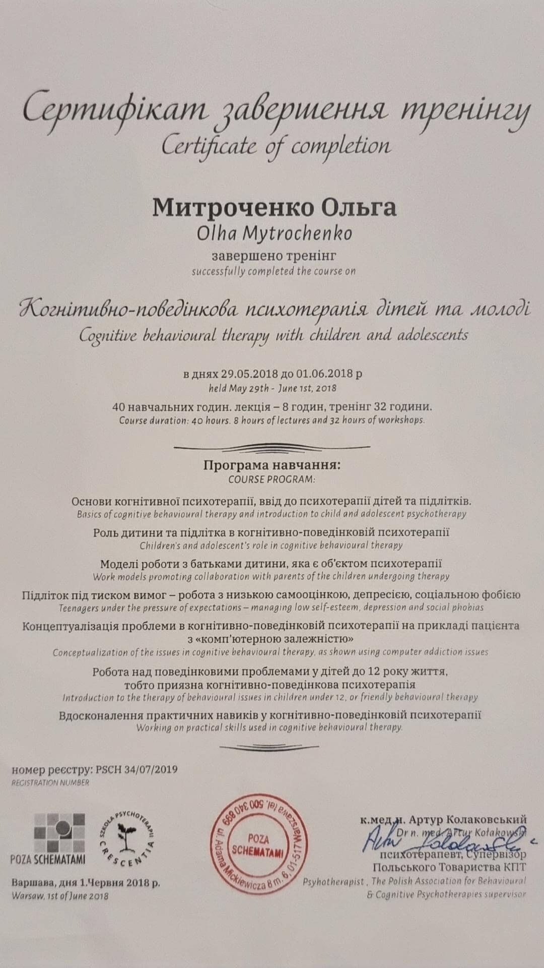 Проходила обучение на программах по системной семейной терапии (применяю часто в парном консультировании и работе с детско-родительскими отношениями) и в когнитивно поведенческом подходе. Также проходила обучение по ненасильственному общению, которое отлично работает в ситуациях сложно разрешаемых конфликтов. Сейчас прохожу повышение квалификации в Схема-терапии - этот подход важен для работы с травматичными детскими переживаниями и при наличии расстройств личности, например, зависимом или нарциссическом