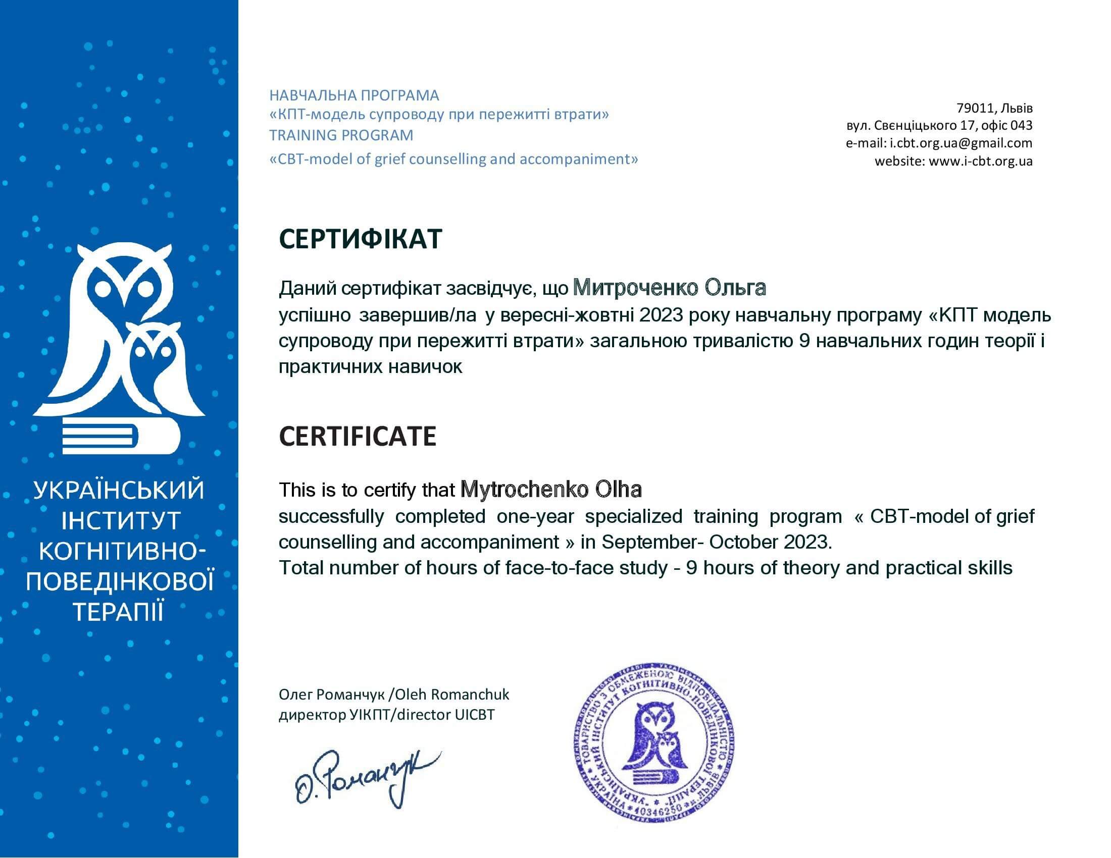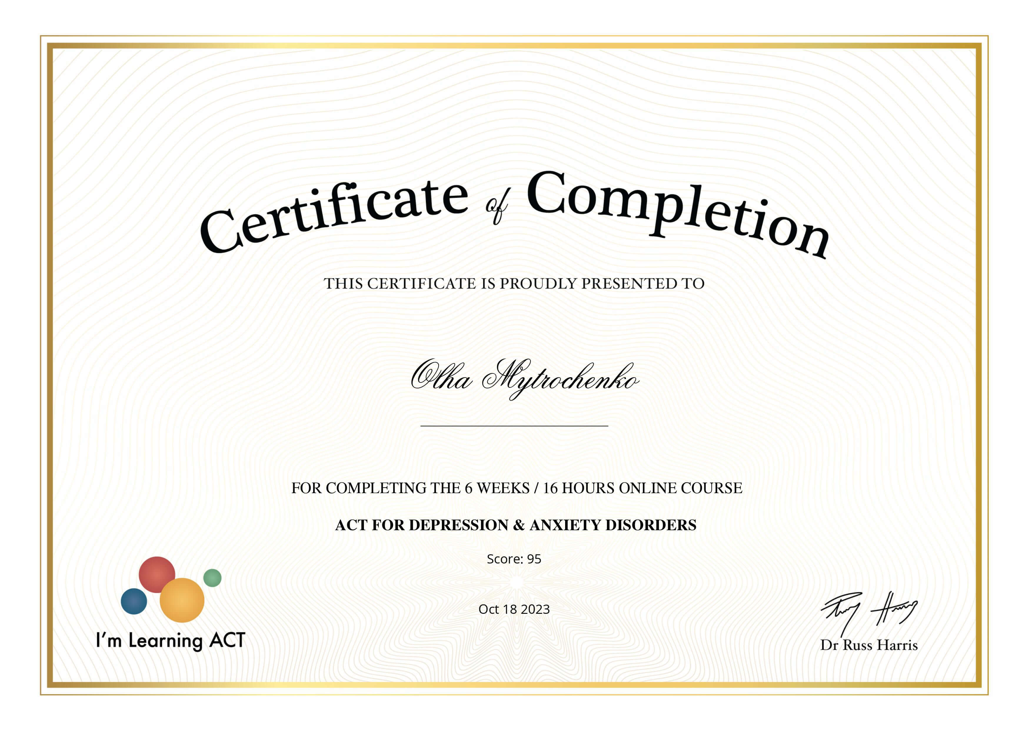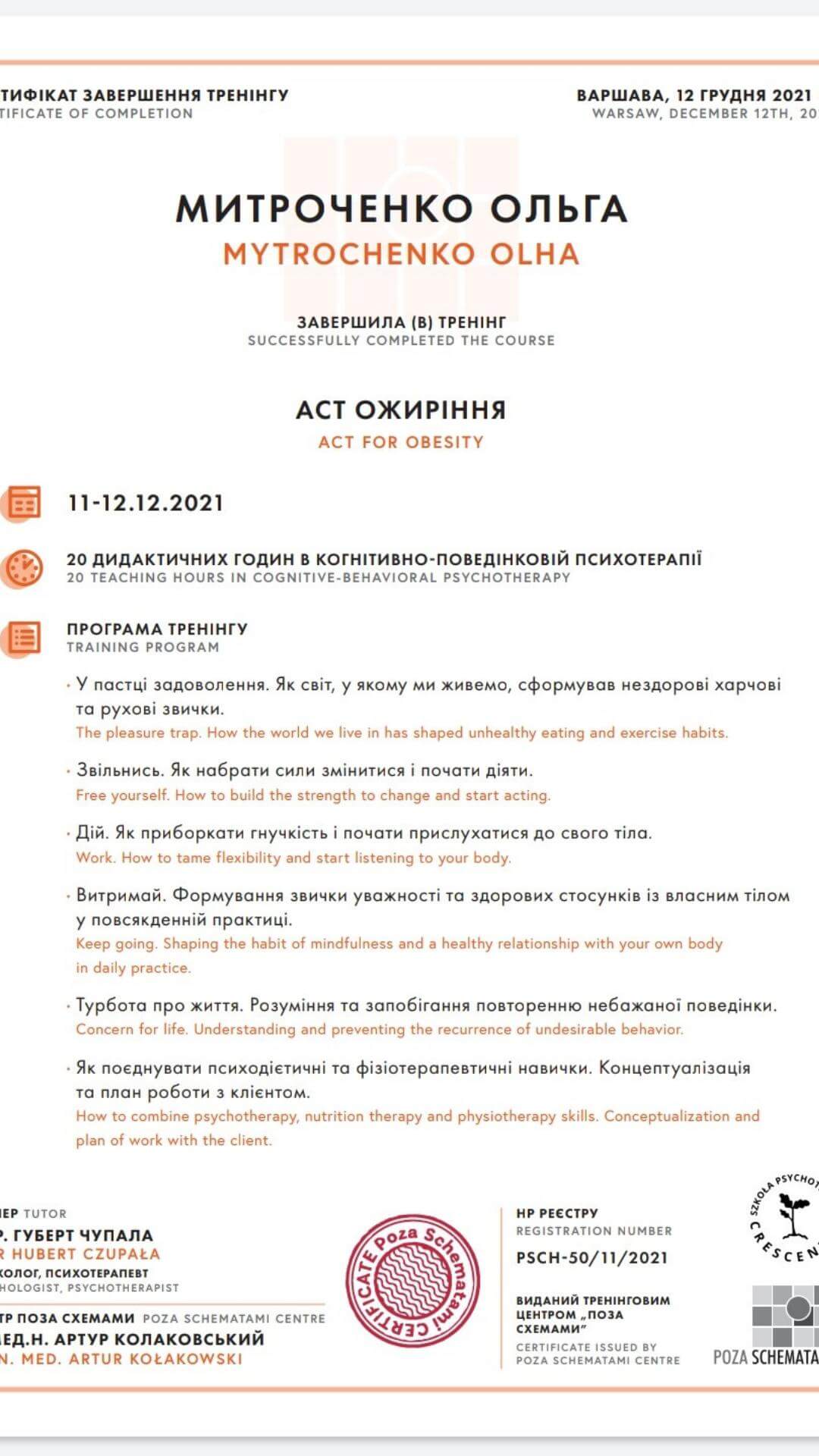 Проходила обучение на программах по системной семейной терапии (применяю часто в парном консультировании и работе с детско-родительскими отношениями) и в когнитивно поведенческом подходе. Также проходила обучение по ненасильственному общению, которое отлично работает в ситуациях сложно разрешаемых конфликтов. Сейчас прохожу повышение квалификации в Схема-терапии - этот подход важен для работы с травматичными детскими переживаниями и при наличии расстройств личности, например, зависимом или нарциссическом