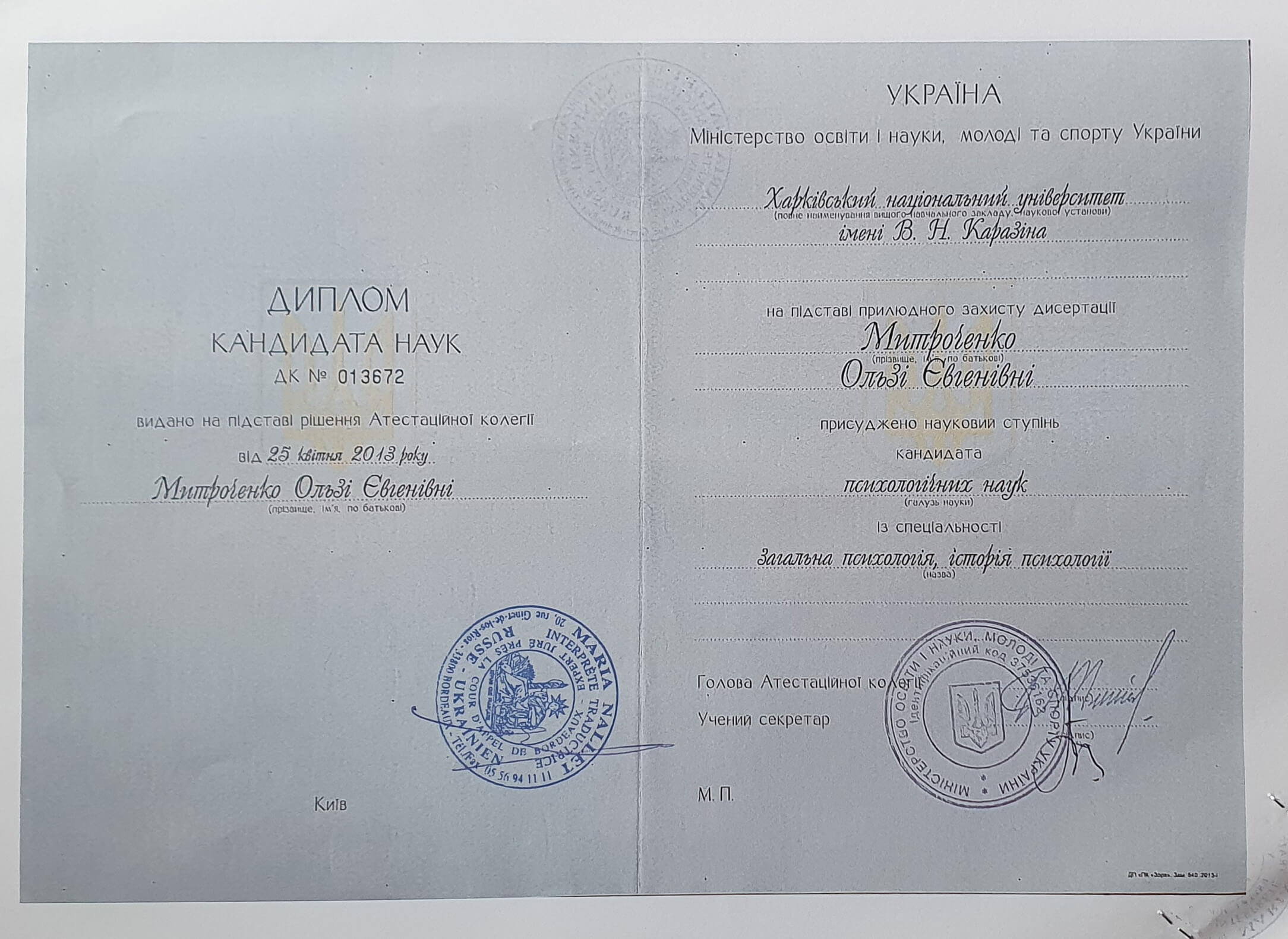 Бакалавр и магистр Харьковский национальный университет им. В.Н.Каразина, кандидат психологических наук.