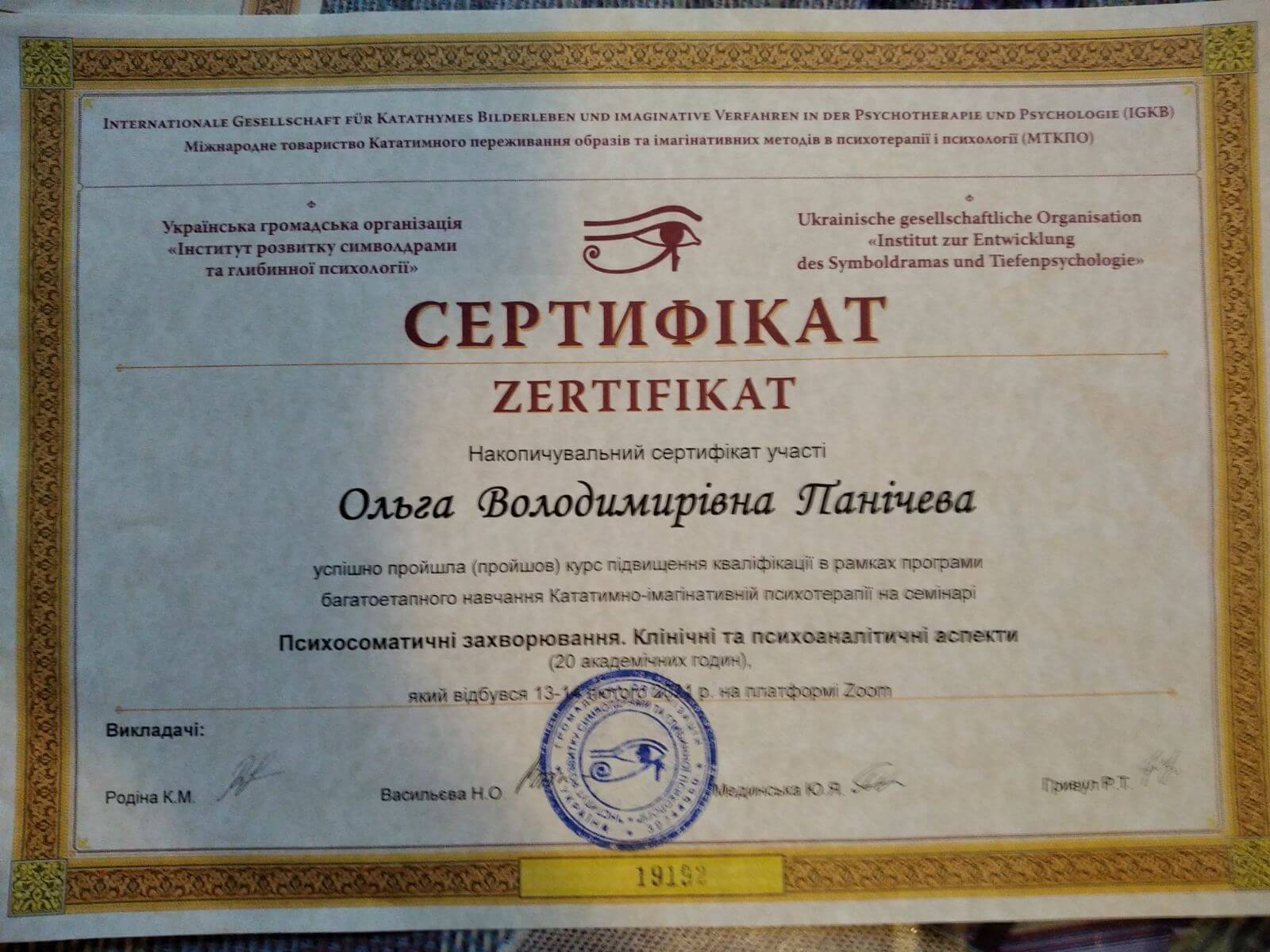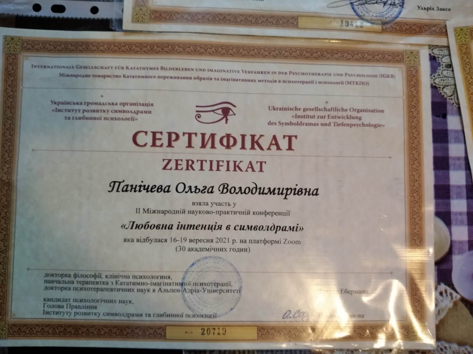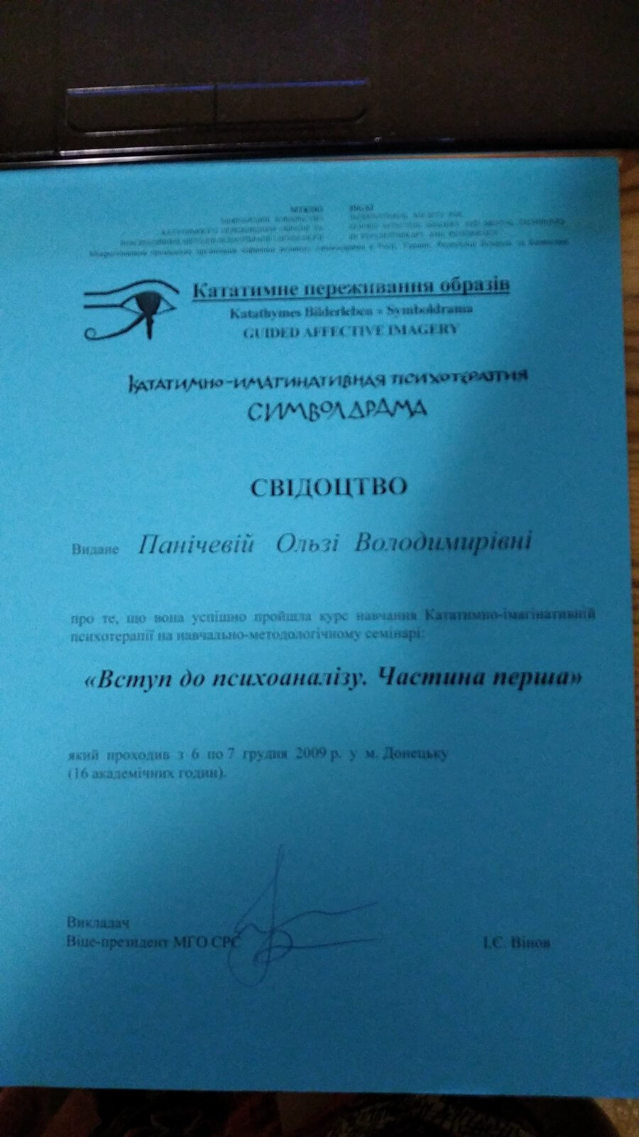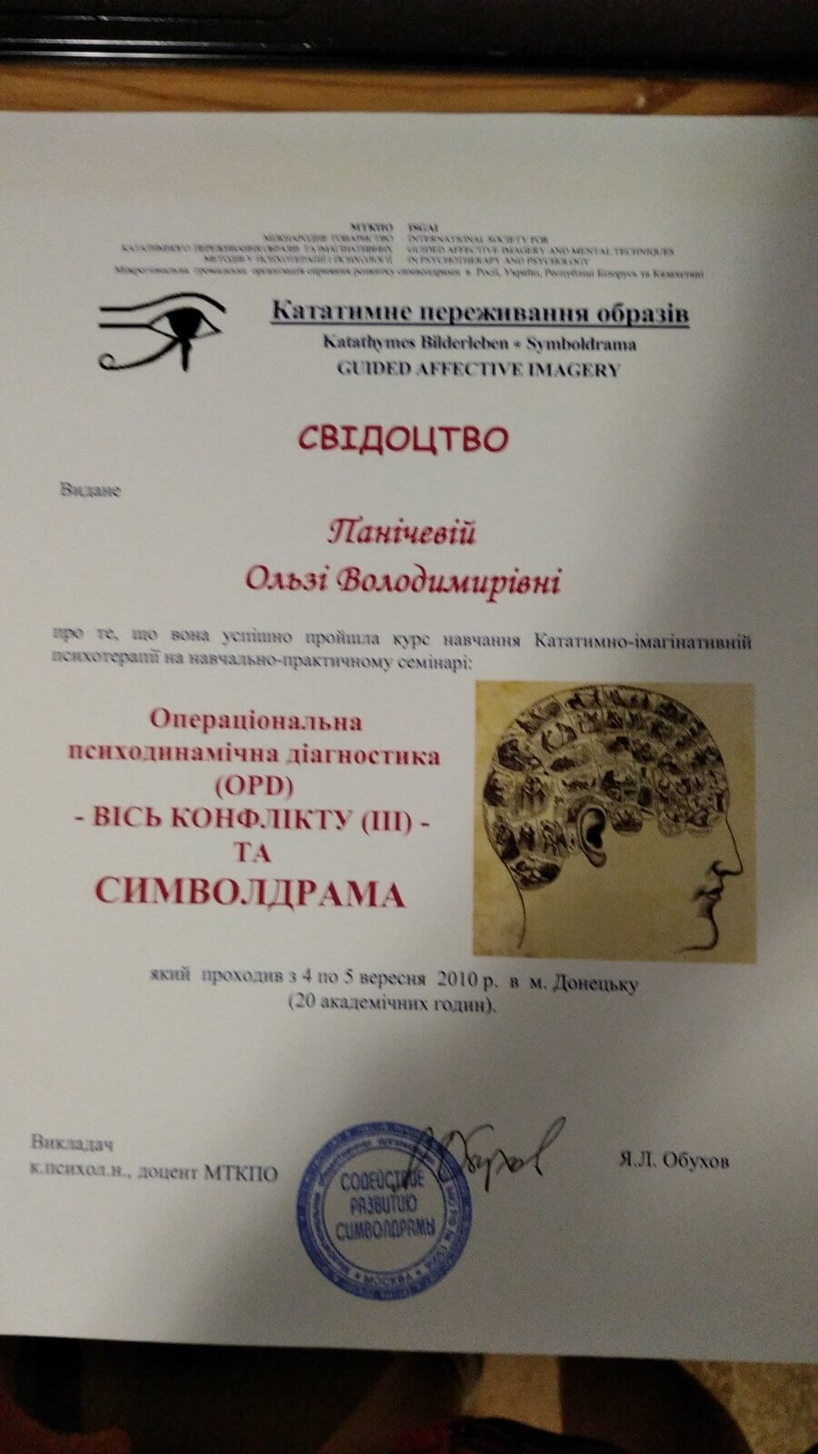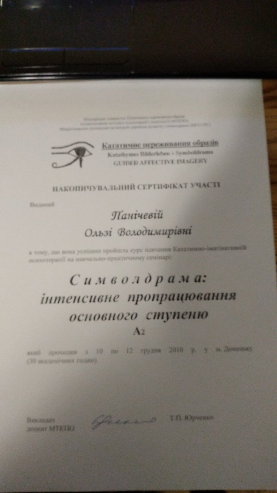 Свидетельство "Символдрама в работе с партнёрскими отношениями: мужчина и женщина(Луганск)" Год окончания 2013; обучающий курс"Семейная психотерапия и консультирование" 2012 год; Член Межрегиональной общественной организации содействия развитию символдрамы (МОО СРС); также ряд сертификатов, подтверждающих обучение в проекте Символдрама; Сертификаты, подтверждающие участие в научно-проктических конференциях и семинарах: Любовния интенция в символдраме, Конфронтация травмы методом символдрама 2021 г.г.
