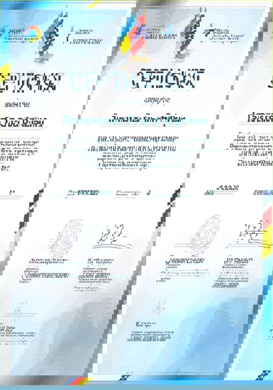 - сертифицированная гештальт-терапевт НАГТУ (Национальной ассоциации гештальт-терапевтов Украины)