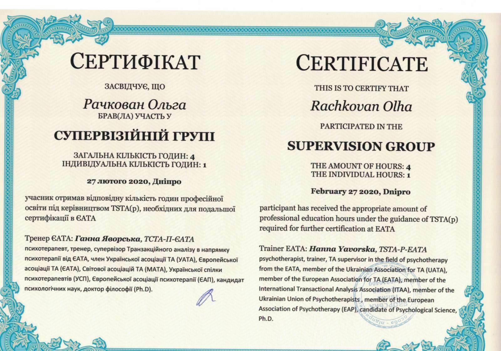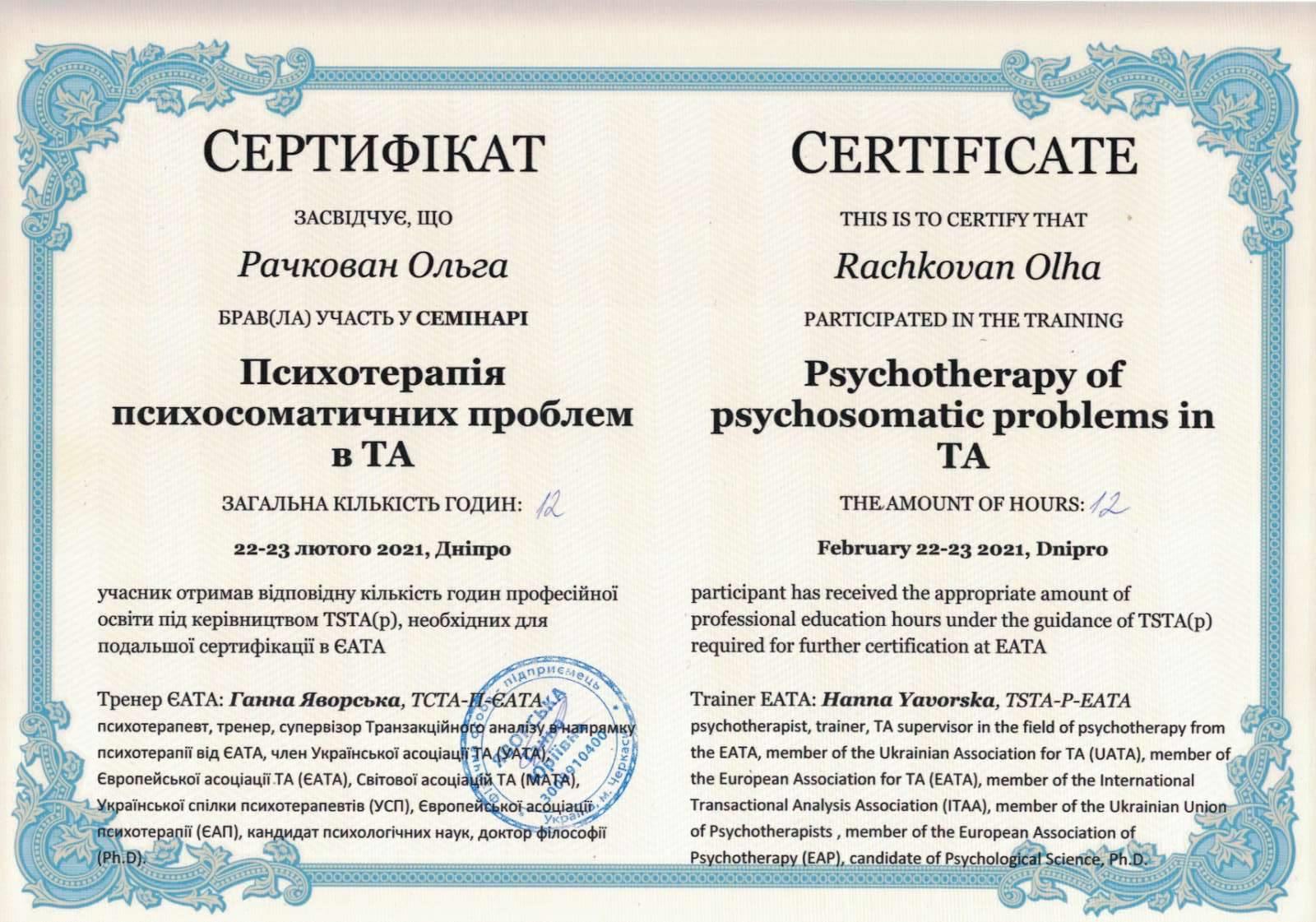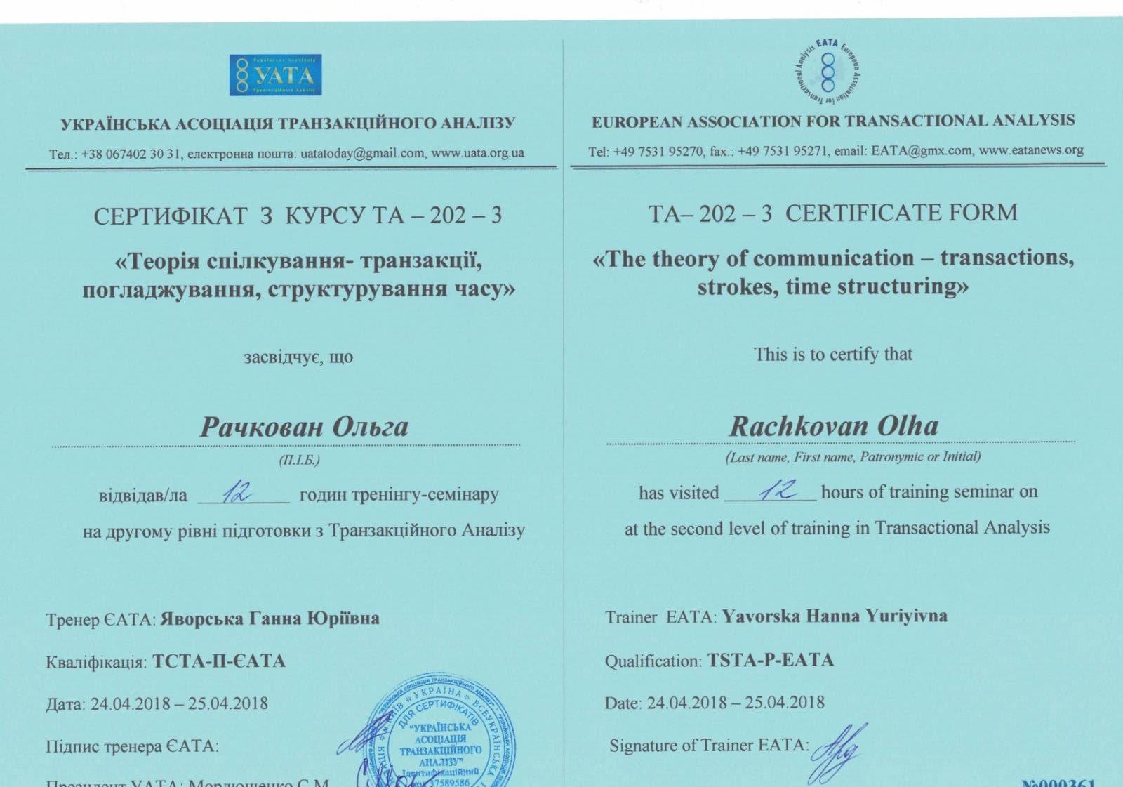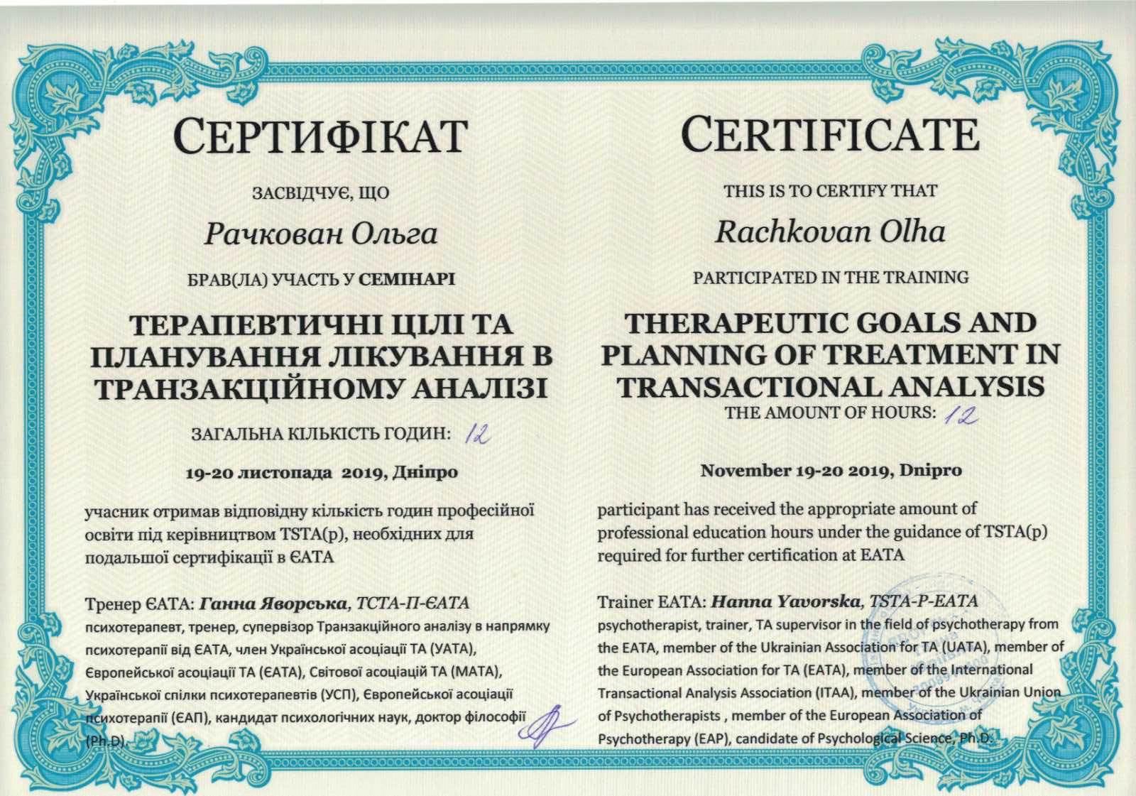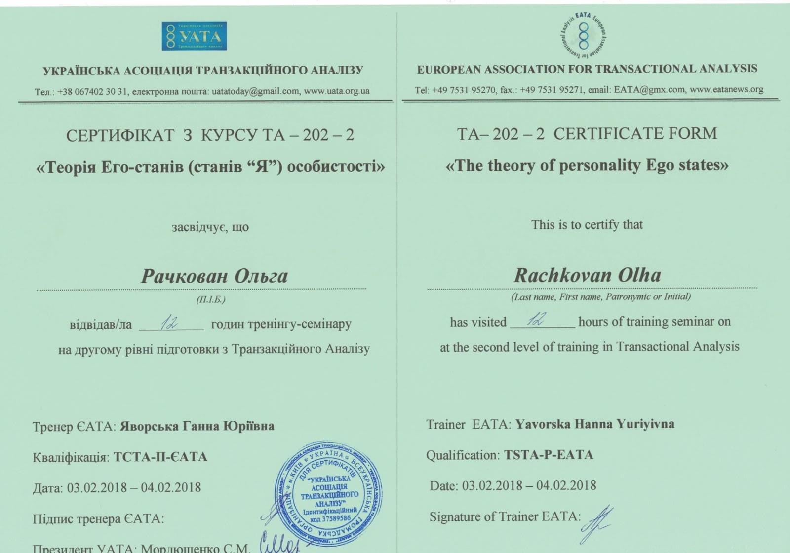 Переяслав-Хмельницкий государственный педагогический университет. (практический психолог). Украинская Ассоциация Транзактного Анализа (психотерапевт). Когнитивно-Поведенческая Терапия (психолог).