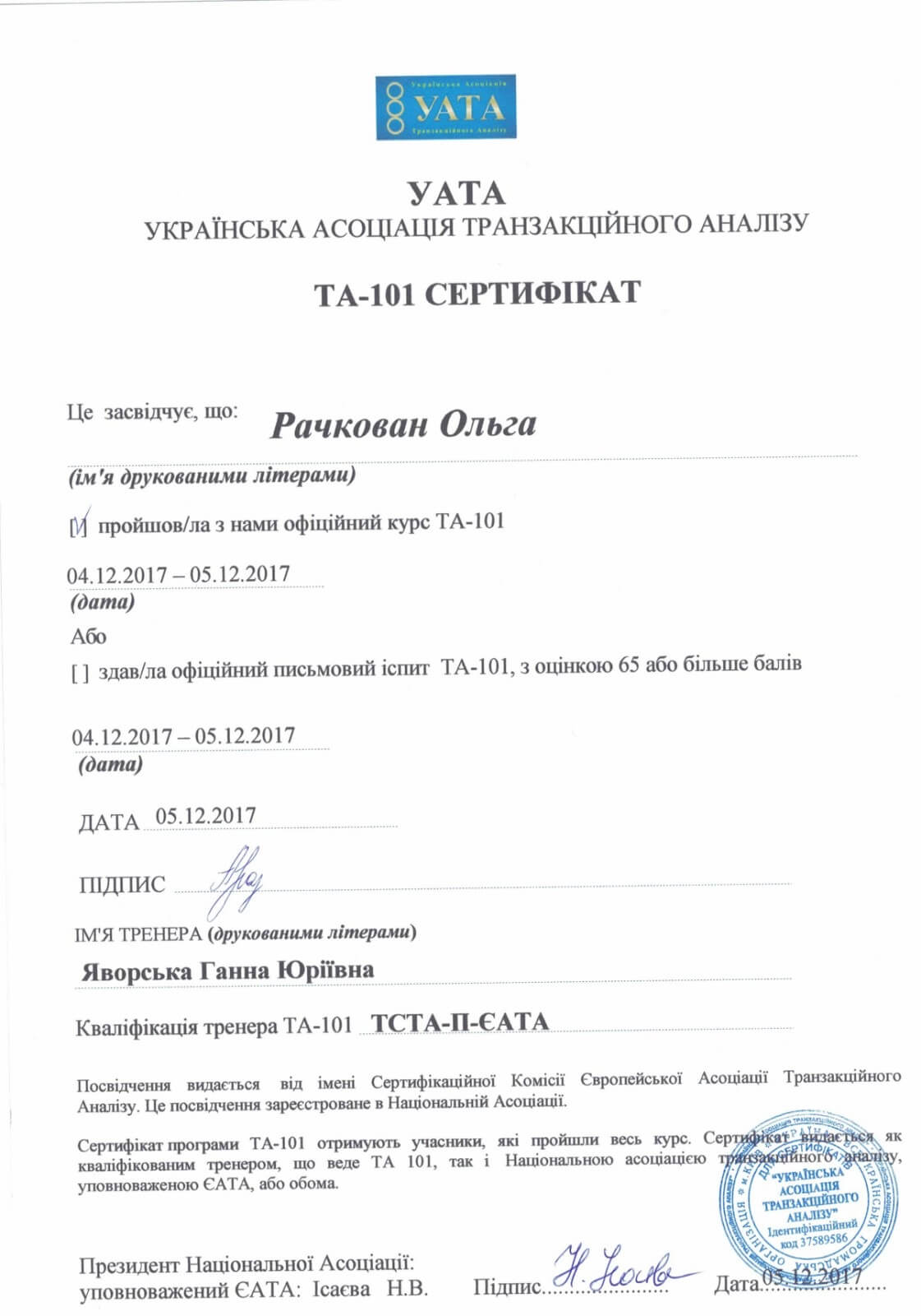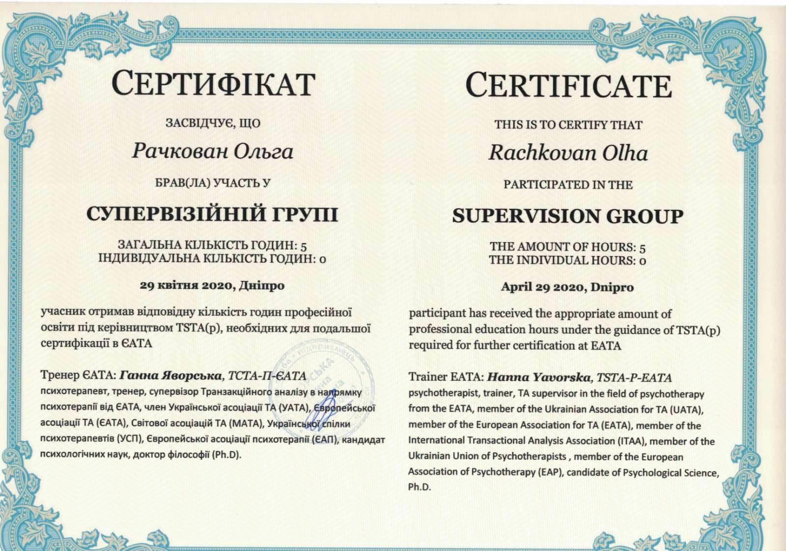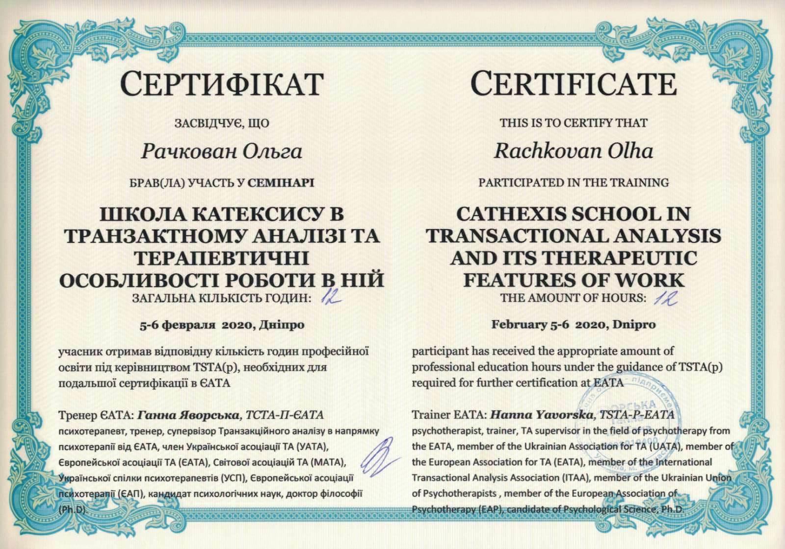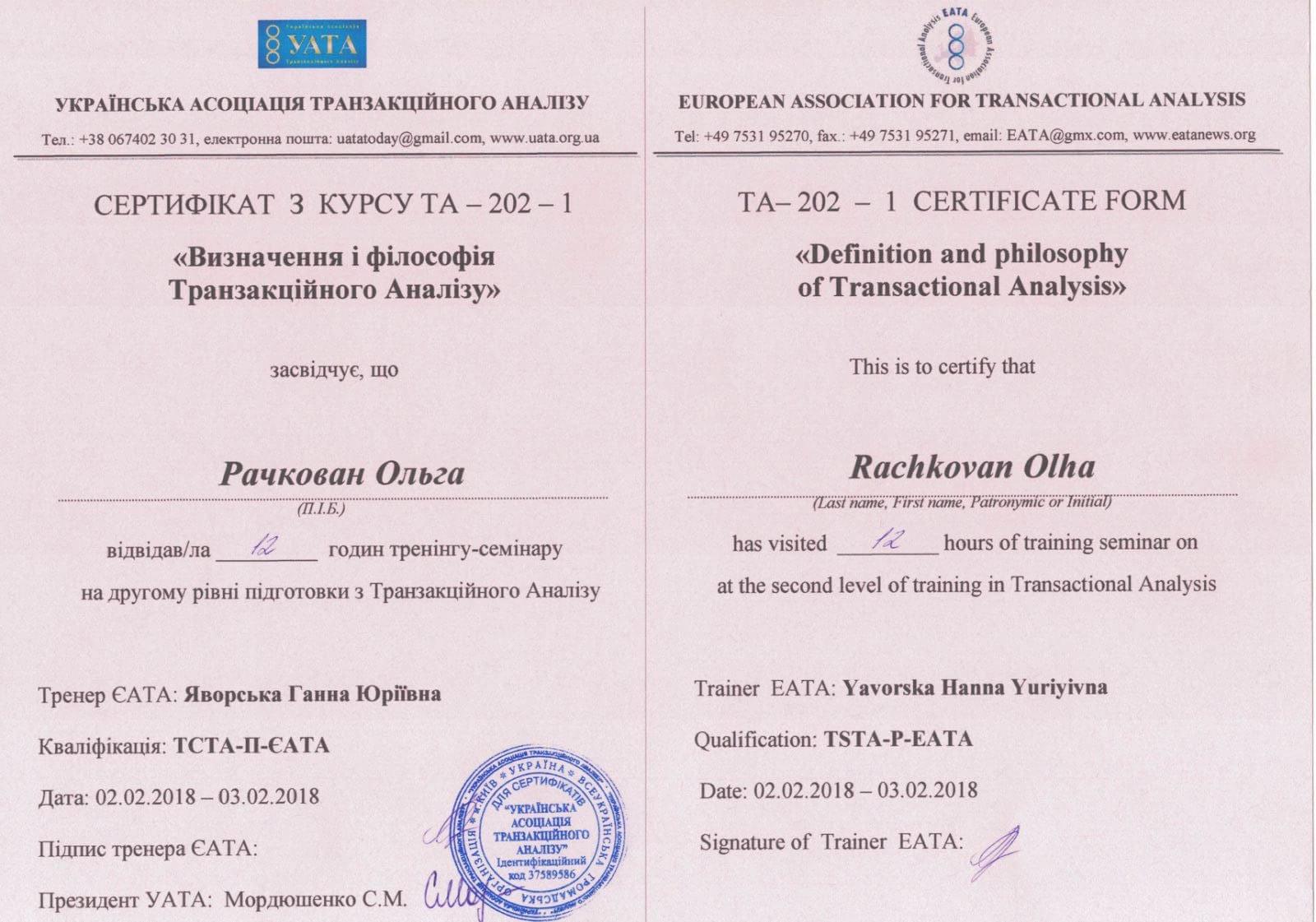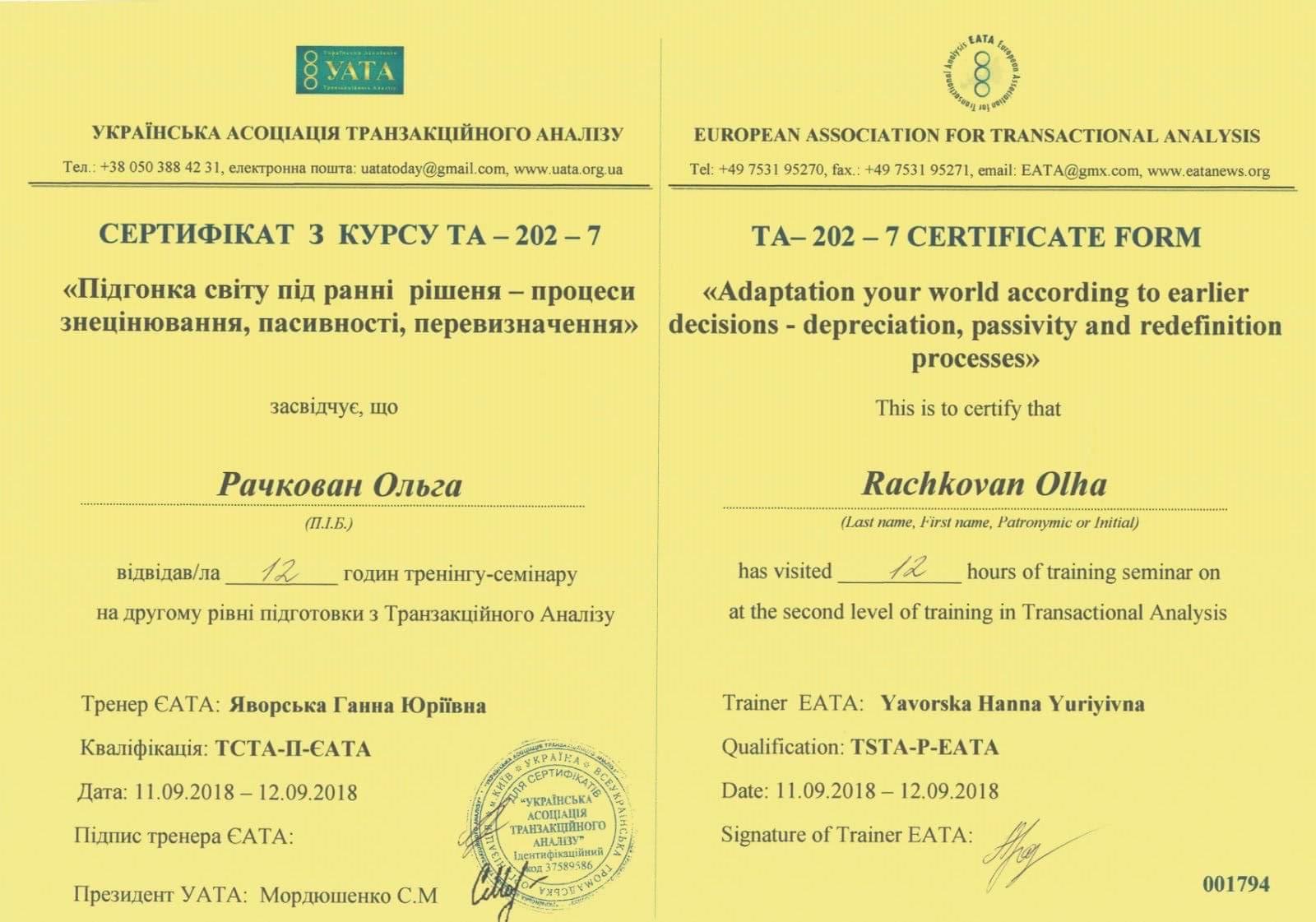 Переяслав-Хмельницкий государственный педагогический университет. (практический психолог). Украинская Ассоциация Транзактного Анализа (психотерапевт). Когнитивно-Поведенческая Терапия (психолог).