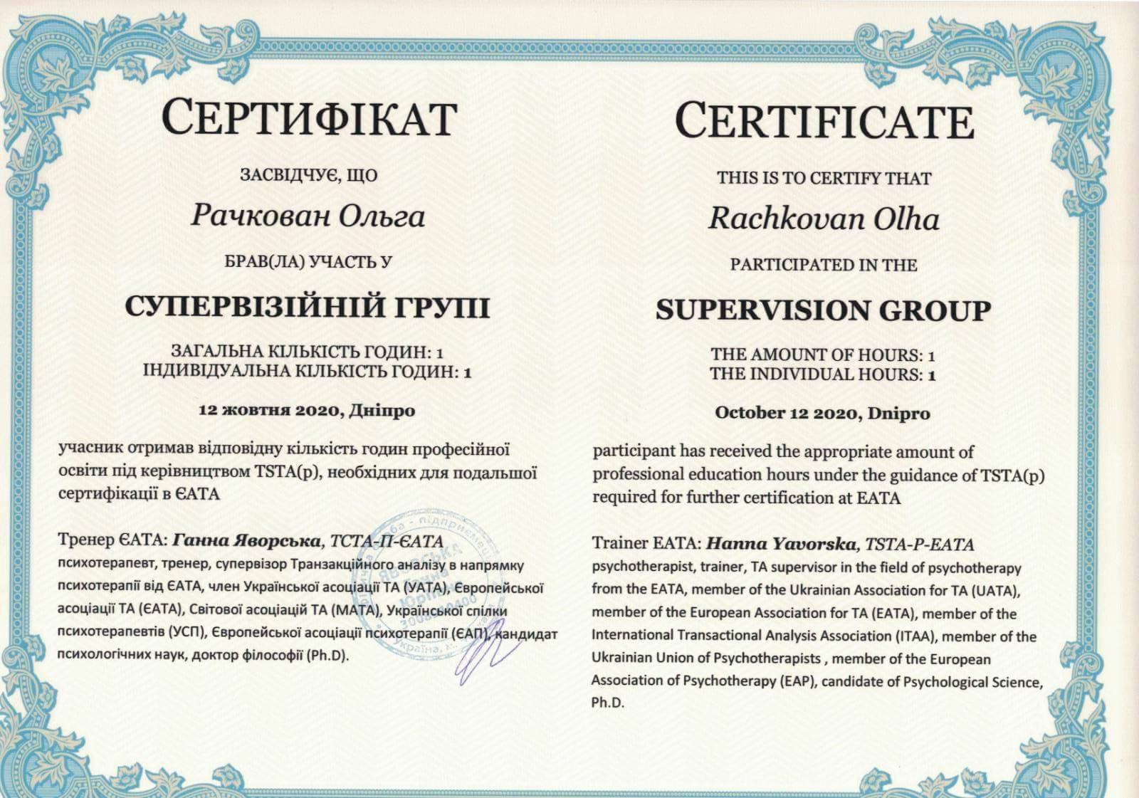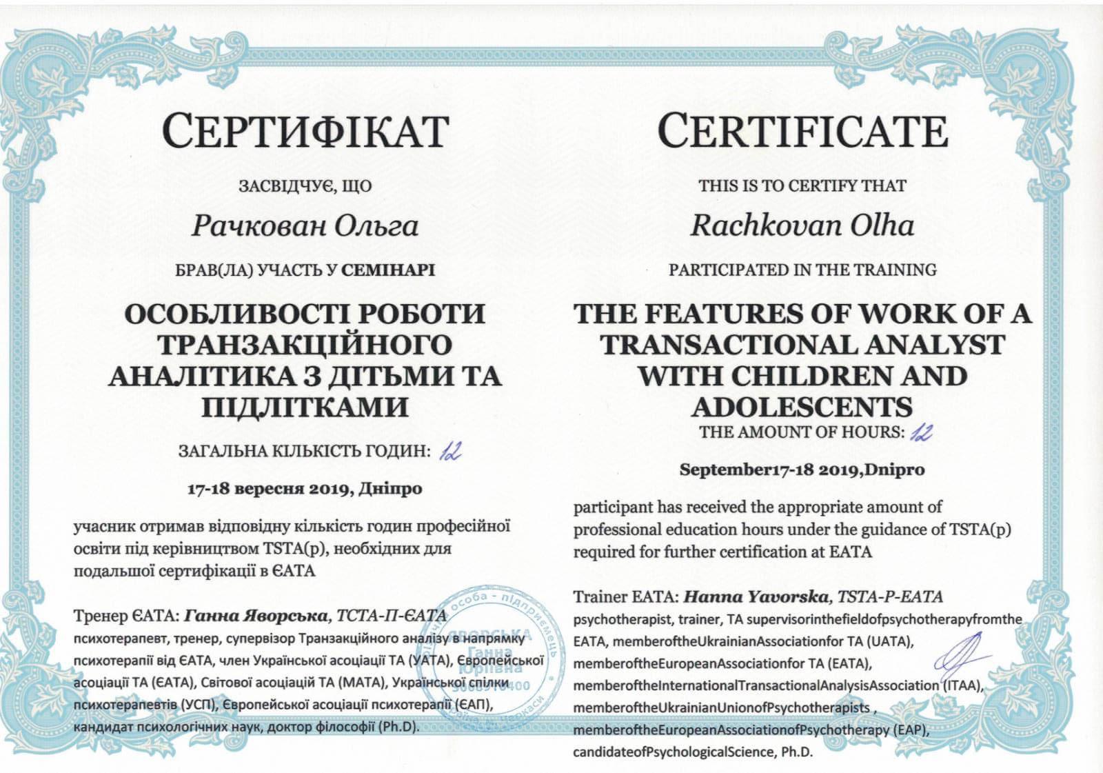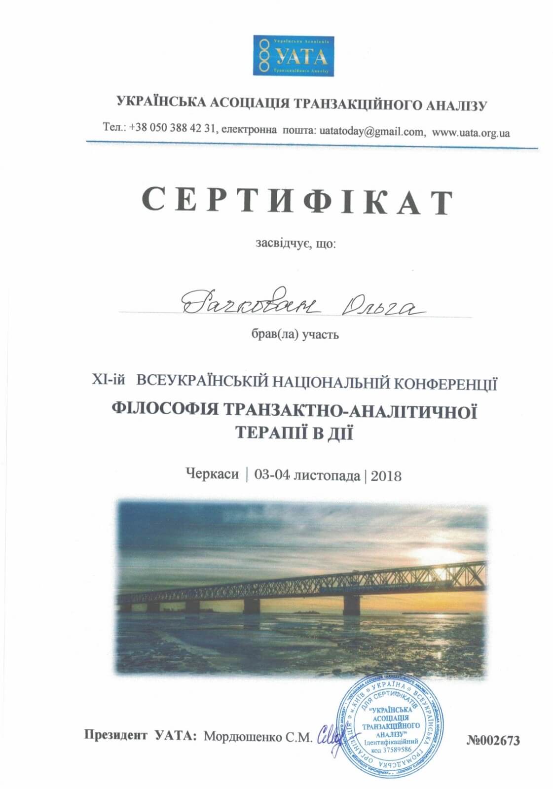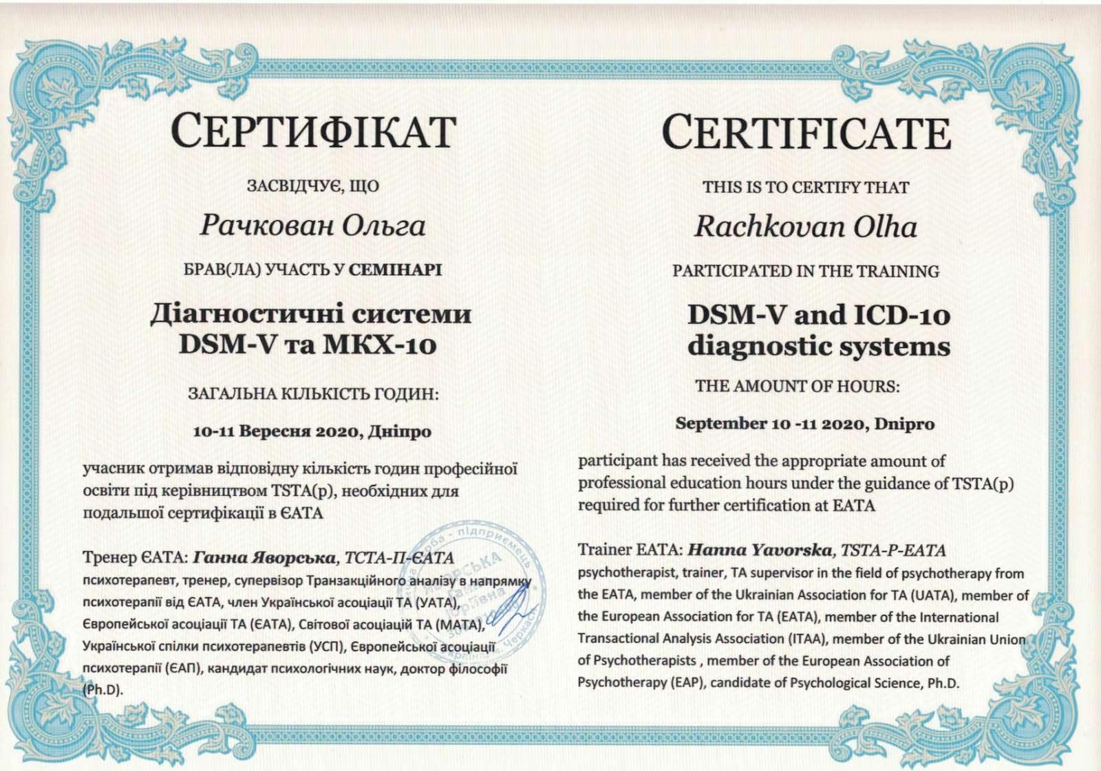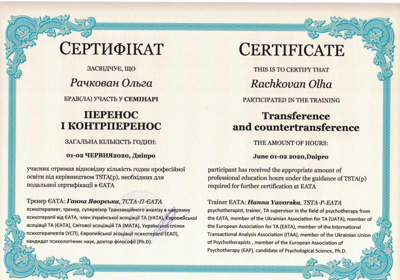 Переяслав-Хмельницкий государственный педагогический университет. (практический психолог). Украинская Ассоциация Транзактного Анализа (психотерапевт). Когнитивно-Поведенческая Терапия (психолог).