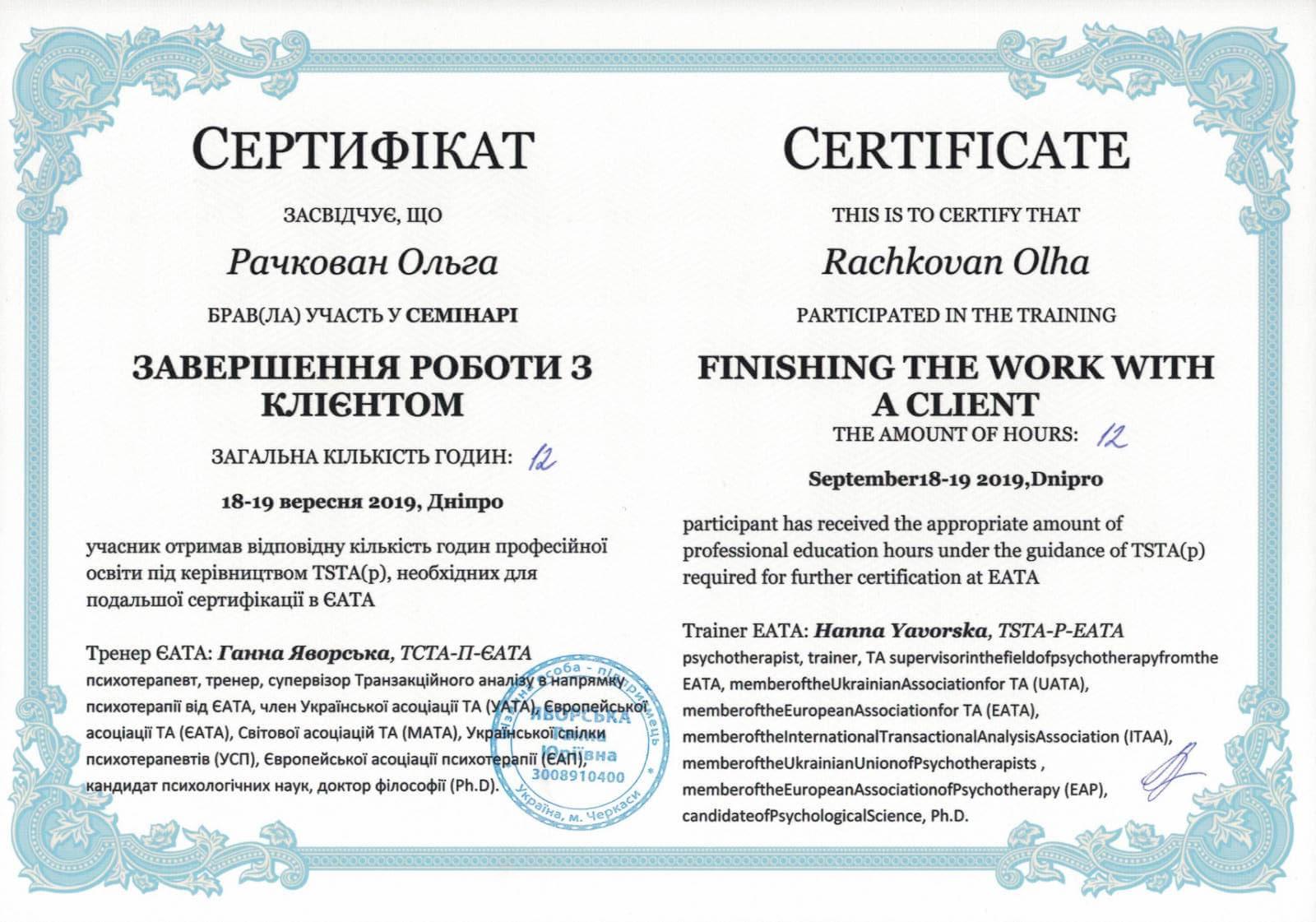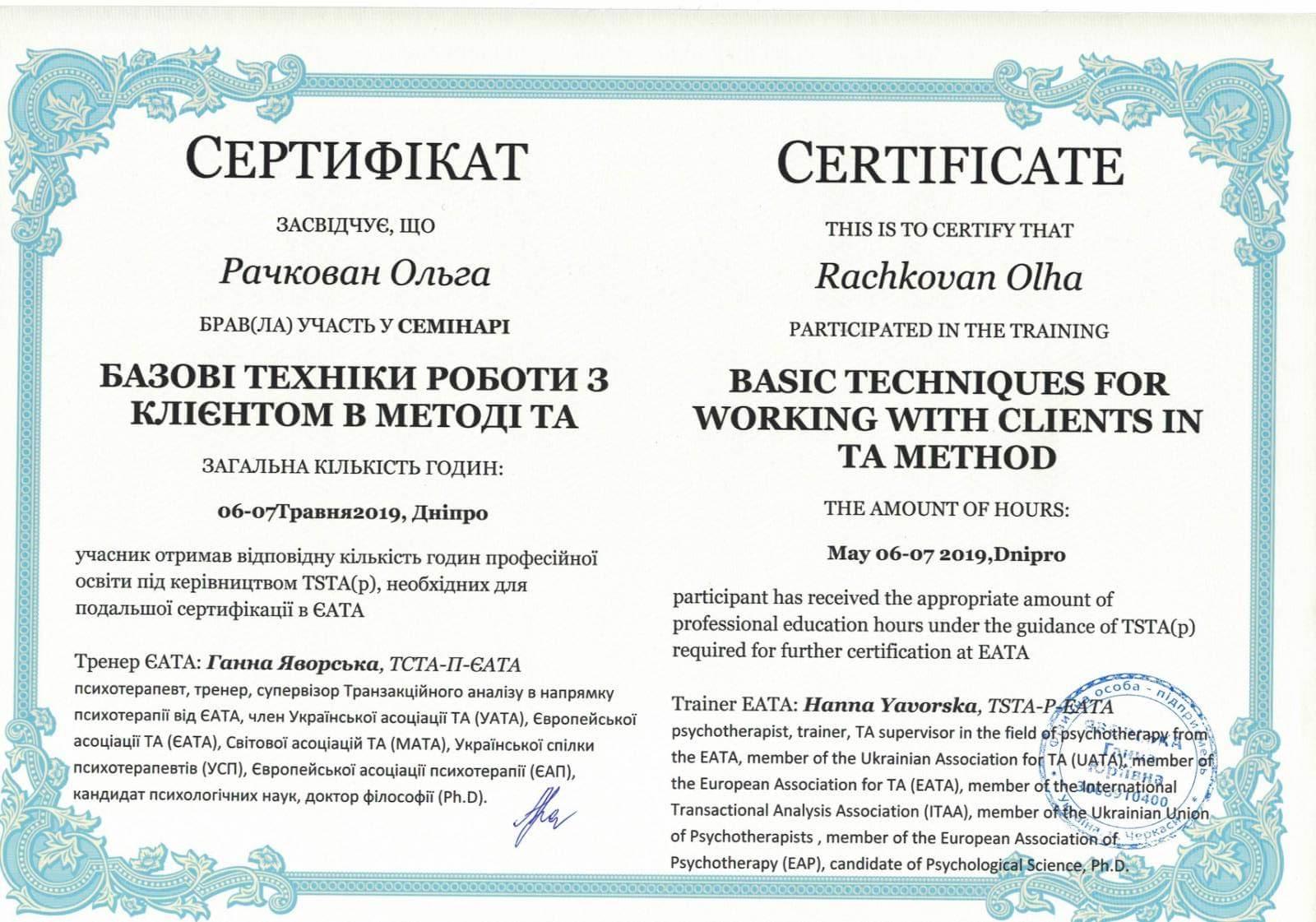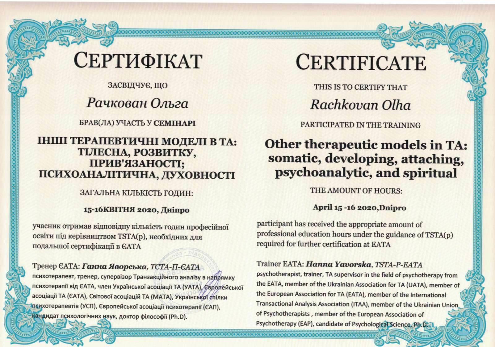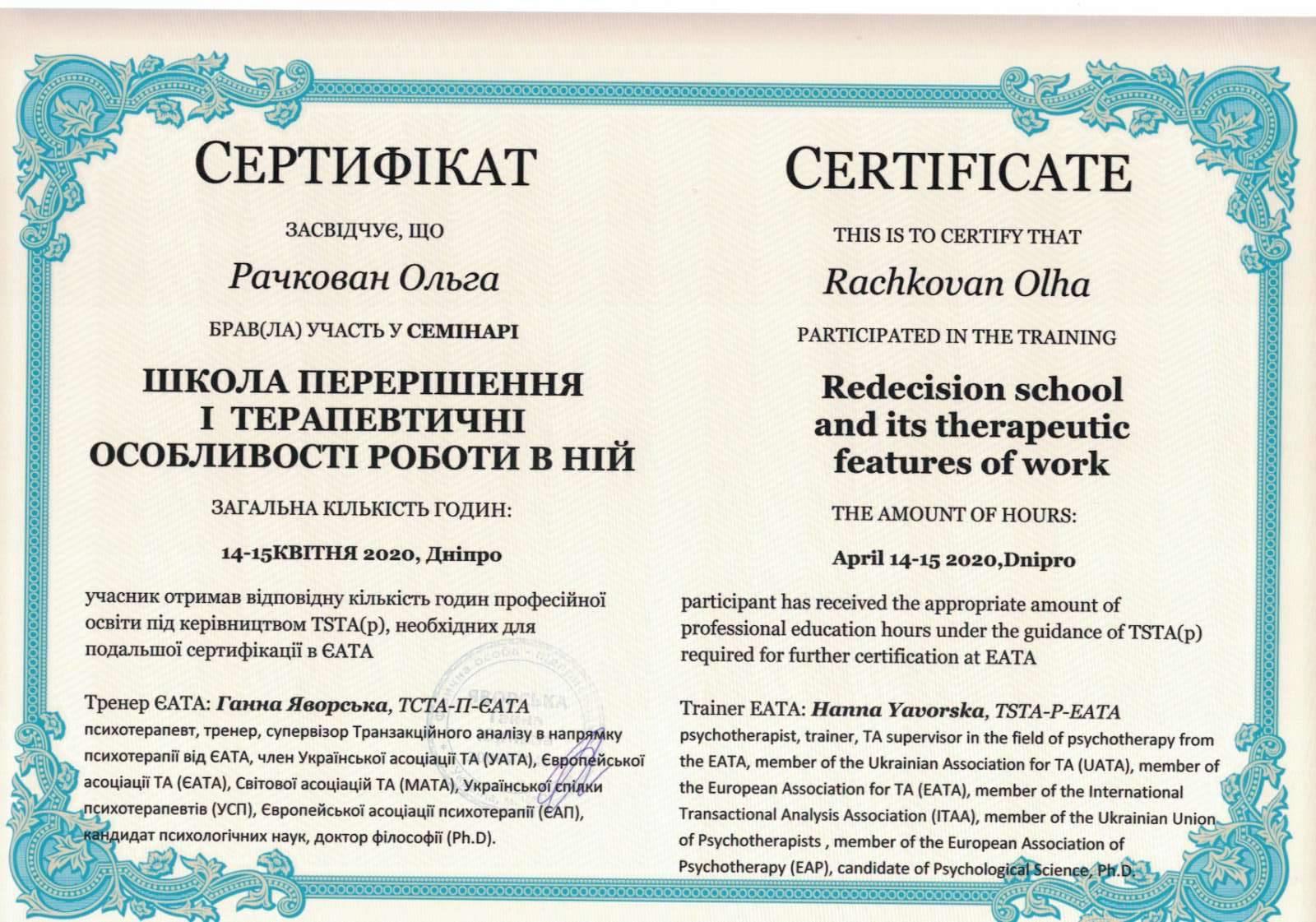 Переяслав-Хмельницкий государственный педагогический университет. (практический психолог). Украинская Ассоциация Транзактного Анализа (психотерапевт). Когнитивно-Поведенческая Терапия (психолог).