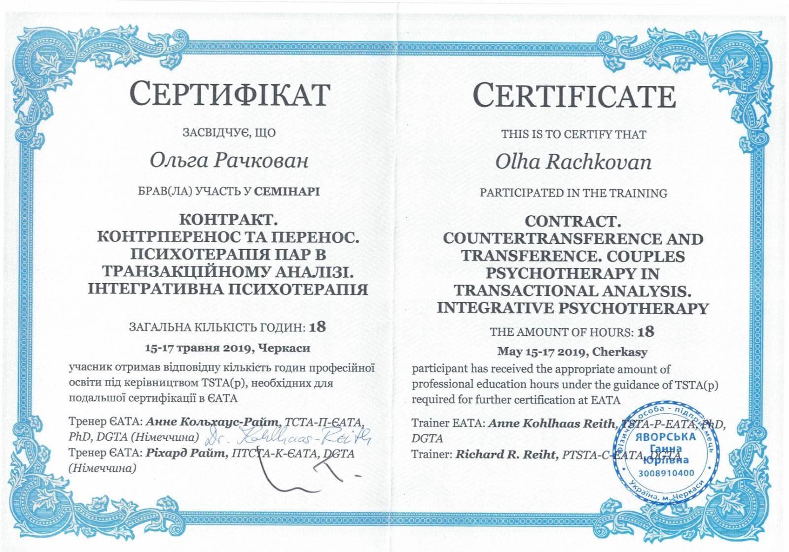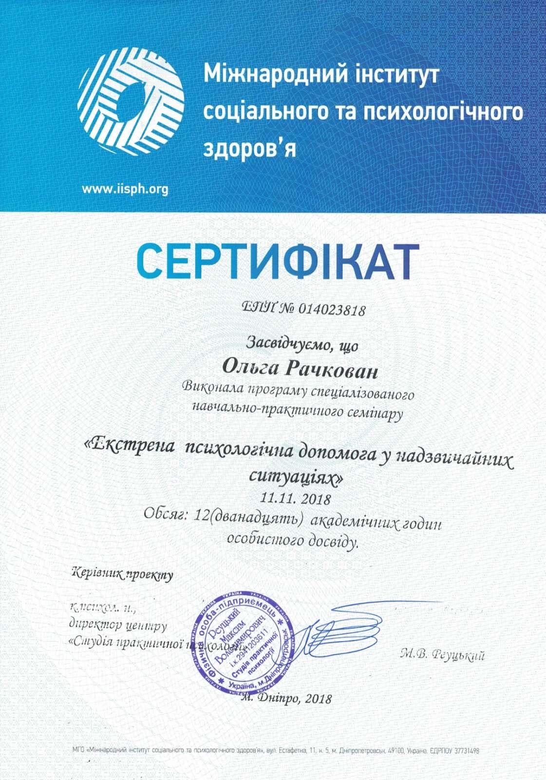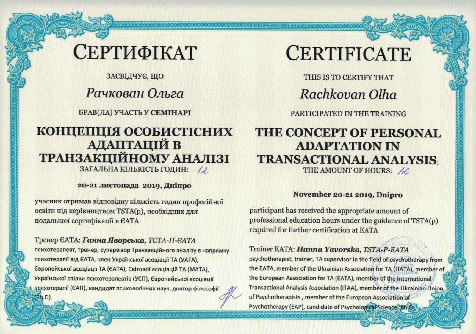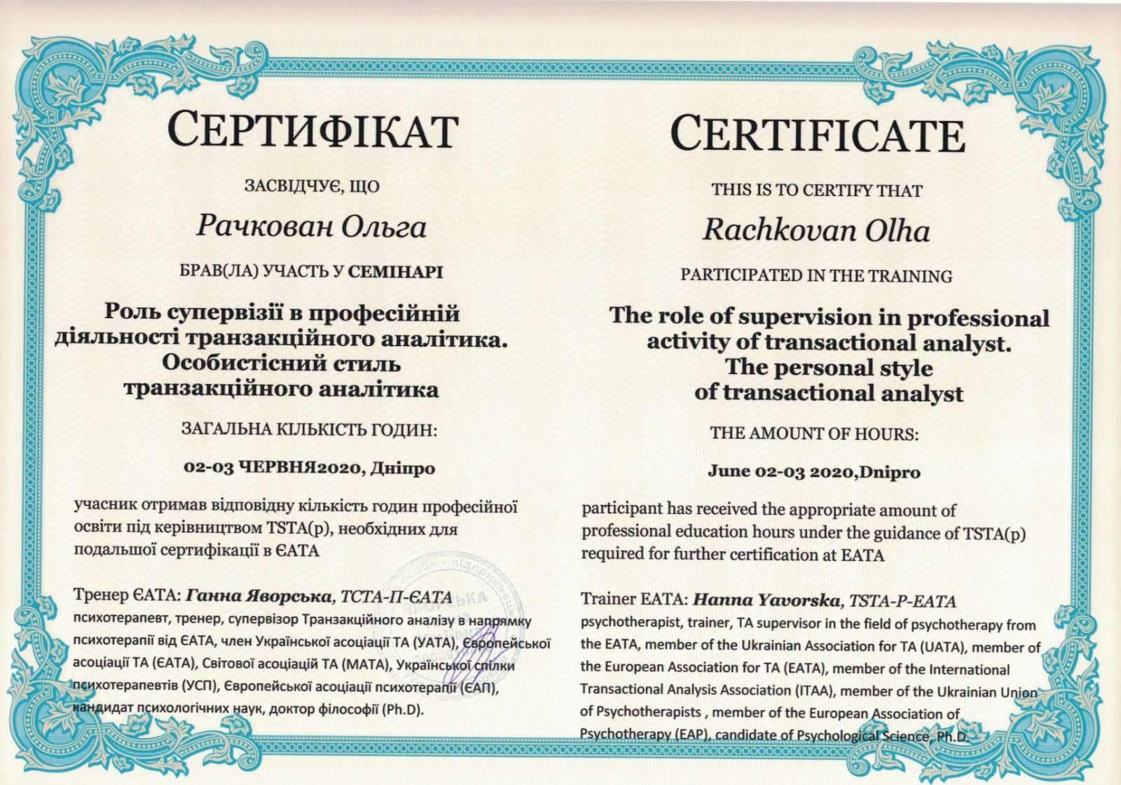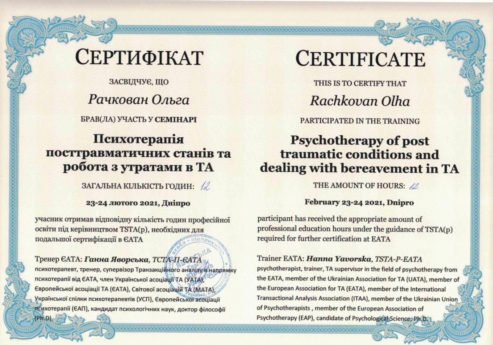 Переяслав-Хмельницкий государственный педагогический университет. (практический психолог). Украинская Ассоциация Транзактного Анализа (психотерапевт). Когнитивно-Поведенческая Терапия (психолог).