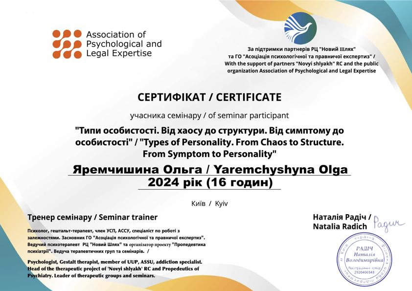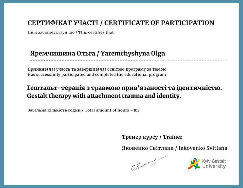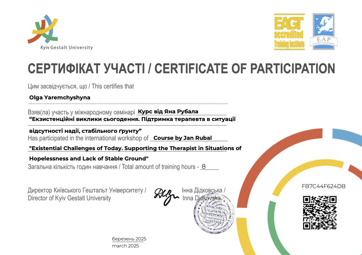 - Гештальт-терапевт в процессе обучения (2020-2025 ІІ уровень Киевского гештальт университета)