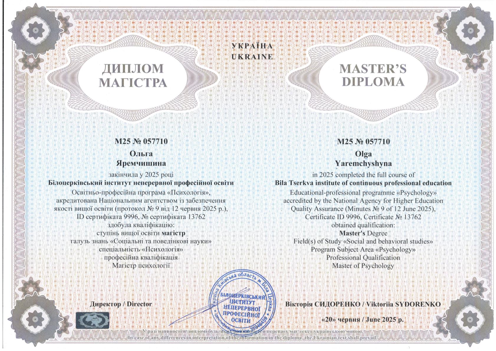 - практическая психология (2023-2025 Национальная Академия Педагогических Наук Украины ГЗПО "Университет менеджмента образования" Белоцерковский Институт Непрерывного профессионального образования)
