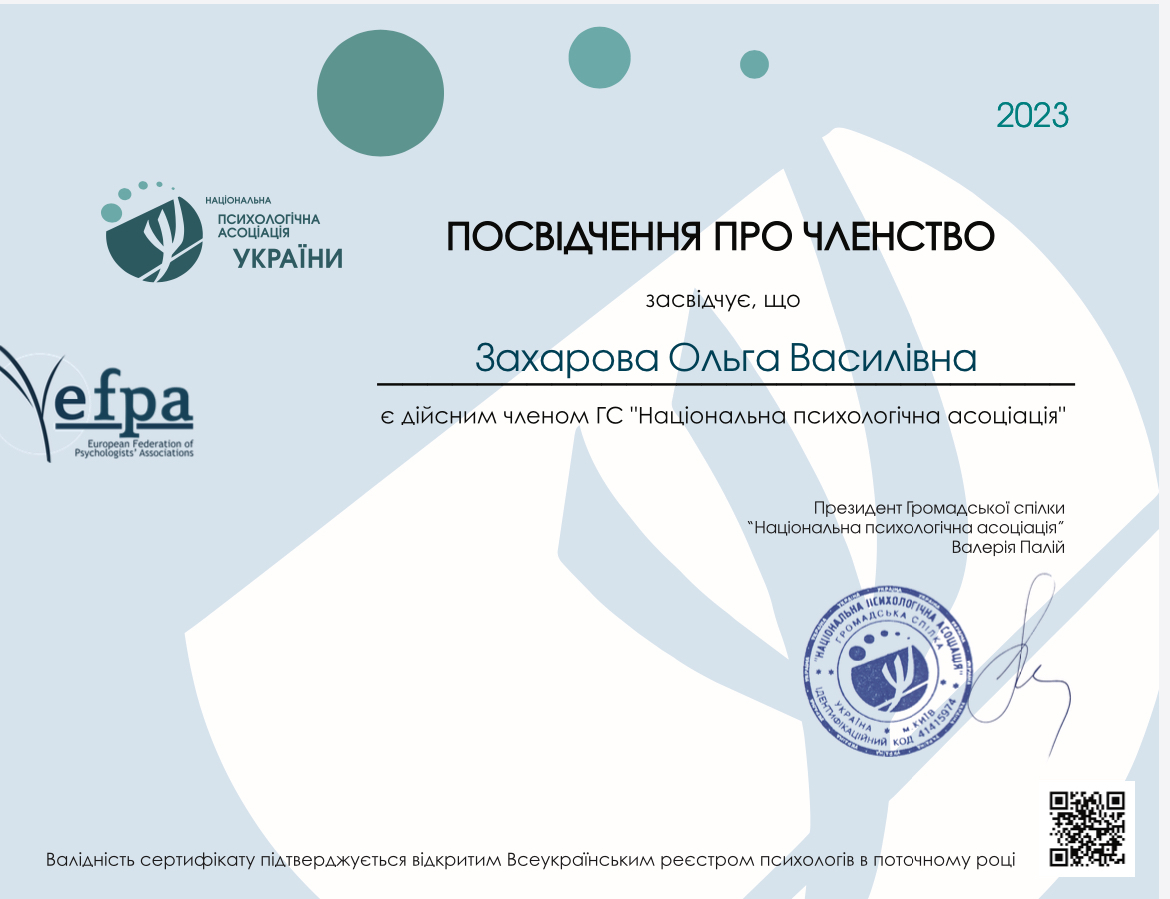 У меня высшее психологическое образование, магистр психологии, окончила Дрогобычский национальный педагогический университет им.И.Франко. Также я окончила Международный институт глубинной психологии в направлении психоанализа
