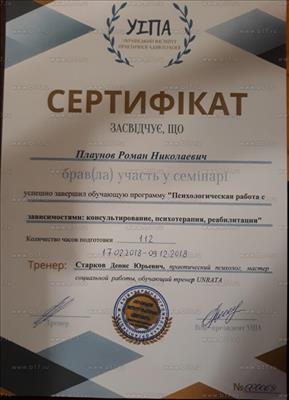 Прошел курс программы подготовки гештальт-терапевтов и сертифицировался как гештальт-терапевт (ОПП “Гештальт-подход”), 1798 часов. Также прошёл следующие специализации и курсы: “Психотерапия психологической травмы”, 120 часов; “Сексология в гештальт-подходе”, 150 часов; “Психологическая работа с зависимостями: консультирование, психотерапия, реабилитация”, 128 часов;