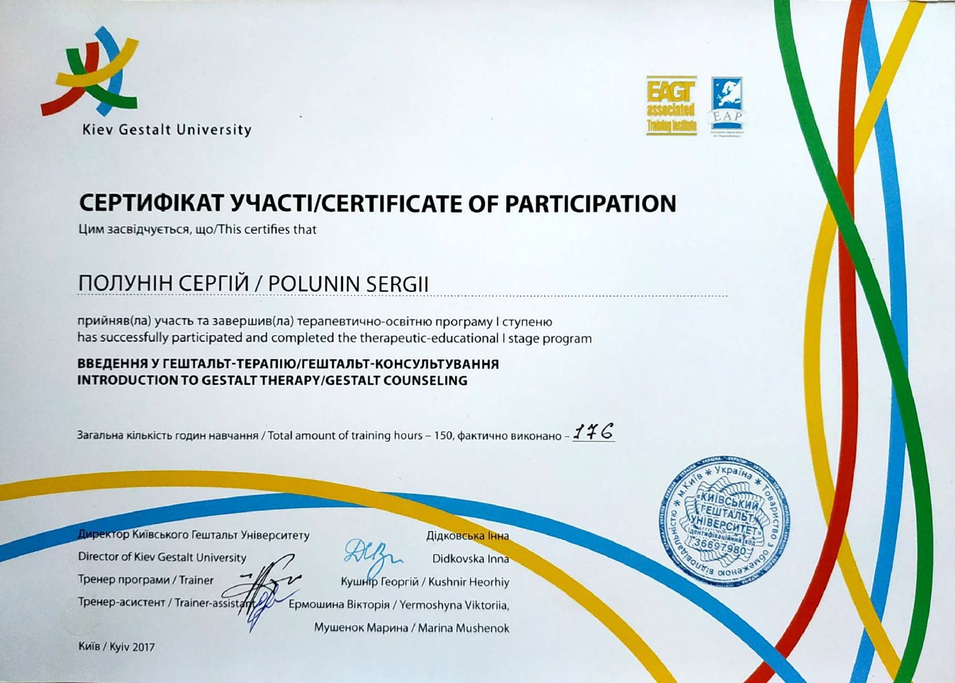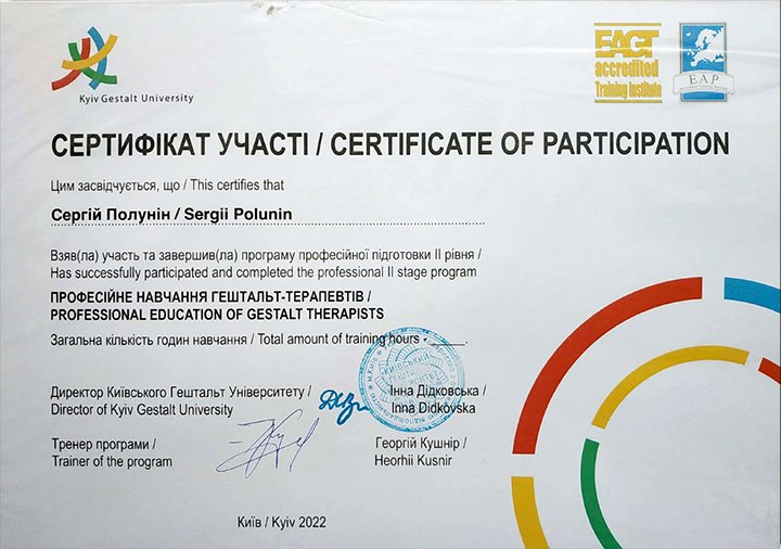 В этом году окончил МАУП (психология, магистр), в 2023 году окончил Киевский гештальт университет, имею специализацию по ведению групп
