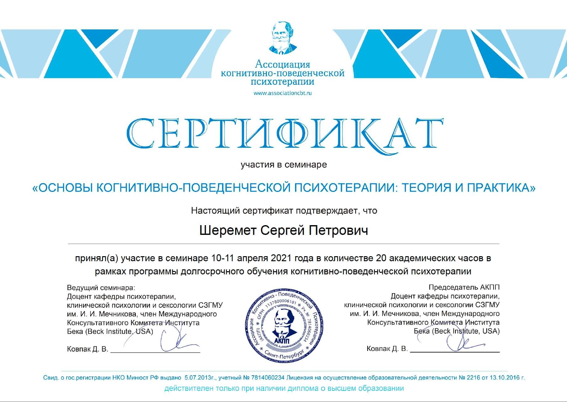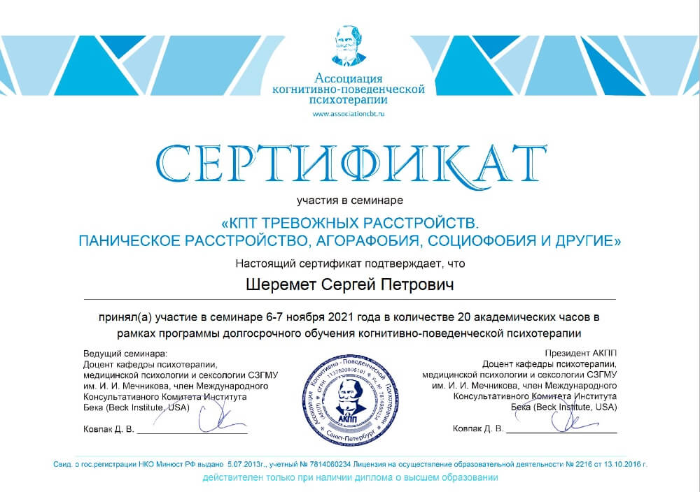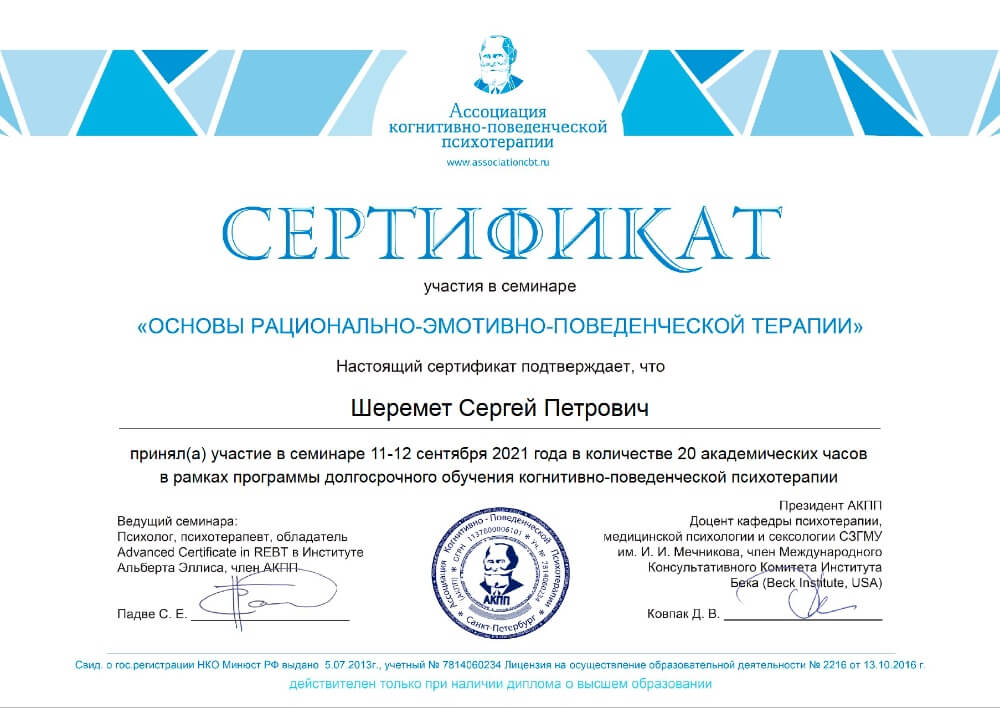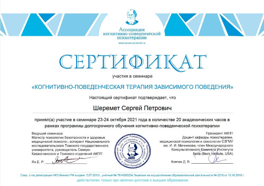 Базовый и продвинутый курс когнитивно-поведенческой психотерапии, курс семейного консультирования в когнитивно-поведенческом подходе, образование мультимодального супервизора, курс введения в терапию сфокусированную на сострадании (CFT) от автора метода Пола Гилберта, полное образование гештальт-терапевта по стандартам Европейской ассоциации гештальт-терапии, семинары отечественных и зарубежных специалистов