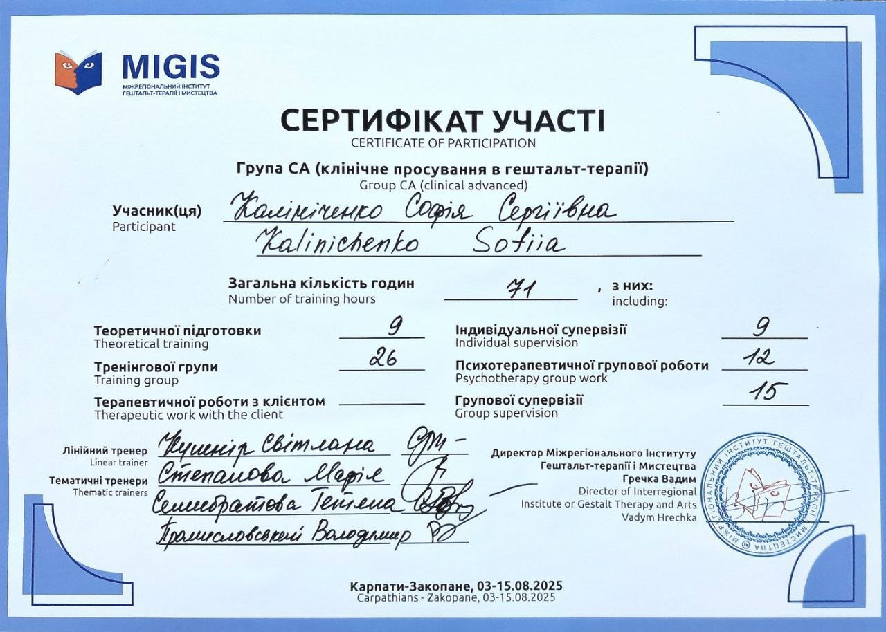 Еще с подросткового возраста, меня начала интересовать психология, я была в личной терапии по разным направлениям, но настоящие изменения почувствовала, когда начала учиться на гештальт-терапевтку.