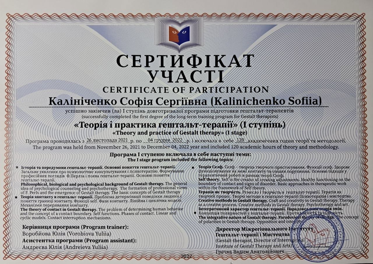 Привет! Меня зовут София, я работаю в методе гештальт-терапии.