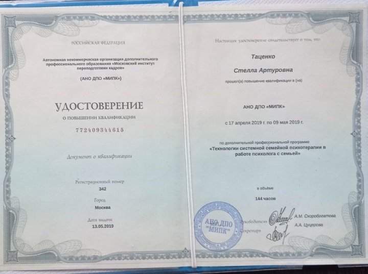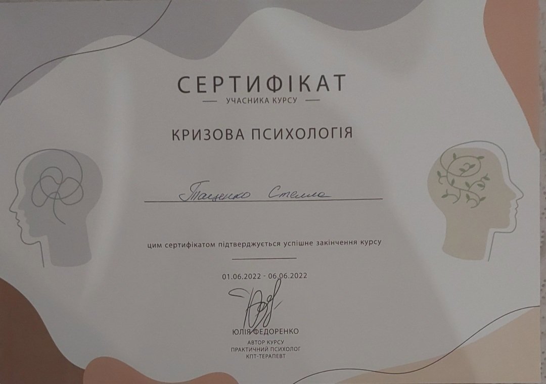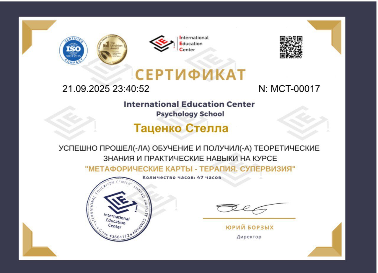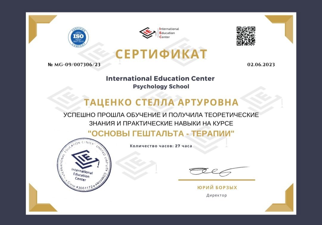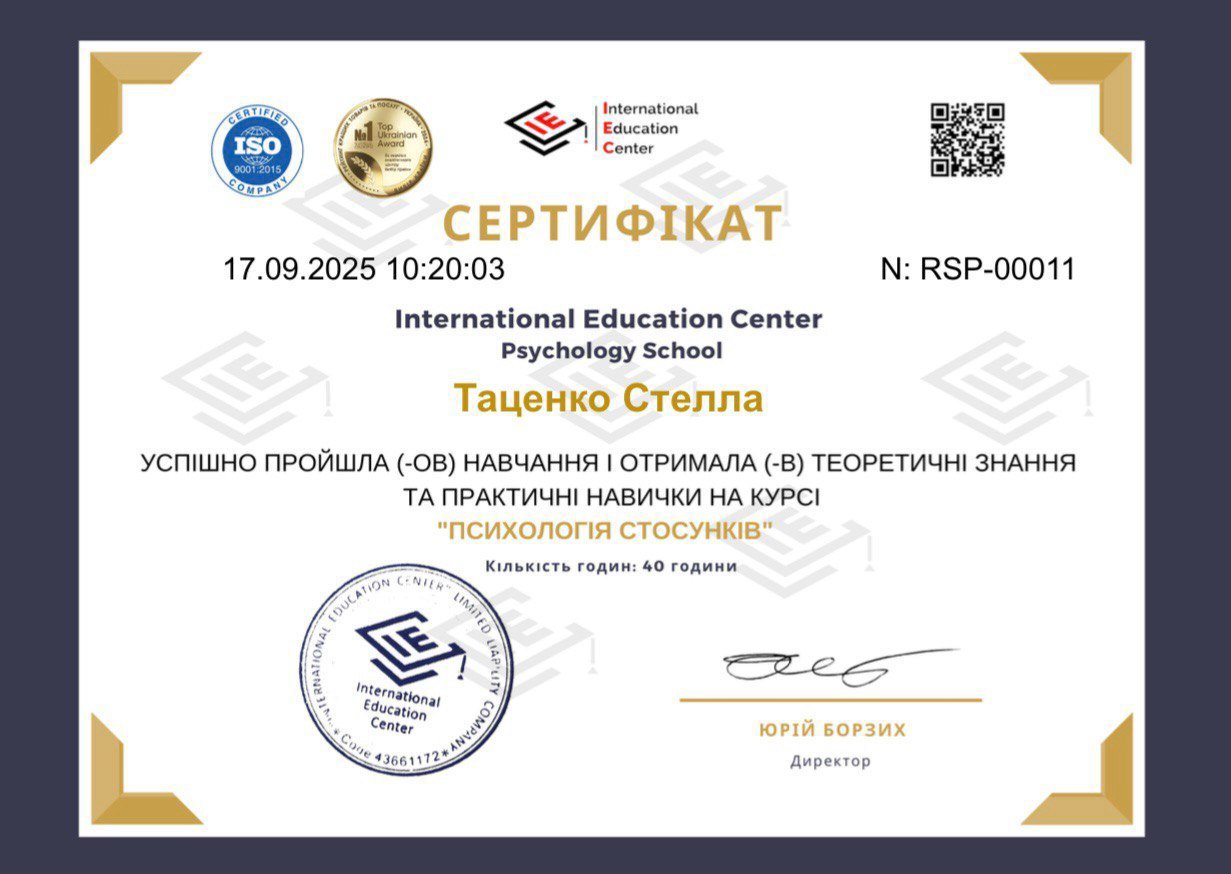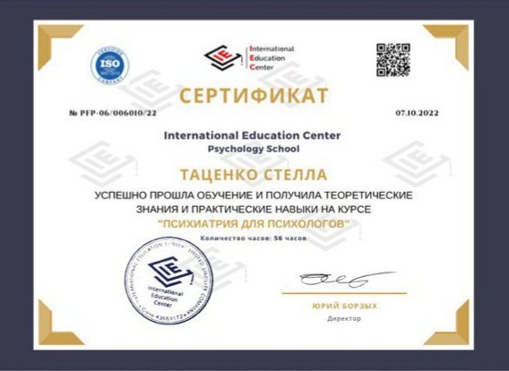 Днепропетровский гуманитарный университет ,Московский институт переподготовке кадров,International Educahon Center ,International Academy of Practical Psychology,Integral Coaching School , Osnova и другое