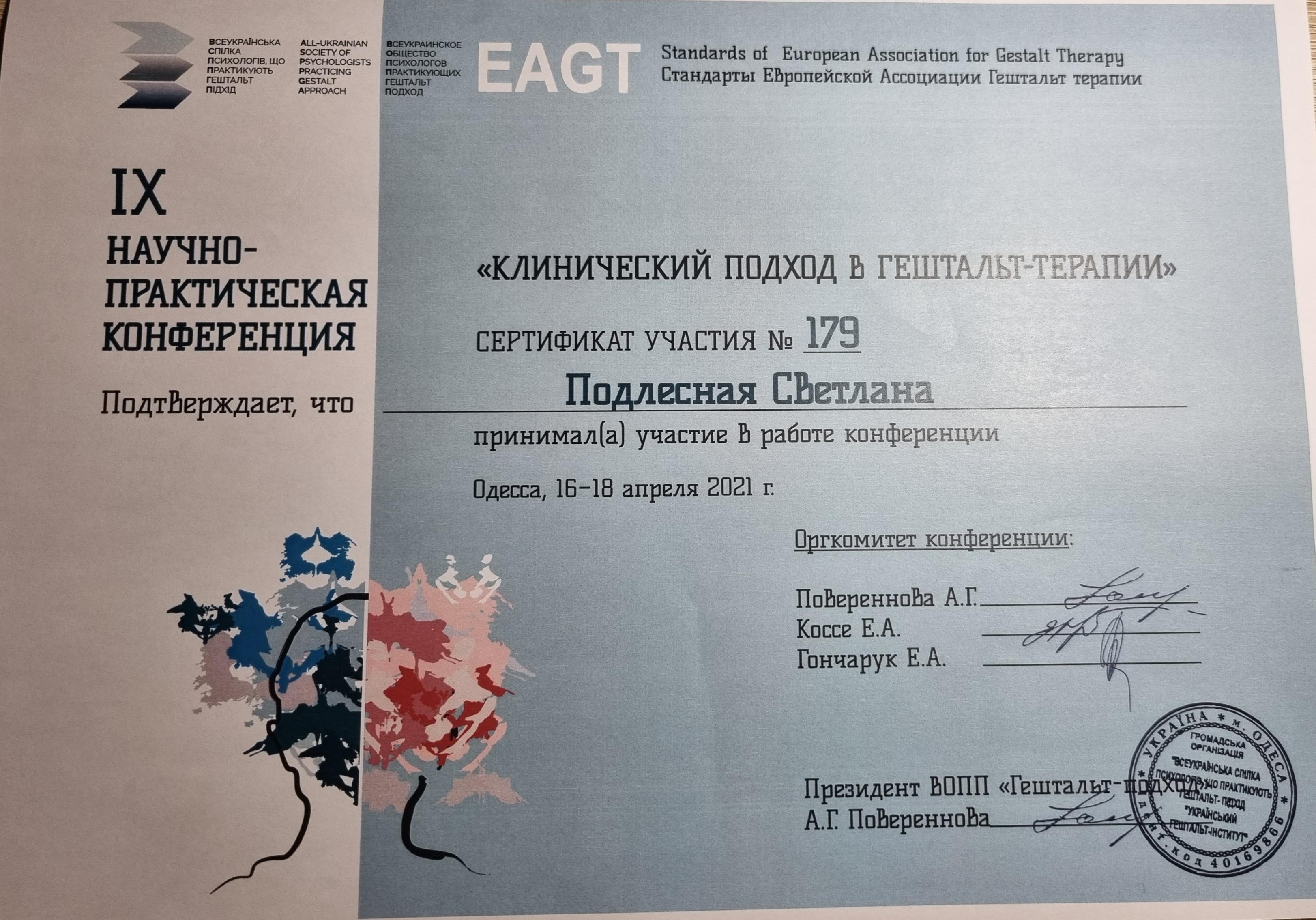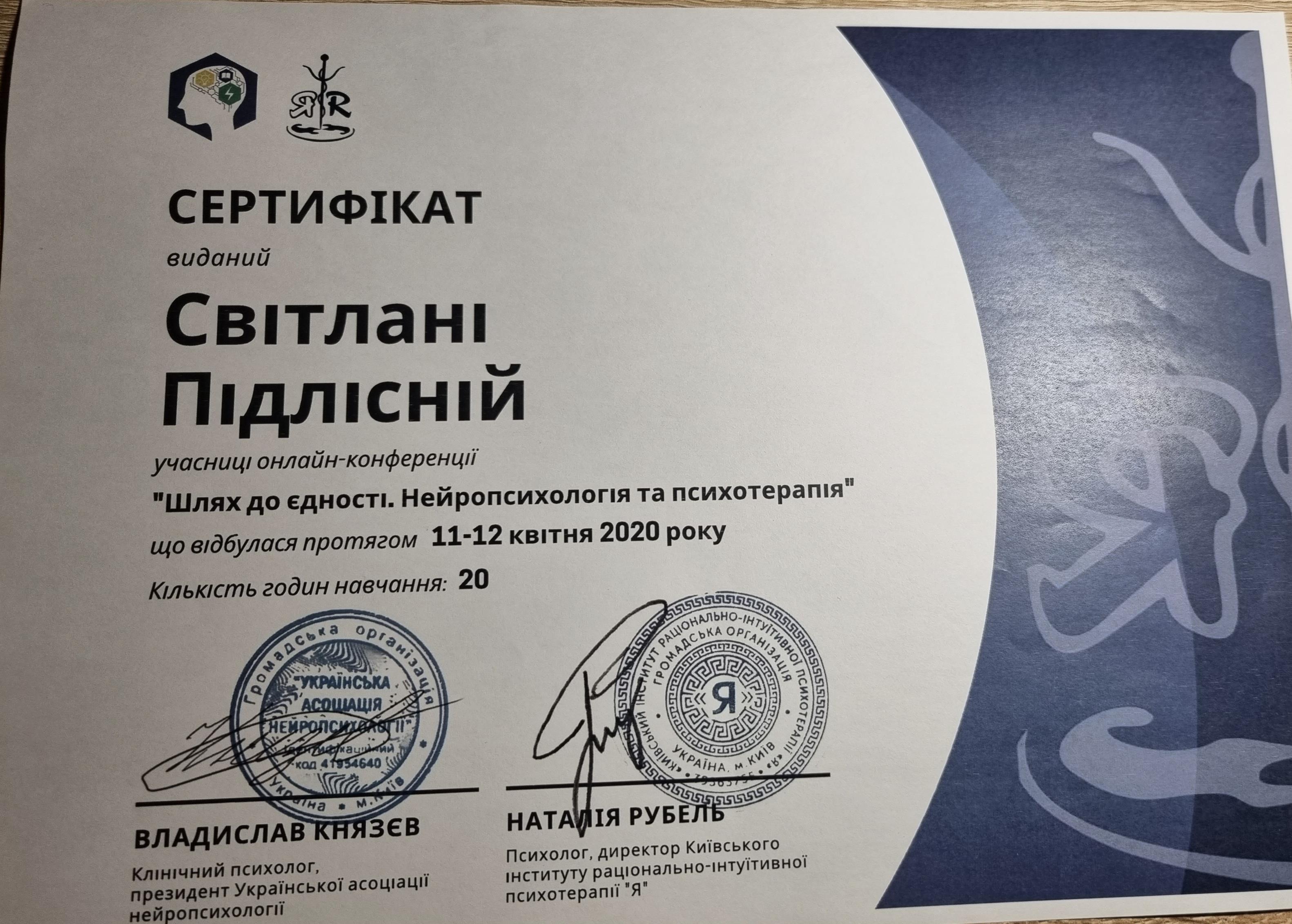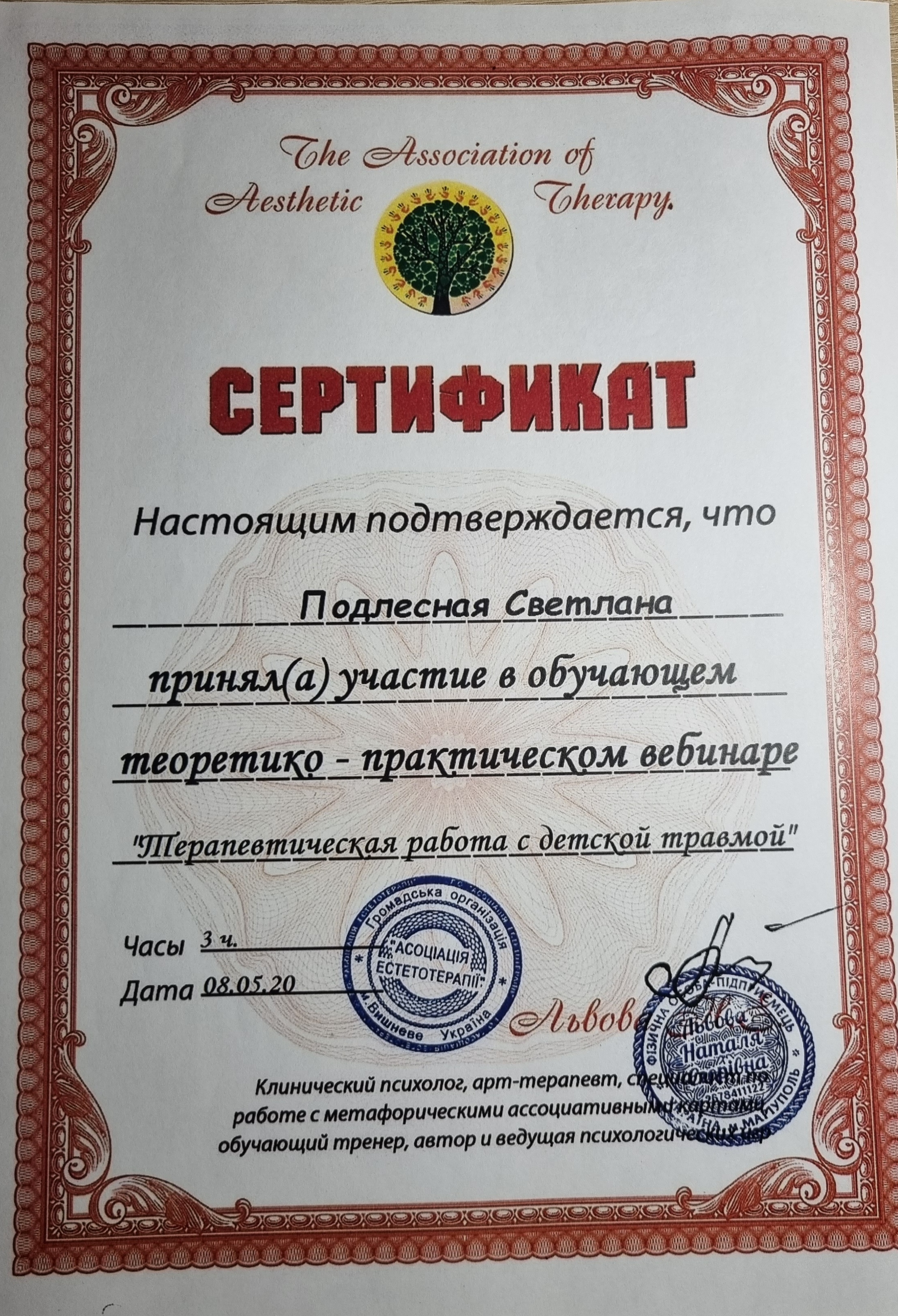 Южноукраинский национальный педагогический университет им. К.Д. Ушинского, магистр психологии 2020 год, в процессе обучения на второй ступени гештальт-терапевта в ВОППГП, специализация по системному подходу в работе с семьей