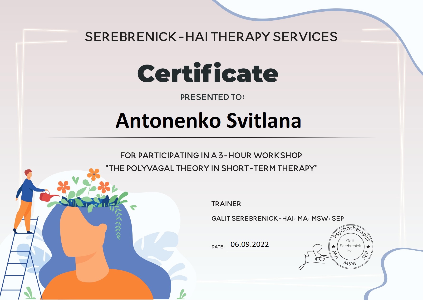 – Neoiatria: Курс «Углубленный курс психиатрии для психологов и психотерапевтов» (2021-2022);
