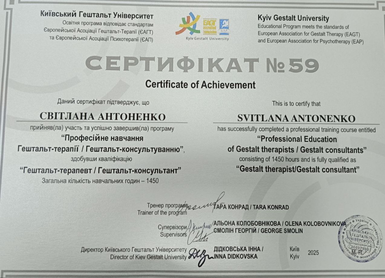 Давайте знакомиться). Я дипломированный психолог и сертифицированный гештальт-терапевт. Опыт психологической работы – 11 лет, в том числе в гештальт-терапевтическом подходе – 6 лет.