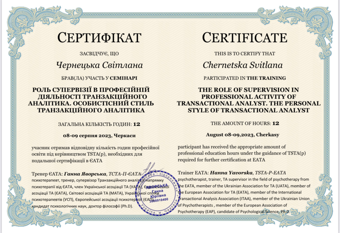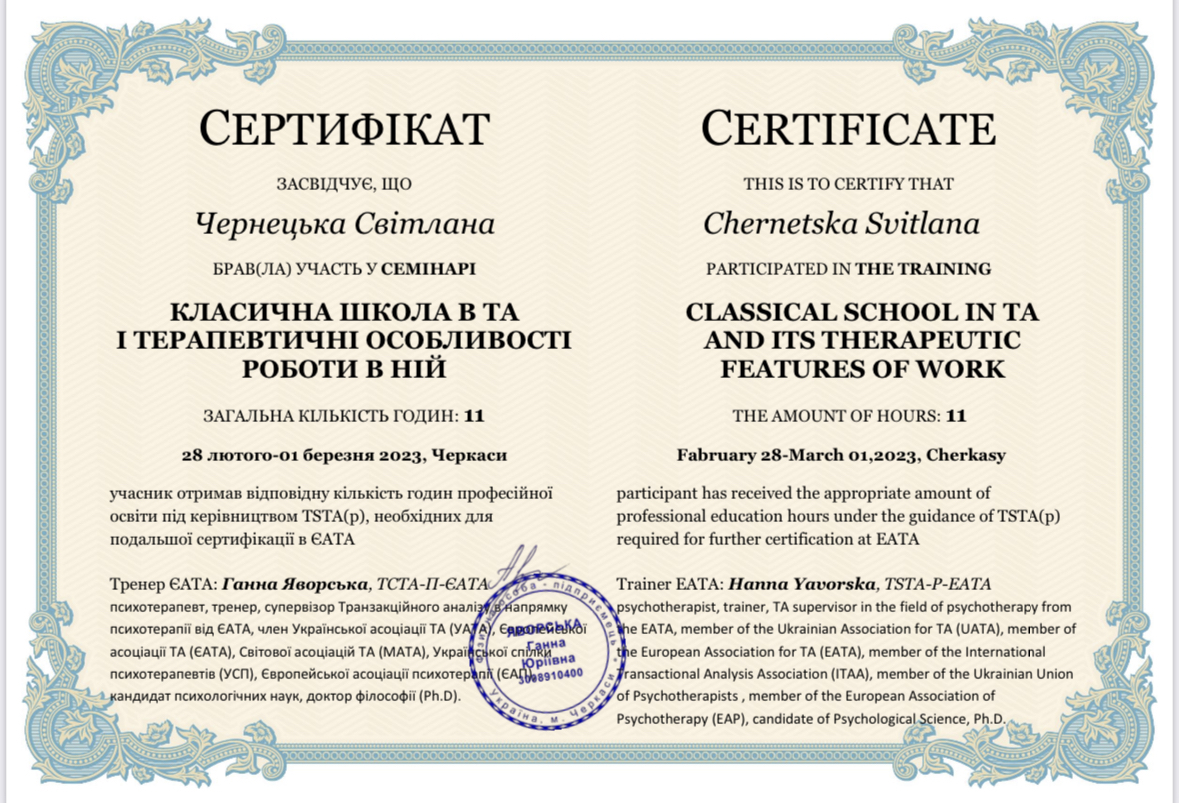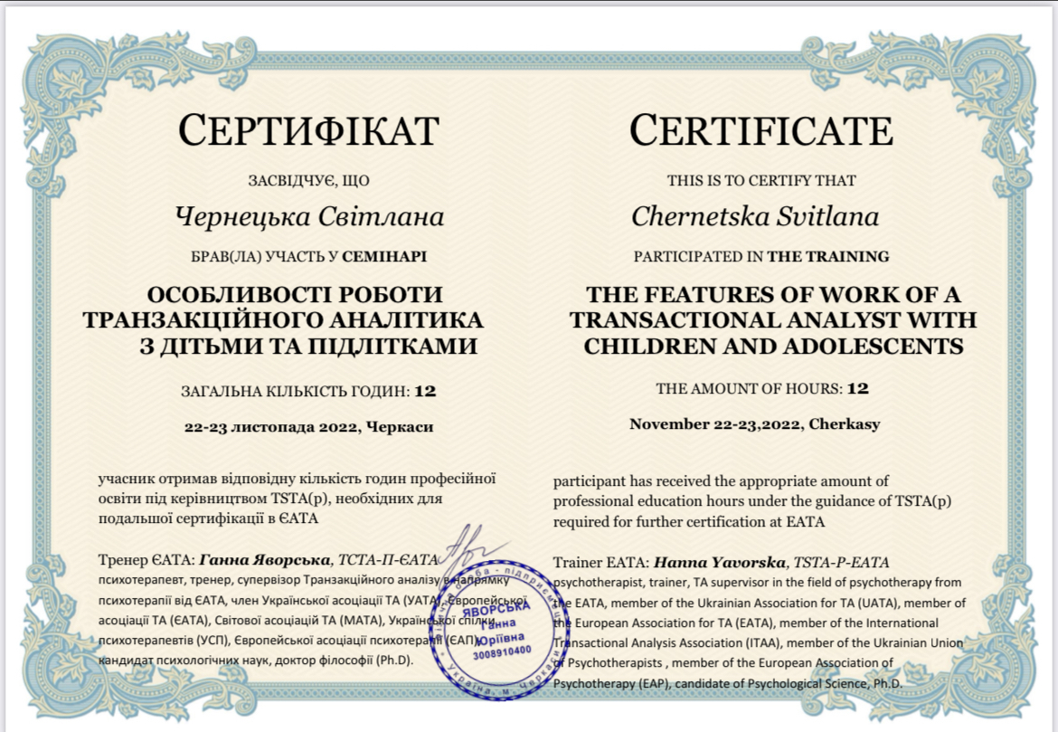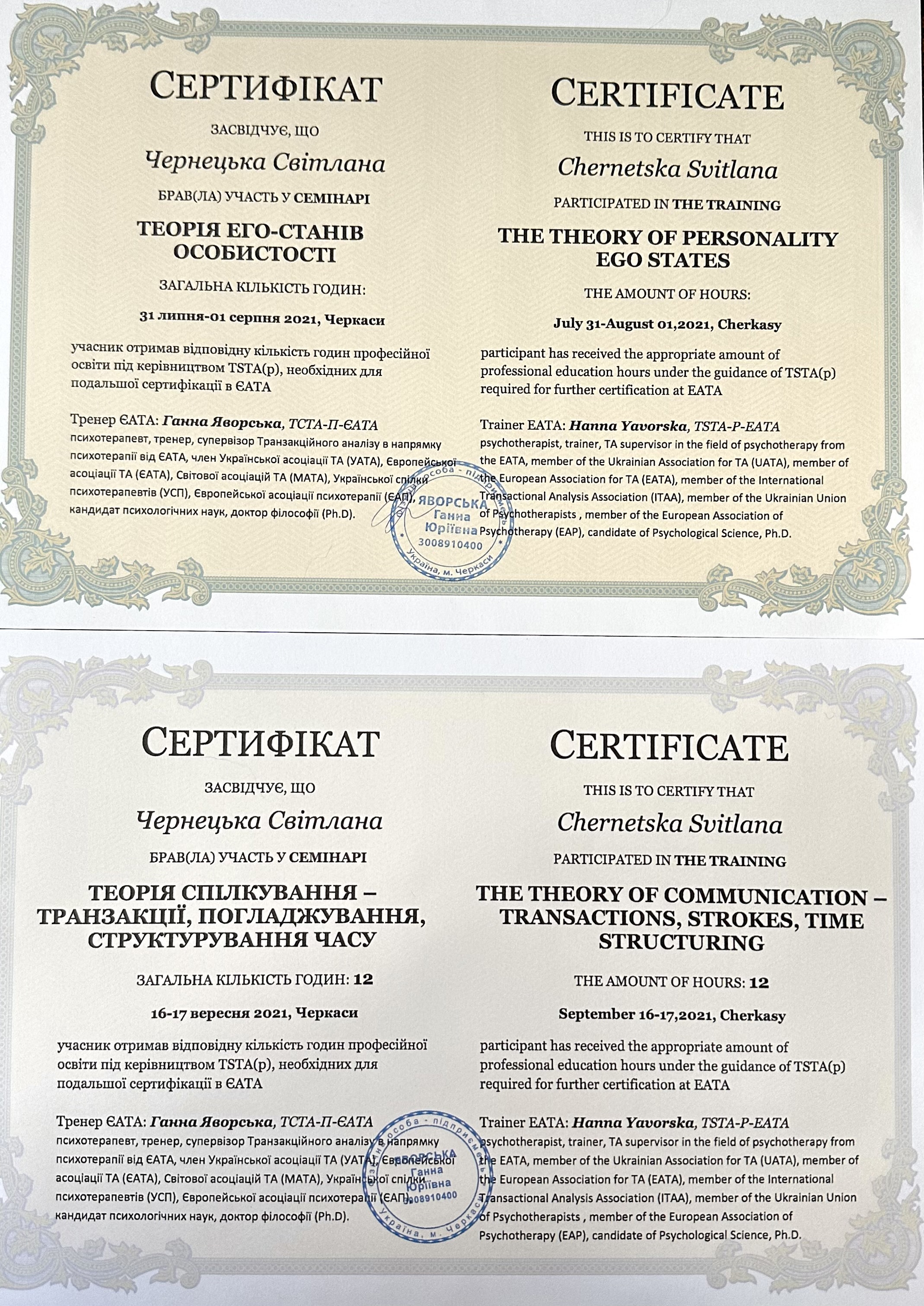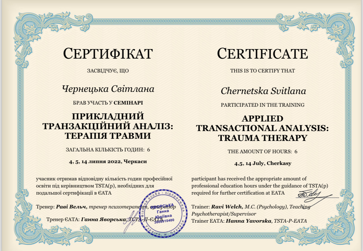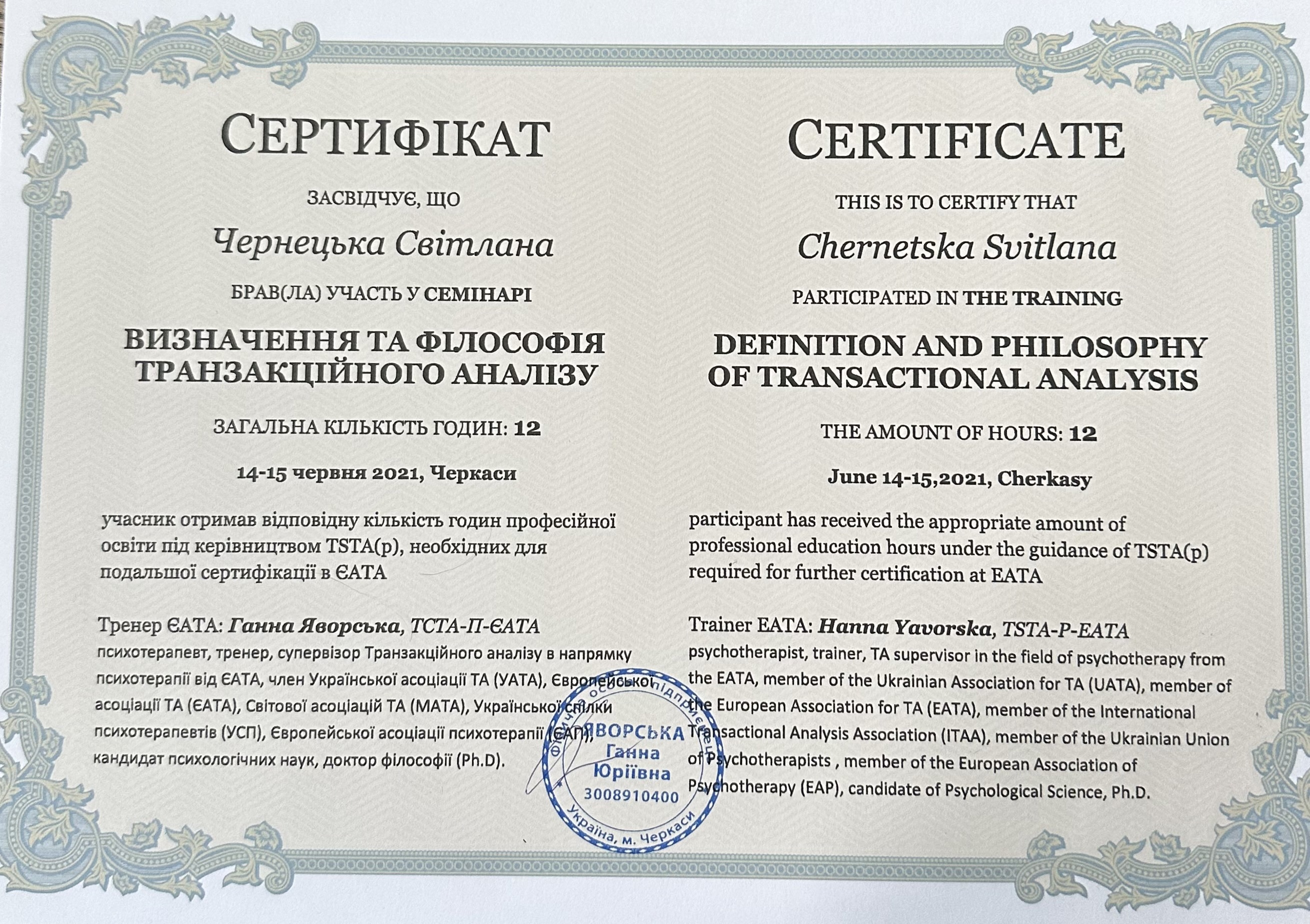 * Психолог-практик в психотерапевтическом методе транзакционного анализа. Профессиональное 4-летнее образование, член Европейской Ассоциации транзакционного анализа (EATA), член Украинской ассоциации транзакционного анализа (UATA), член Национальной психологической ассоциации (NPA).