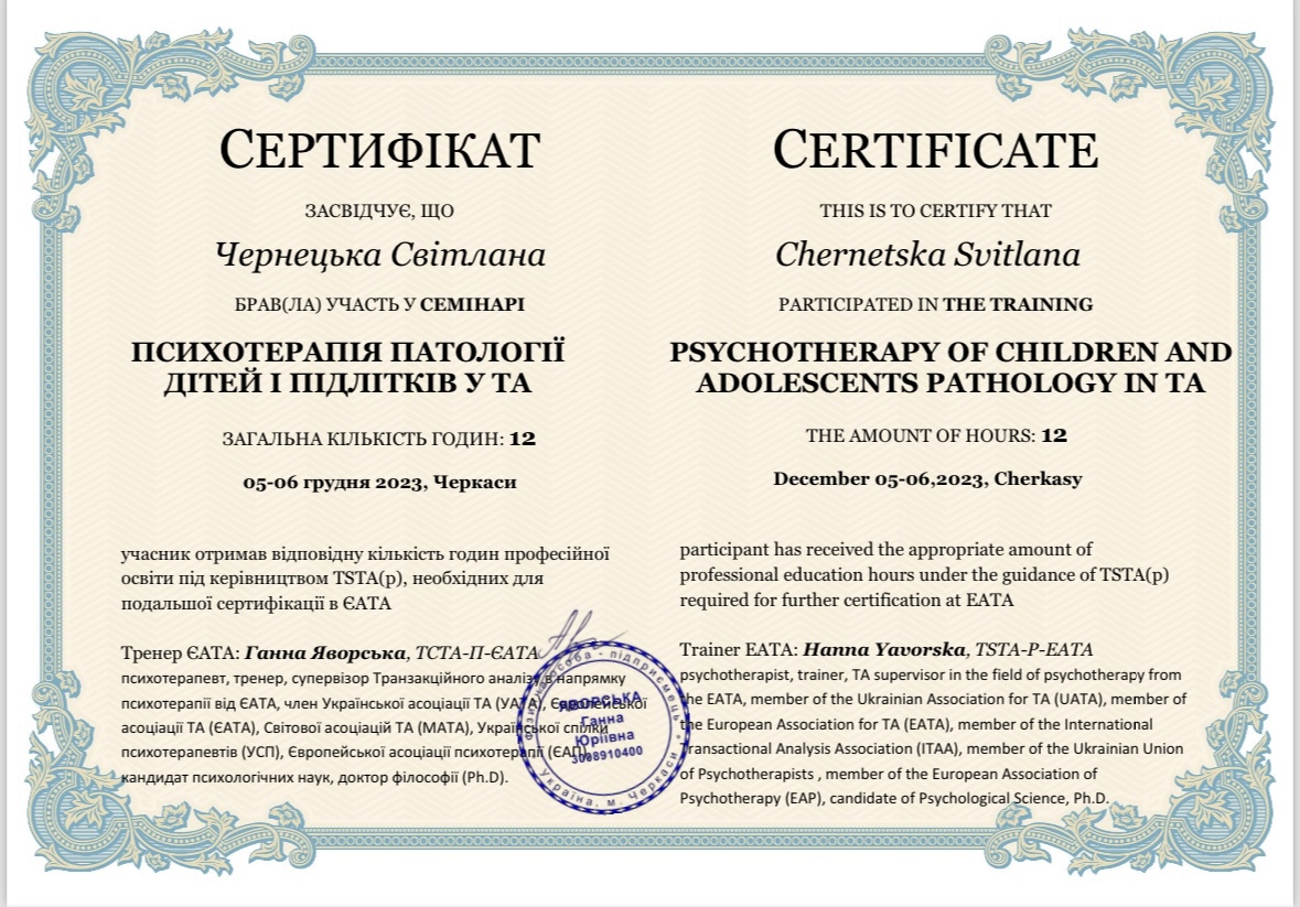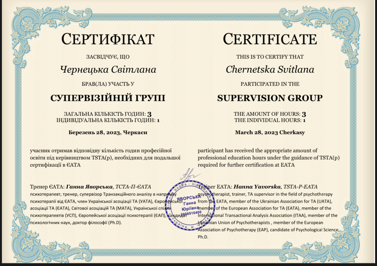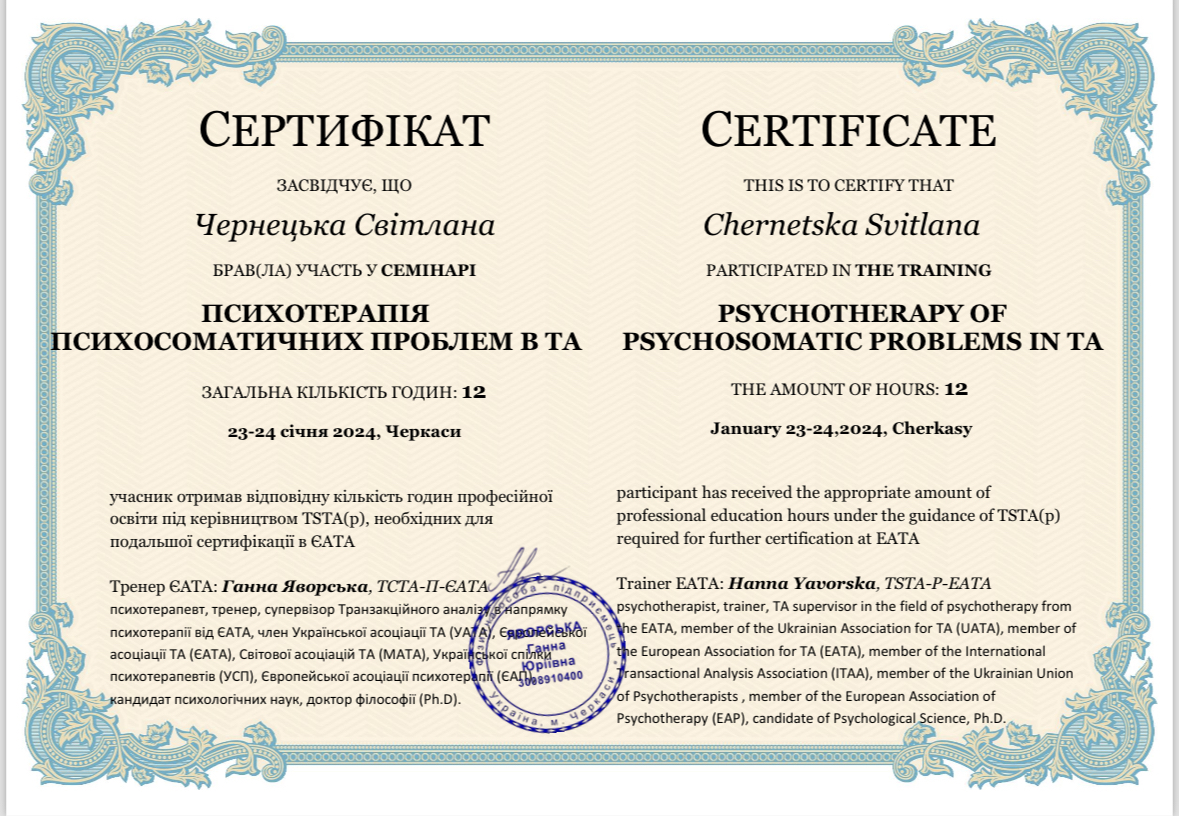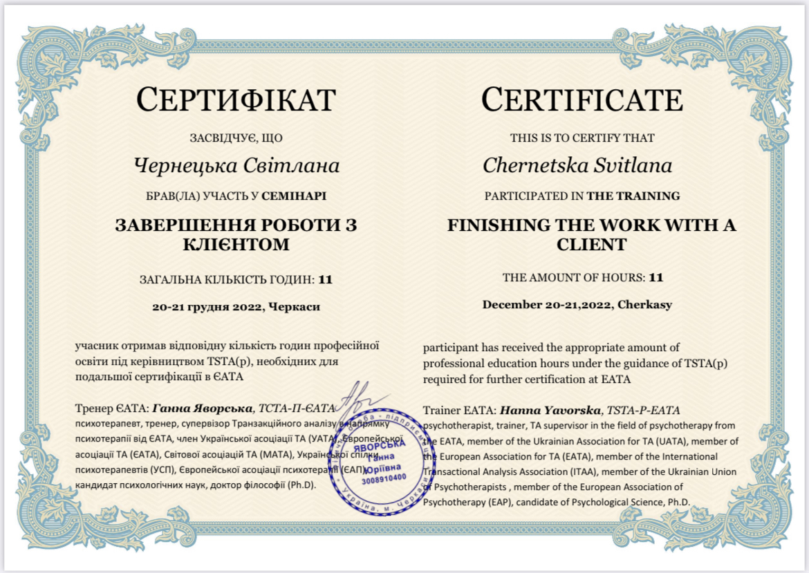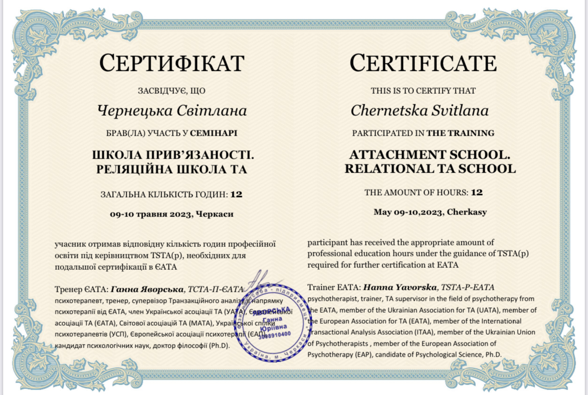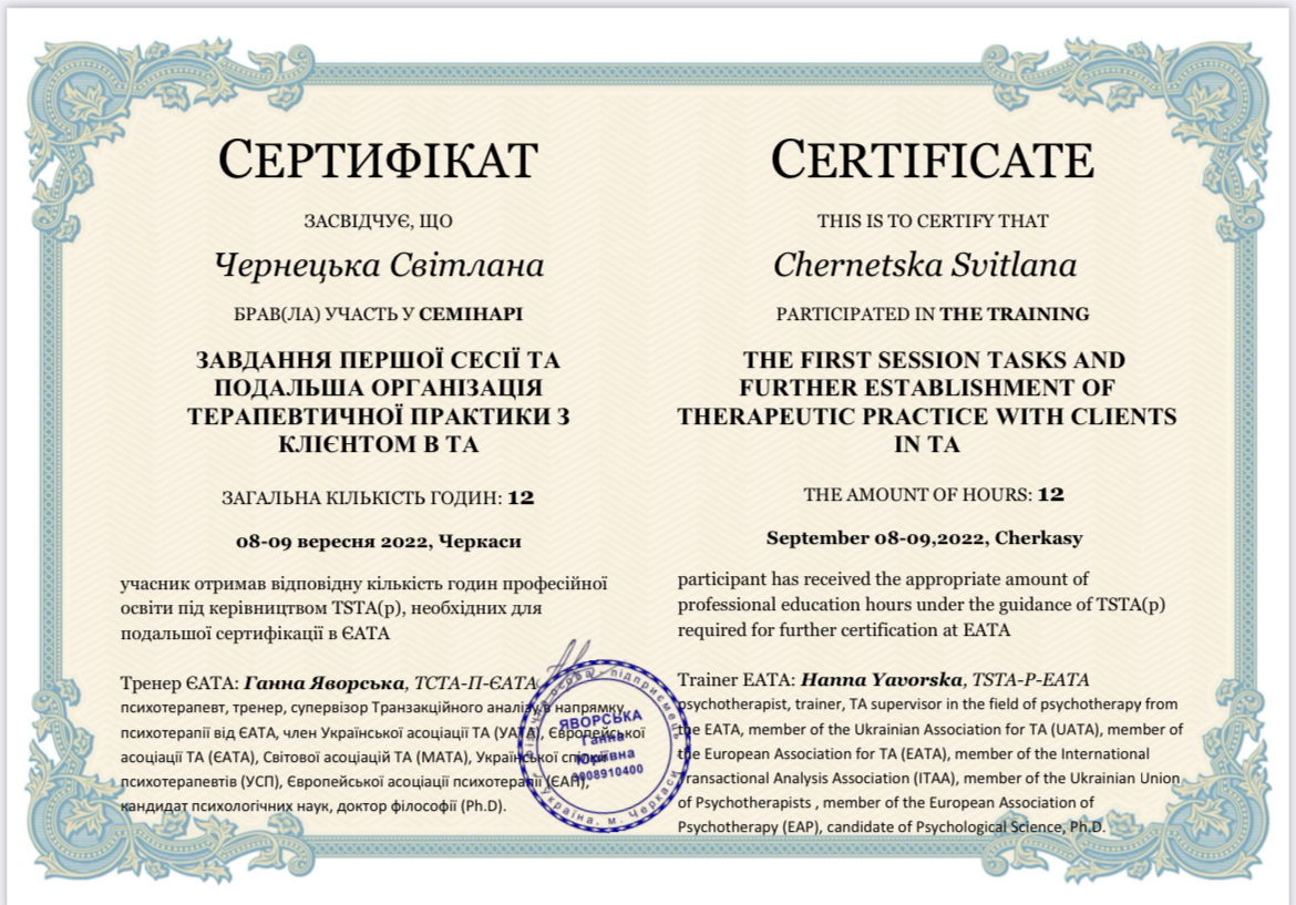 * Психолог-практик в психотерапевтическом методе транзакционного анализа. Профессиональное 4-летнее образование, член Европейской Ассоциации транзакционного анализа (EATA), член Украинской ассоциации транзакционного анализа (UATA), член Национальной психологической ассоциации (NPA).